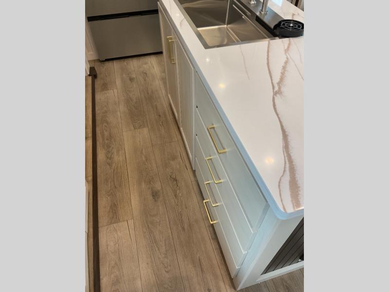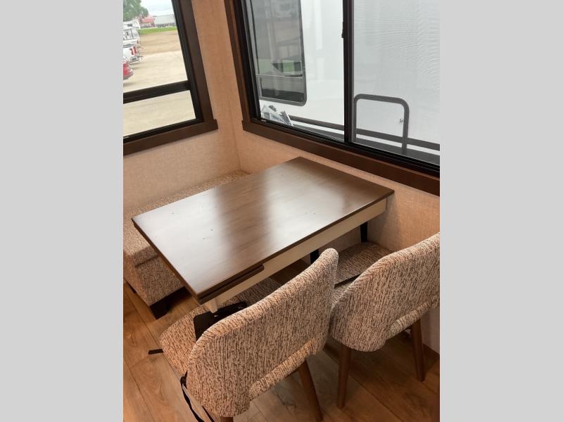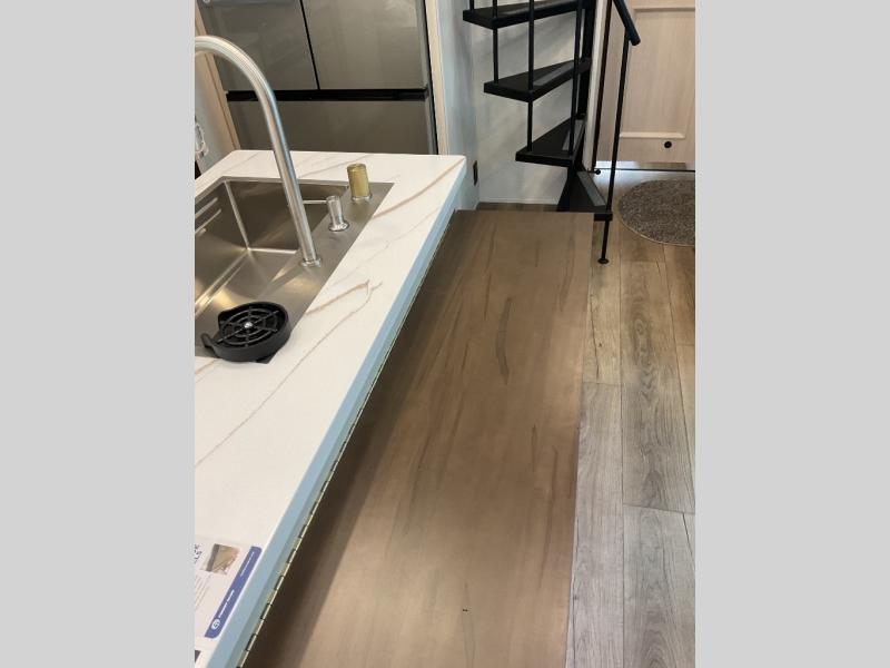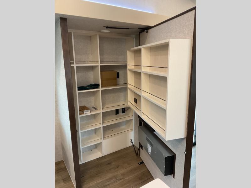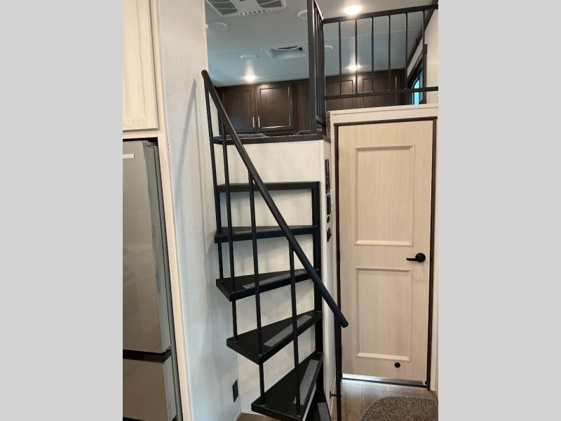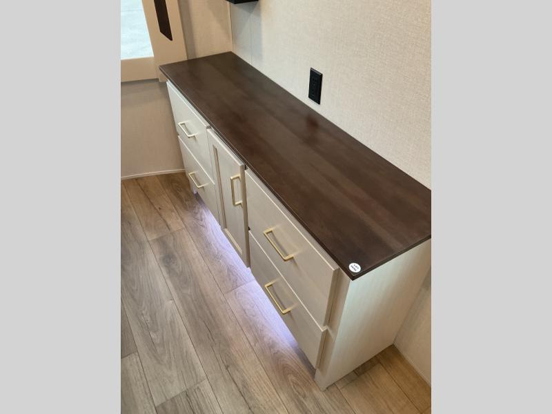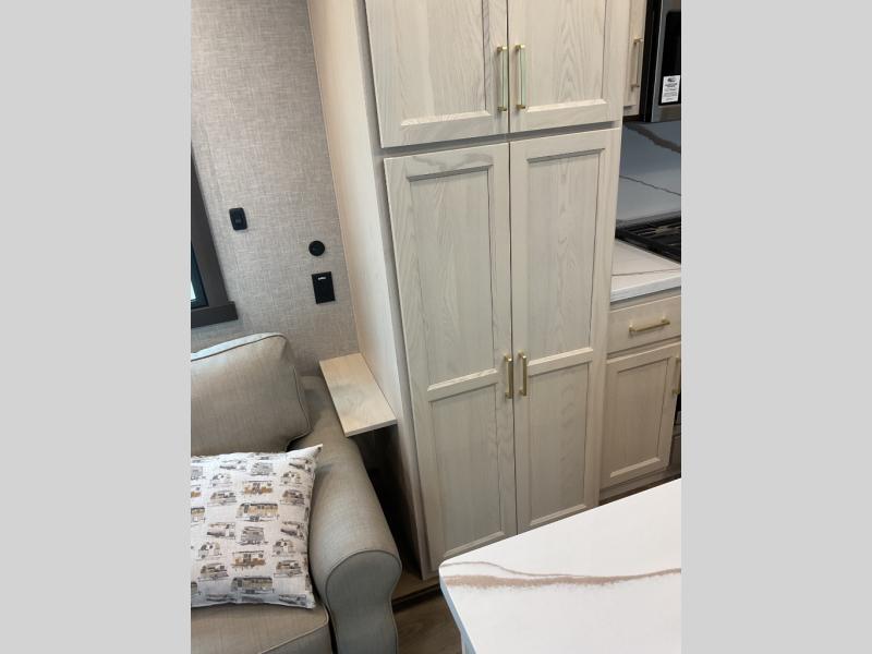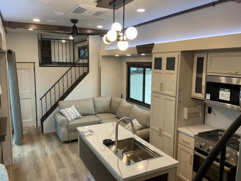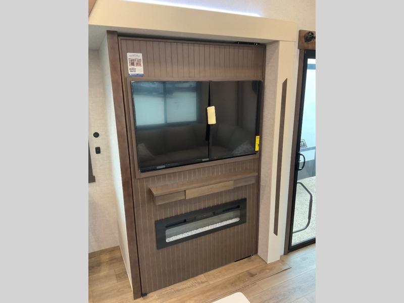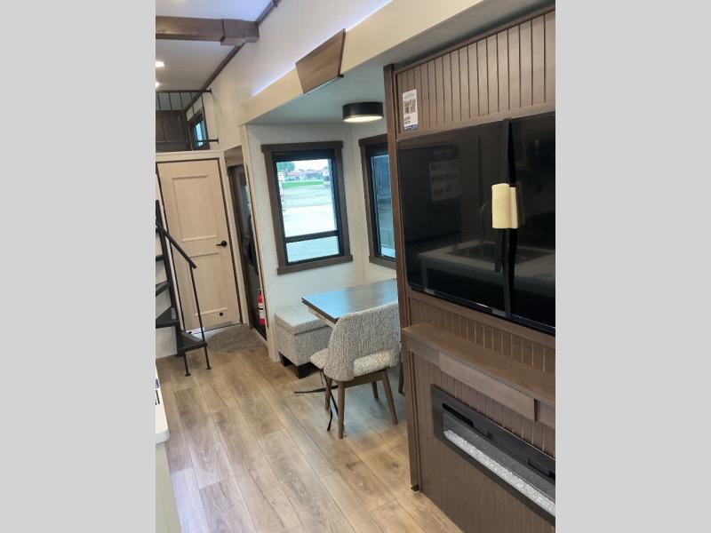 A front and rear loft plus master bedroom offer three different sleeping spaces that you and your family or guests will enjoy. The front master offers a king bed slide, plus two dressers and a wardrobe for clothing. There is also a 32" TV as well. The main combined living and kitchen area features a large L-shaped sectional sofa opposite a swivel mount Smart TV and fireplace mounted on the exterior door that hides a Murphy pantry. The kitchen is fully equipped for all of your cooking needs with a 30" stainless steel microwave, a 12V 18 cu. ft. refrigerator, and an island with fold-down breakfast counter. There is also a free standing dinette with an extension and an ottoman.