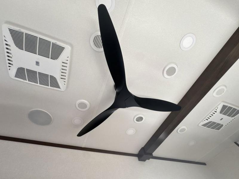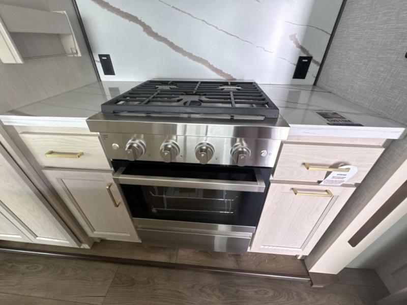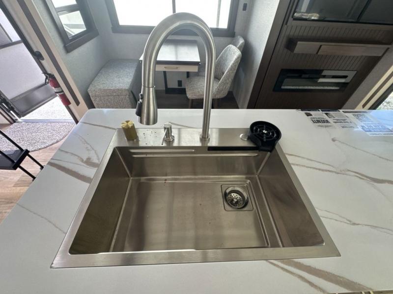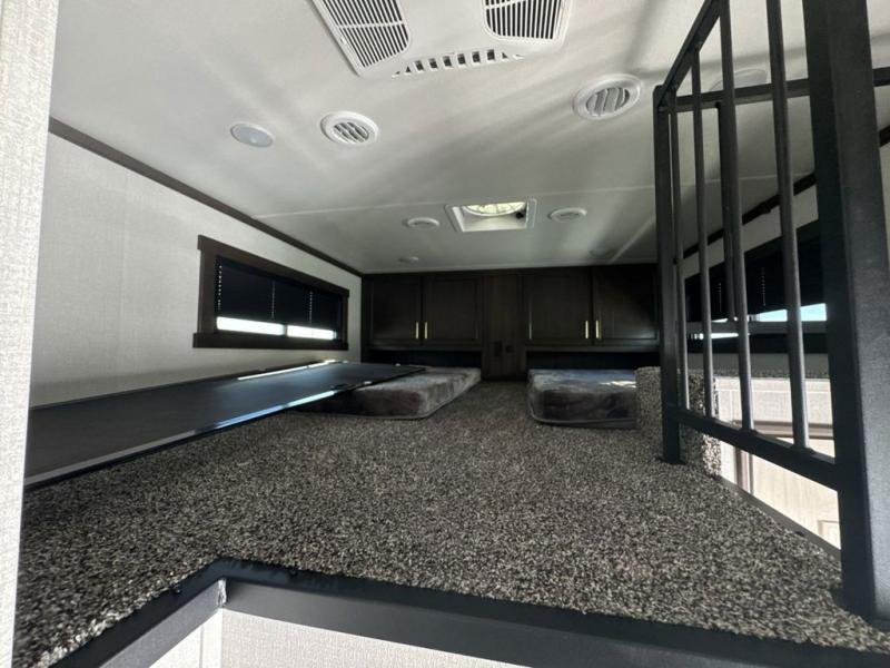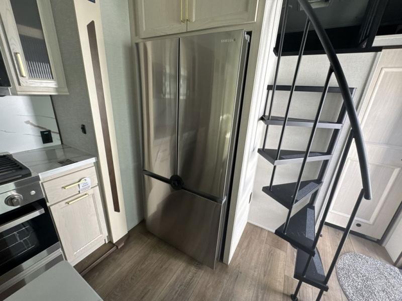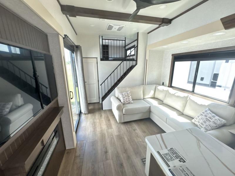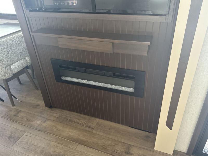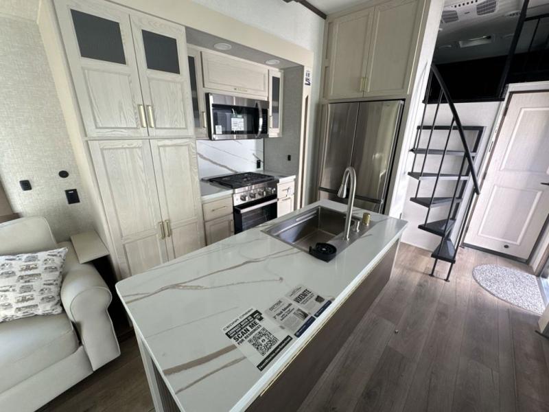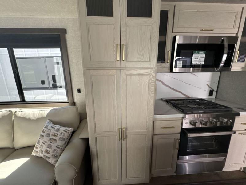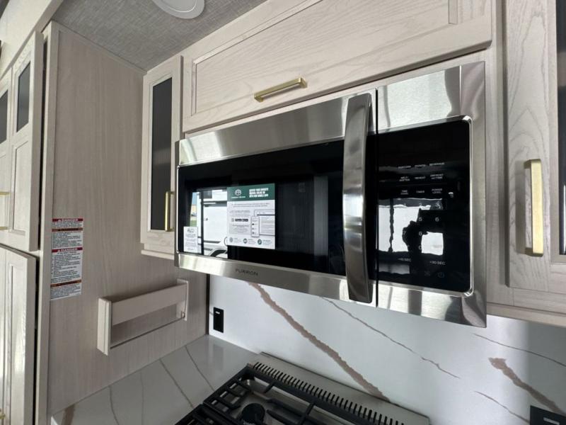 A front and rear loft plus master bedroom offer three different sleeping spaces that you and your family or guests will enjoy. The front master offers a king bed slide, plus two dressers and a wardrobe for clothing. There is also a 32" TV as well. The main combined living and kitchen area features a large L-shaped sectional sofa opposite a swivel mount Smart TV and fireplace mounted on the exterior door that hides a Murphy pantry. The kitchen is fully equipped for all of your cooking needs with a 30" stainless steel microwave, a 12V 18 cu. ft. refrigerator, and an island with fold-down breakfast counter. There is also a free standing dinette with an extension and an ottoman.