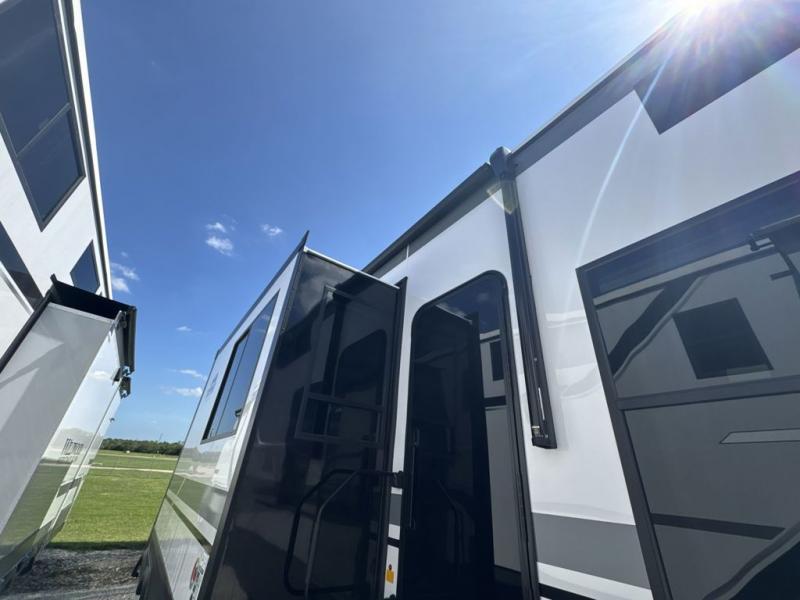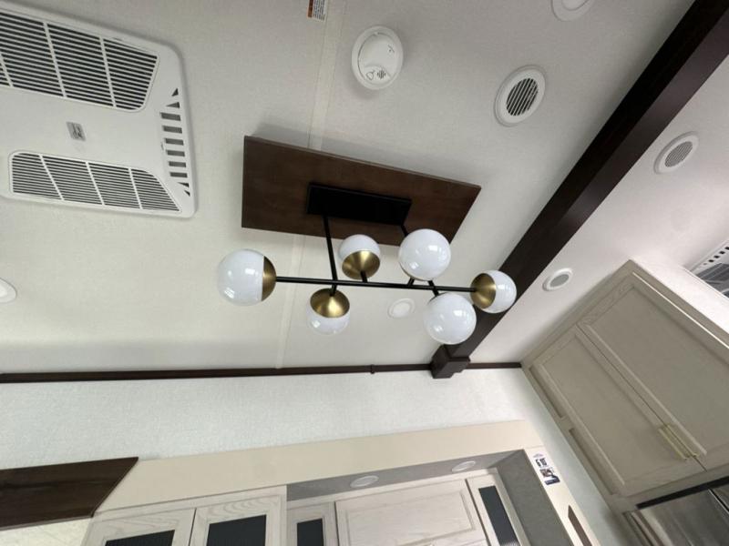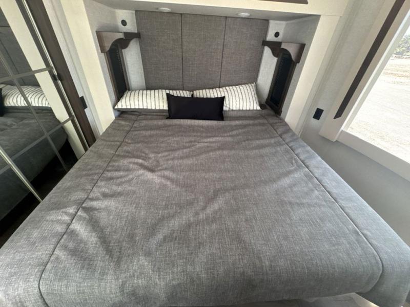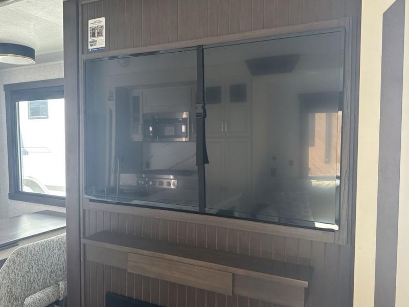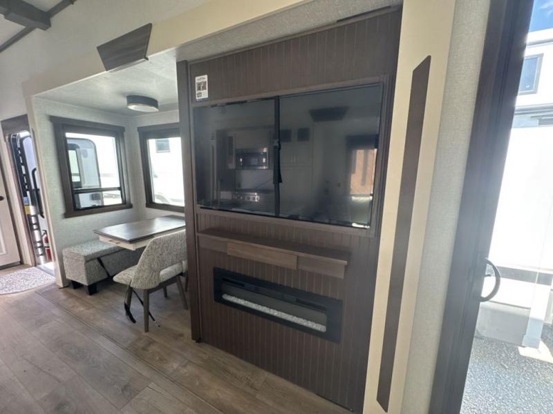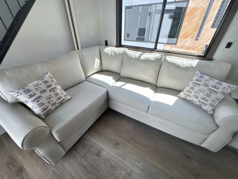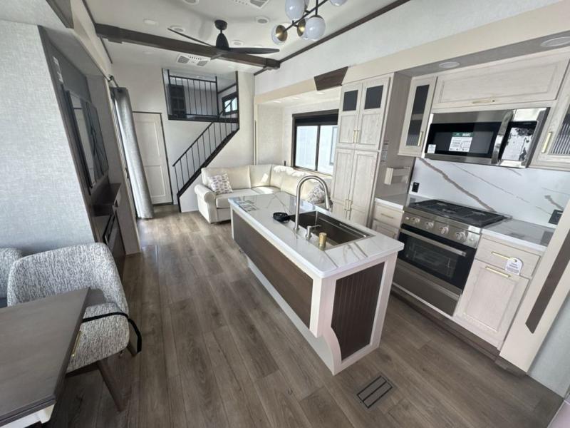 A front and rear loft plus master bedroom offer three different sleeping spaces that you and your family or guests will enjoy. The front master offers a king bed slide, plus two dressers and a wardrobe for clothing. There is also a 32" TV as well. The main combined living and kitchen area features a large L-shaped sectional sofa opposite a swivel mount Smart TV and fireplace mounted on the exterior door that hides a Murphy pantry. The kitchen is fully equipped for all of your cooking needs with a 30" stainless steel microwave, a 12V 18 cu. ft. refrigerator, and an island with fold-down breakfast counter. There is also a free standing dinette with an extension and an ottoman.