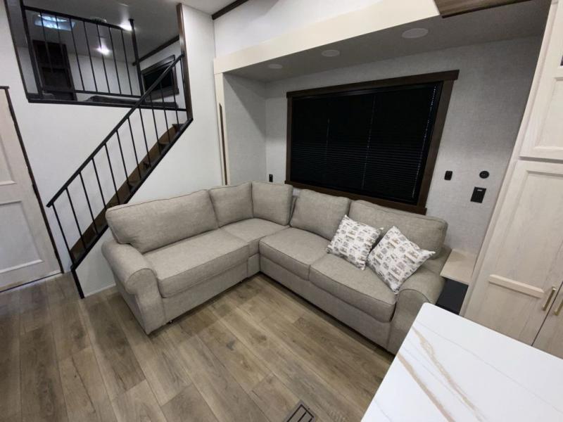 A front and rear loft plus master bedroom offer three different sleeping spaces that you and your family or guests will enjoy. The front offers a king bed slide, a dresser and front seating that is perfect to add comfort so you can relax or read your favorite book! There is also a TV as well. The main combined living and kitchen area features a large L-shaped sectional sofa opposite a swivel mount Smart TV and fireplace mounted on the exterior door that hides a Murphy pantry. The kitchen is fully equipped for all of your cooking needs with a 30" stainless steel microwave, a 110V 20 cu. ft. refrigerator, and an island. There is also a free standing dinette with an extension and an ottoman.
