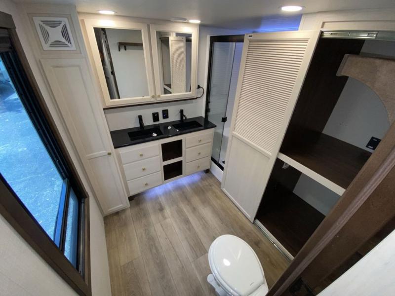 With any Cedar Creek Cottage destination trailer by Forest River, you can enjoy extended stays with residential features at the location of your choice! Each model is built with 3M bonded sidewalls that grow stronger with age and are resistant to UV, heat, oil, moisture, and more. There is also an AlphaPly TPO roof membrane, and new waterproof and bug proof Vixenite slide room floor panels for added durability. Head inside where you'll find residential dovetail, self-closing drawers, flush floor slides in the kitchen and living area, a residential style headboard and luxurious bedding decor, and extra storage for linens in the bedroom and bath.