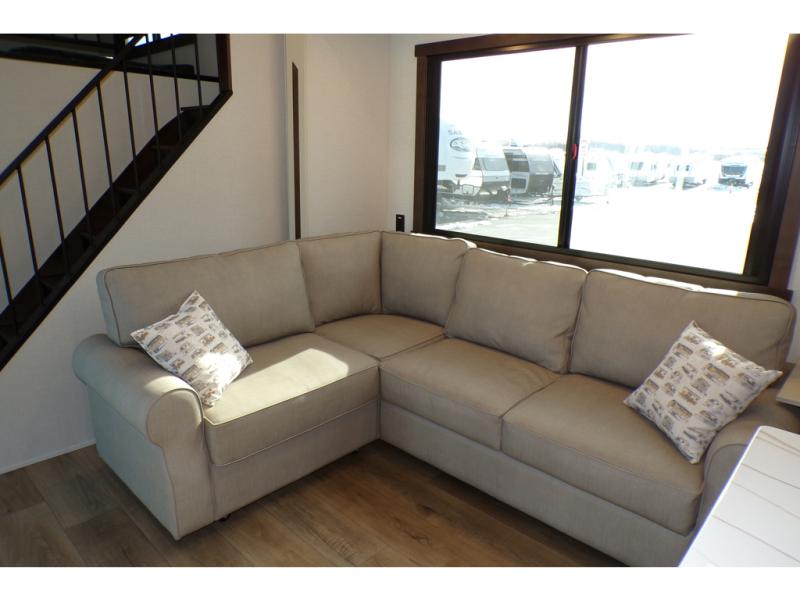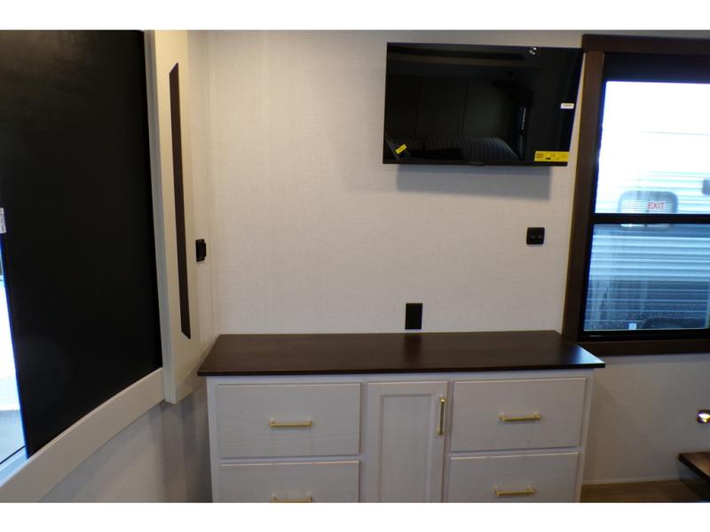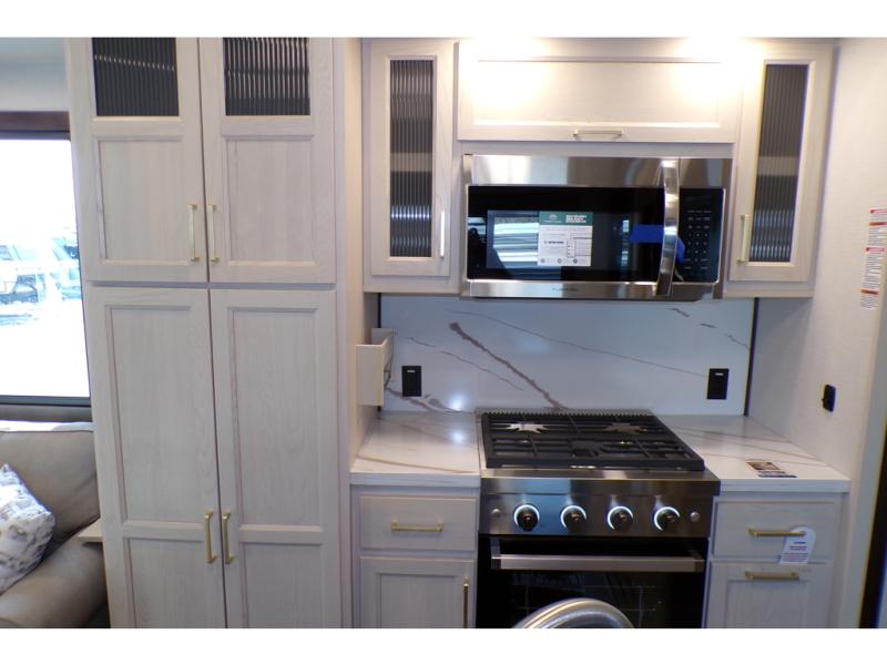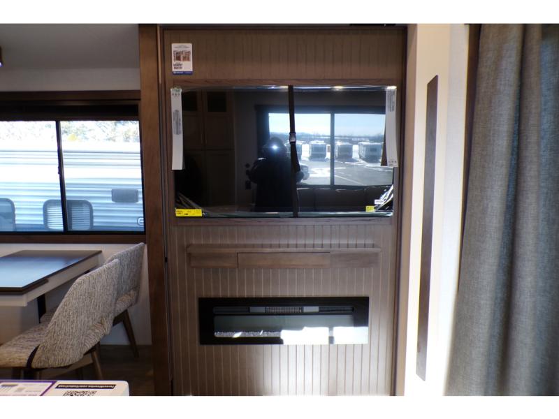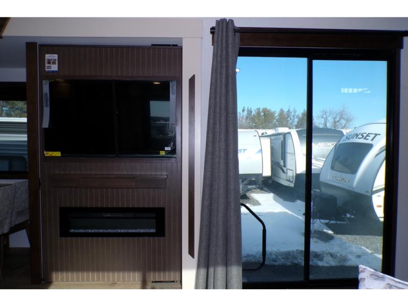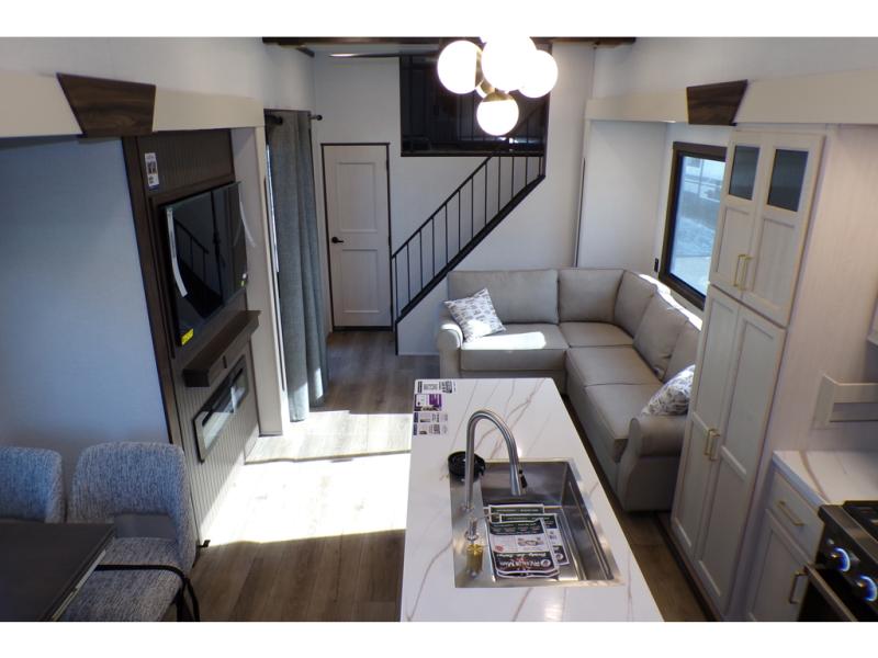 A front and rear loft plus master bedroom offer three different sleeping spaces that you and your family or guests will enjoy. The front offers a king bed slide, a dresser and front seating that is perfect to add comfort so you can relax or read your favorite book! There is also a TV as well. The main combined living and kitchen area features a large L-shaped sectional sofa opposite a swivel mount Smart TV and fireplace mounted on the exterior door that hides a Murphy pantry. The kitchen is fully equipped for all of your cooking needs with a 30" stainless steel microwave, a 110V 20 cu. ft. refrigerator, and an island. There is also a free standing dinette with an extension and an ottoman.