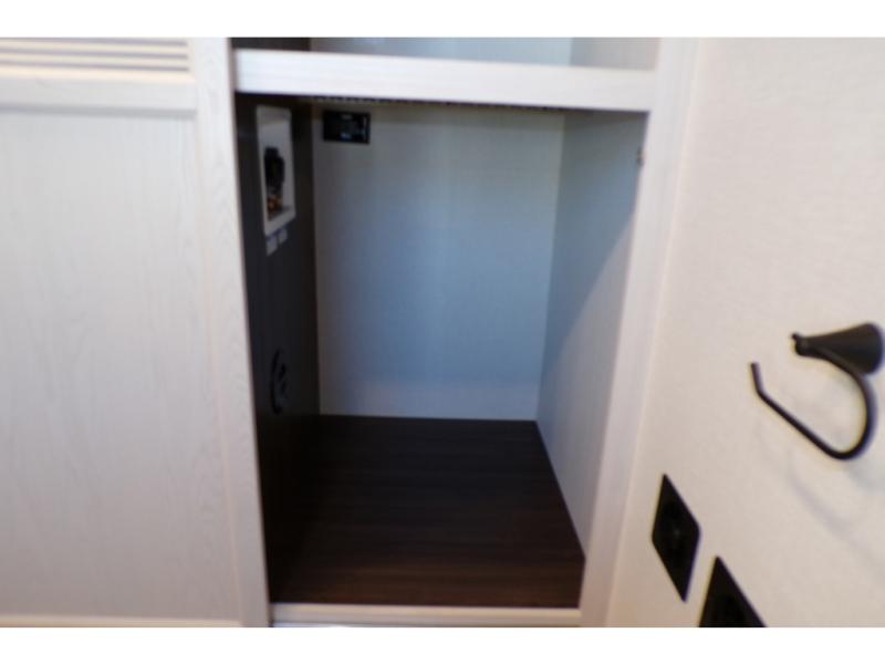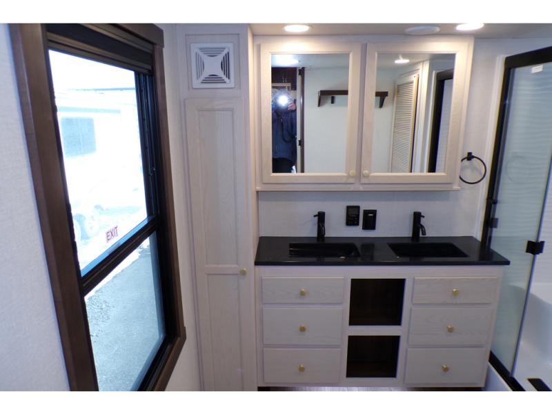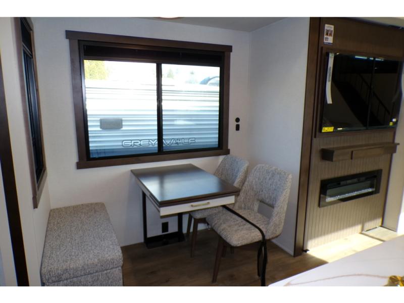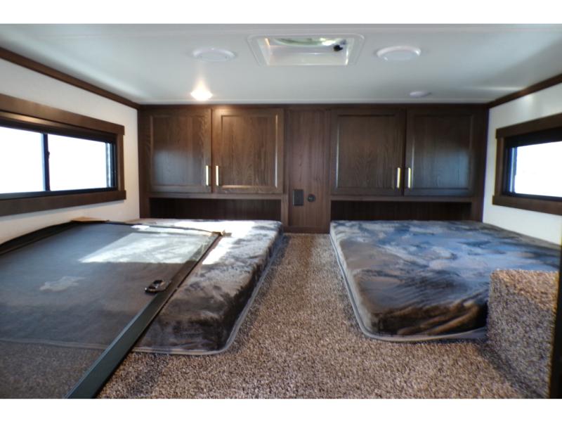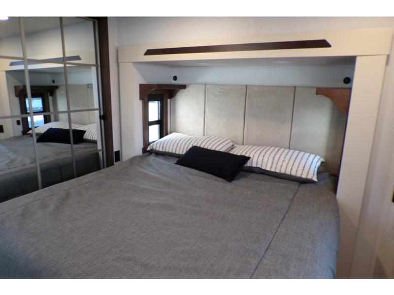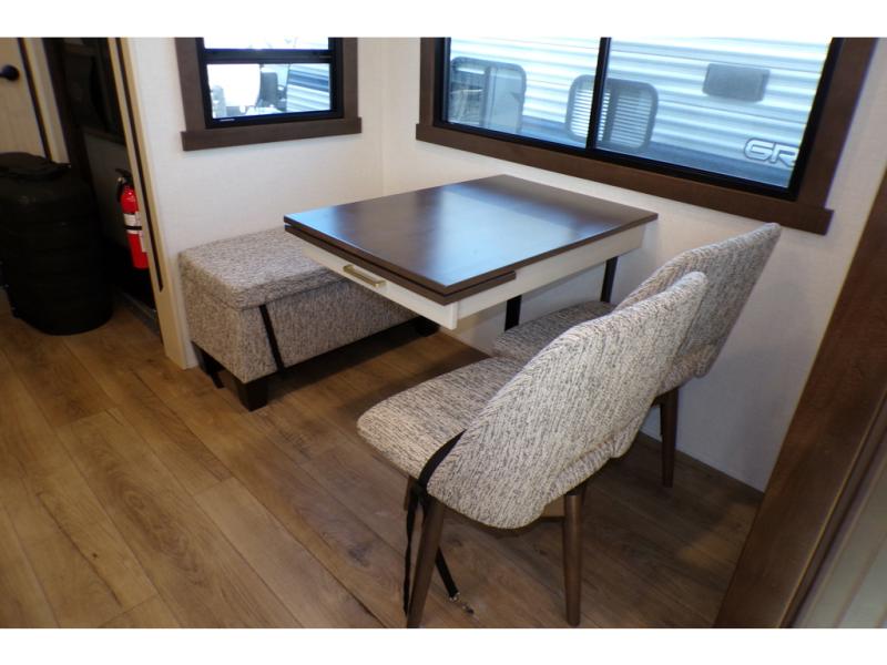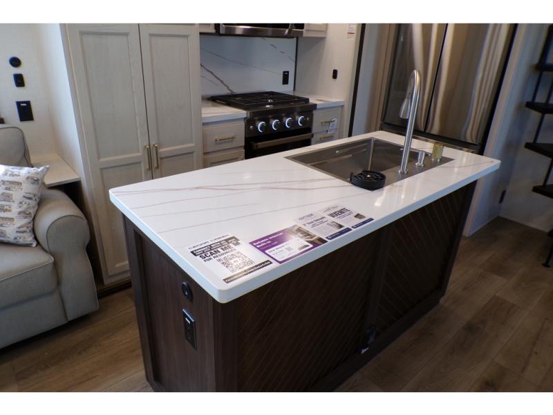 A front and rear loft plus master bedroom offer three different sleeping spaces that you and your family or guests will enjoy. The front offers a king bed slide, a dresser and front seating that is perfect to add comfort so you can relax or read your favorite book! There is also a TV as well. The main combined living and kitchen area features a large L-shaped sectional sofa opposite a swivel mount Smart TV and fireplace mounted on the exterior door that hides a Murphy pantry. The kitchen is fully equipped for all of your cooking needs with a 30" stainless steel microwave, a 110V 20 cu. ft. refrigerator, and an island. There is also a free standing dinette with an extension and an ottoman.