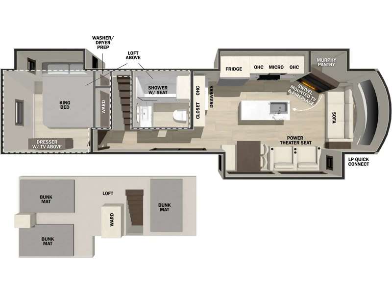 The star feature of this Cedar Creek Cottage destination trailer is the huge loft area. Take the stairs up to the loft to see the three bunk mats and wardrobe. There is also a railing that prevents anyone from falling off the edge. The rear private bedroom offers you another sleeping area with a king bed slide for the most comfort, and there is also a six-drawer dresser that you can use to store your socks and t-shirts. The full bathroom comes with a 30" x 48" fiberglass shower with seat, a bath towel rack, a toilet paper holder, a large, mirrored medicine cabinet with overhead makeup lights, and a linen closet, and the kitchen is also fully equipped with a full pantry, a one-piece backsplash, a Create-A-Breeze Fantastic Fan with thermostat and rain sensor, a stainless steel 30” over-the-range microwave with built-in vent, and crown molding that complements all overhead cabinets.