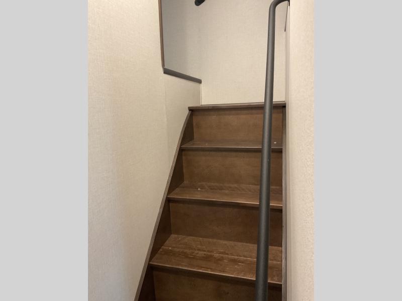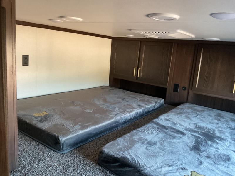 The star feature of this Cedar Creek Cottage destination trailer is the huge loft area. Take the stairs up to the loft to see the three bunk mats and wardrobe. There is also a railing that helps prevent anyone from falling off the edge. The rear private bedroom offers you a king bed slide for the most comfort, and there is also a dresser that you can use to store clothing in. The full bathroom comes with a 30" x 48" fiberglass shower with seat, a large, and a linen closet. You will also have a fully equipped kitchen featuring a pantry, 18 cu. ft. 12-volt refrigerator, 30” stainless over-the-range microwave, and a beautiful island with a sink and fold-down breakfast counter.