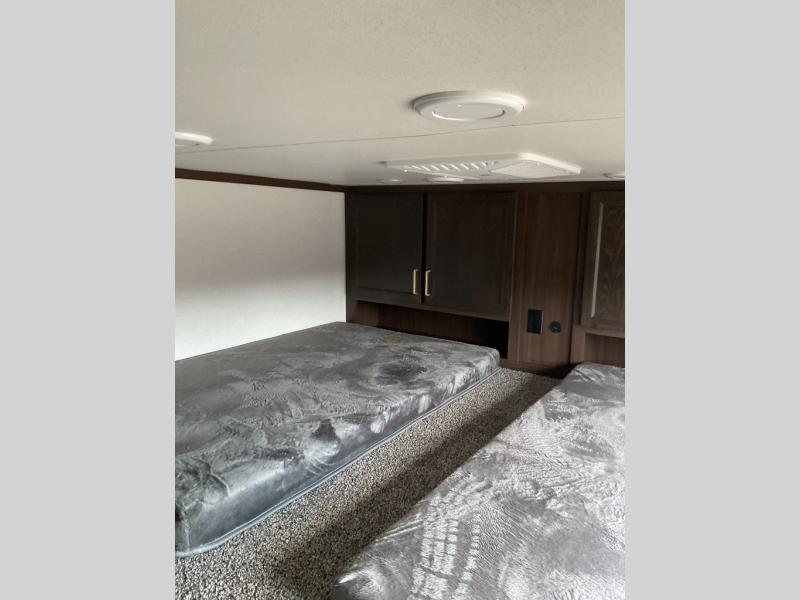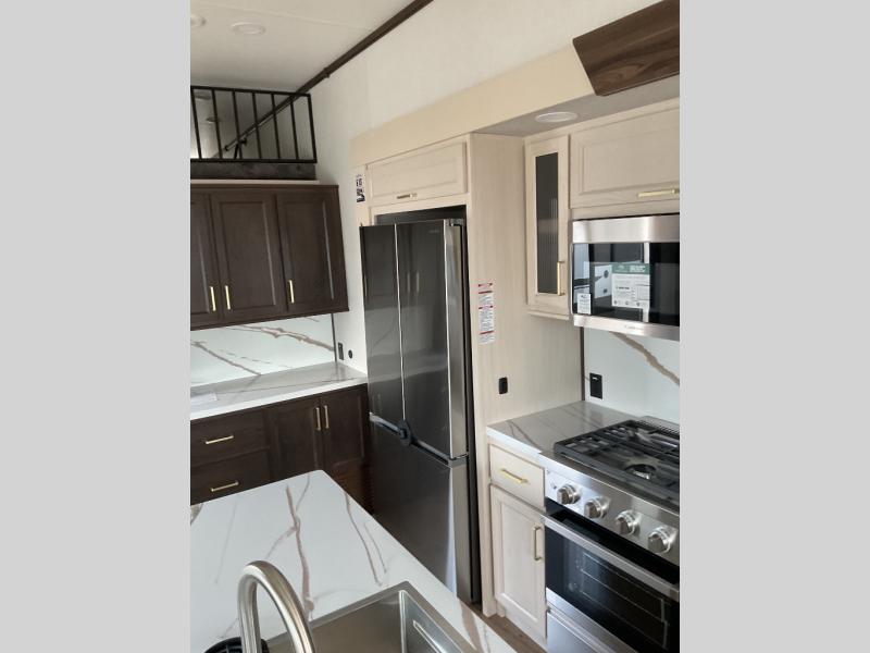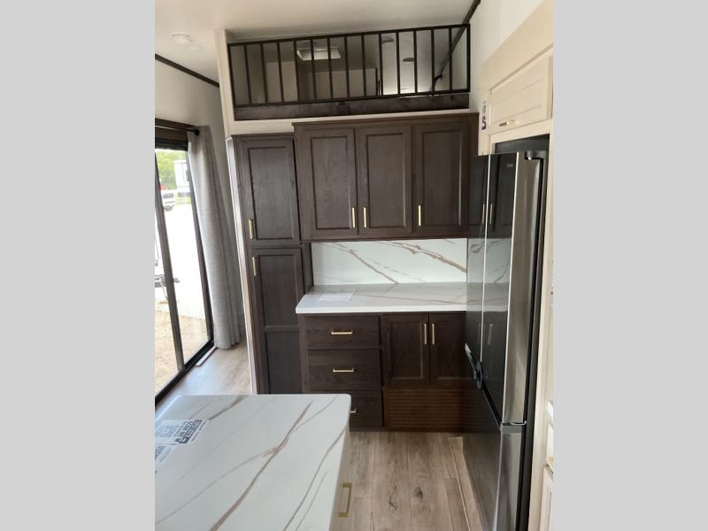 The star feature of this Cedar Creek Cottage destination trailer is the huge loft area. Take the stairs up to the loft to see the three bunk mats and wardrobe. There is also a railing that helps prevent anyone from falling off the edge. The rear private bedroom offers you a king bed slide for the most comfort, and there is also a dresser that you can use to store clothing in. The full bathroom comes with a 30" x 48" fiberglass shower with seat, a large, and a linen closet. You will also have a fully equipped kitchen featuring a pantry, 18 cu. ft. 12-volt refrigerator, 30” stainless over-the-range microwave, and a beautiful island with a sink and fold-down breakfast counter.