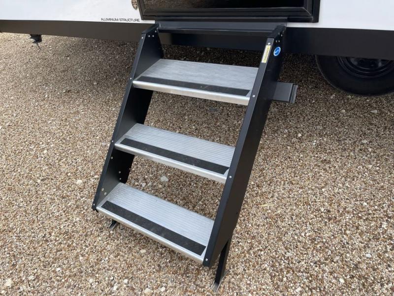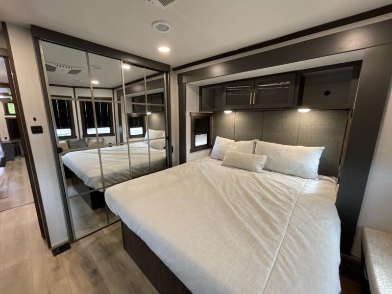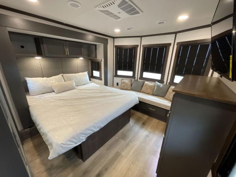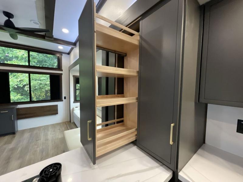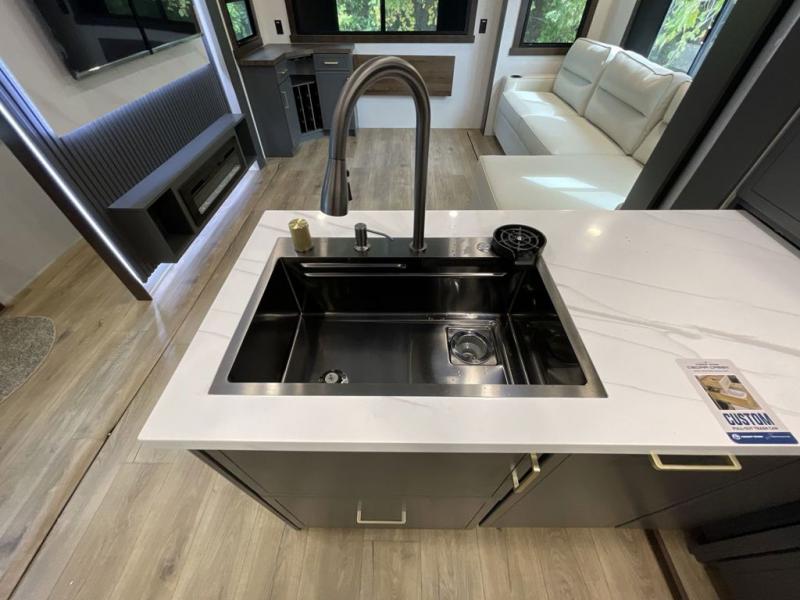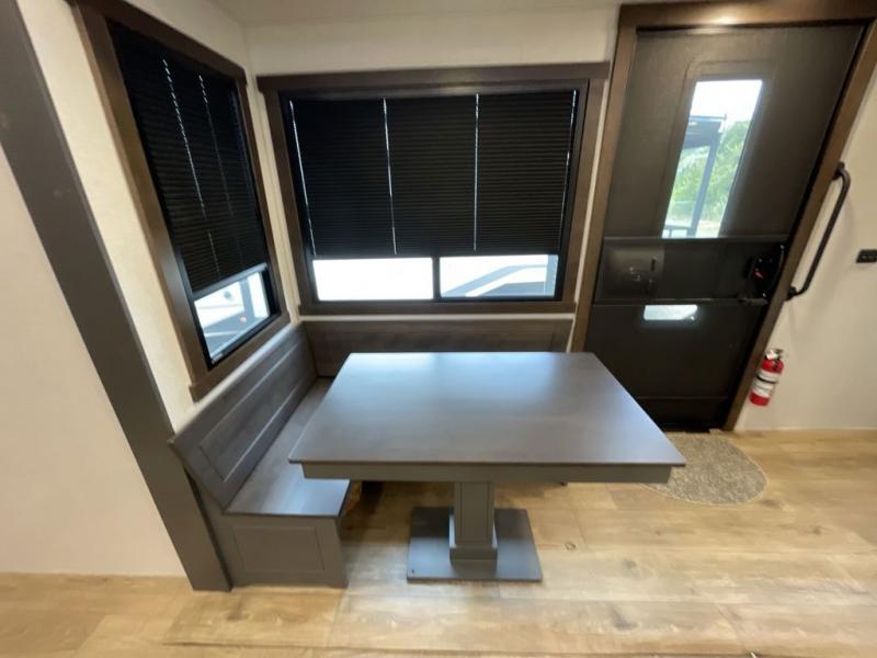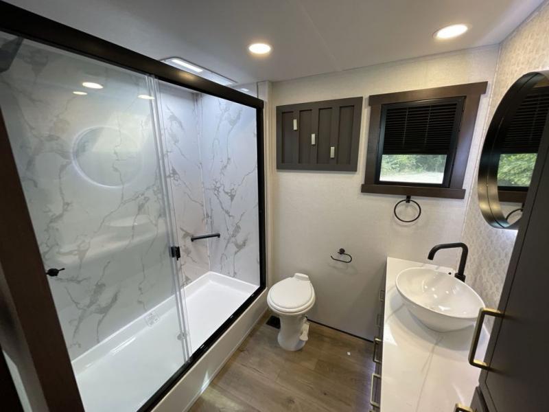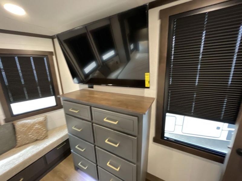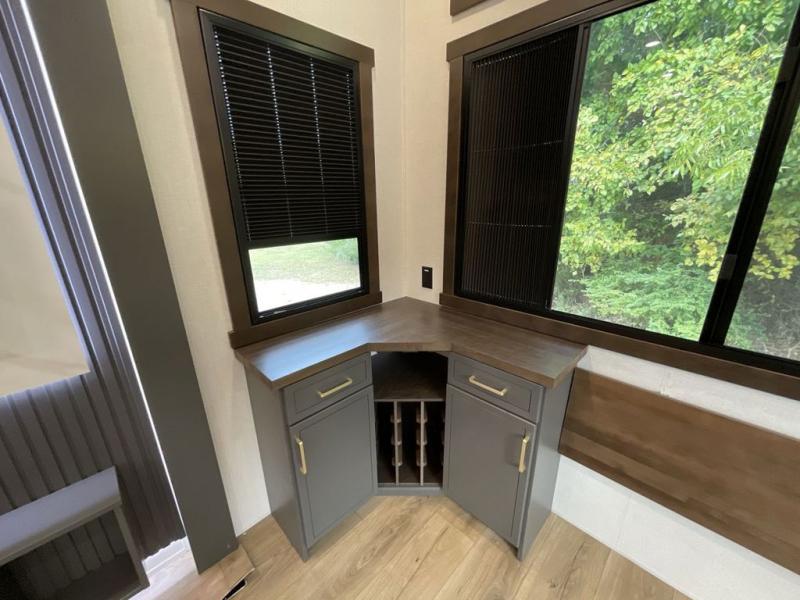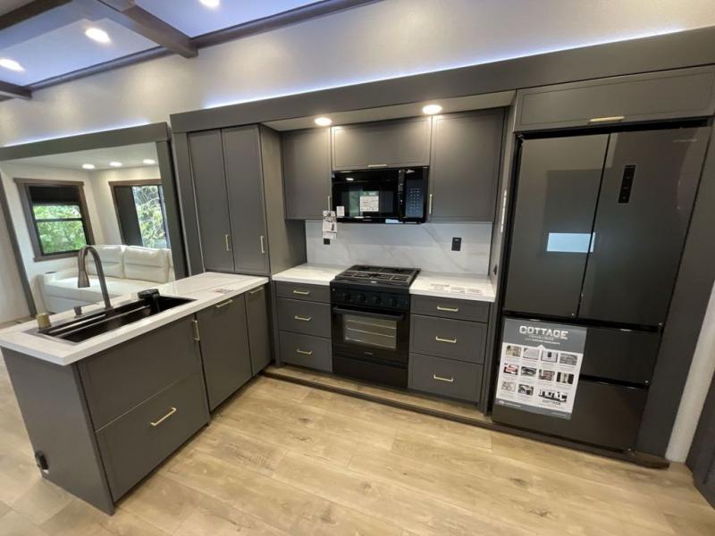 Hop on new adventures with the Forest River Cedar Creek Cottage Fifth Wheels! Each destination fifth wheel features a 101" wide body frame that provides a sturdy foundation for your adventures, while the AlphaPly TPO roof membrane offers superior durability and weather resistance. Plus, the 3M Bonded Sidewalls add an extra layer of protection and strength, and the hydraulic front jacks make setting up camp a breeze. In the luxurious interiors, the vinyl floor covering is easy to clean, and the Vixeinite flush floor slides in the kitchen and living area provide a seamless transition between the floor and the slide-outs. In addition, the 52" ceiling fan in the living room circulates air and adds to the spacious feel, and the kitchen island is a standout feature, boasting a solid surface counter, a flush-mount sink, and a stainless-steel design. You'll feel like you're cooking at home! Finally, the USB ports in the bathroom ensure you can keep your devices charged and within reach, even in the most convenient places.