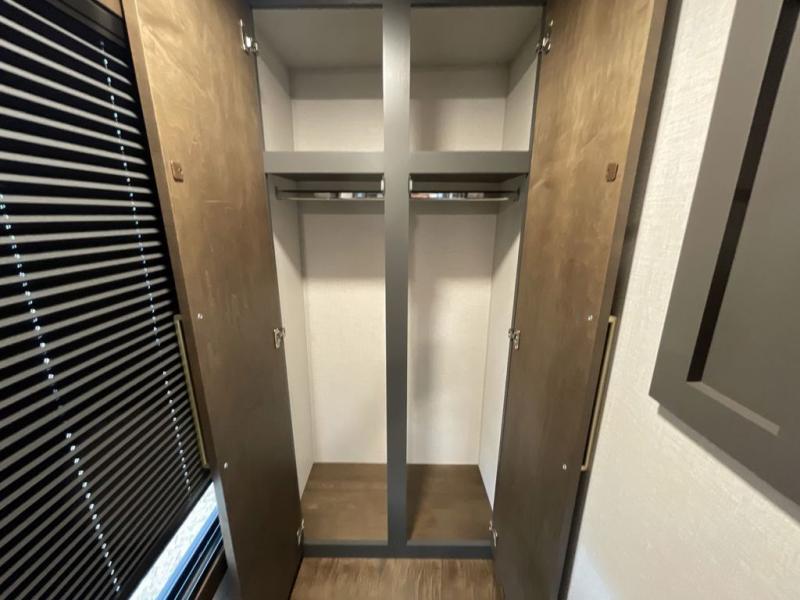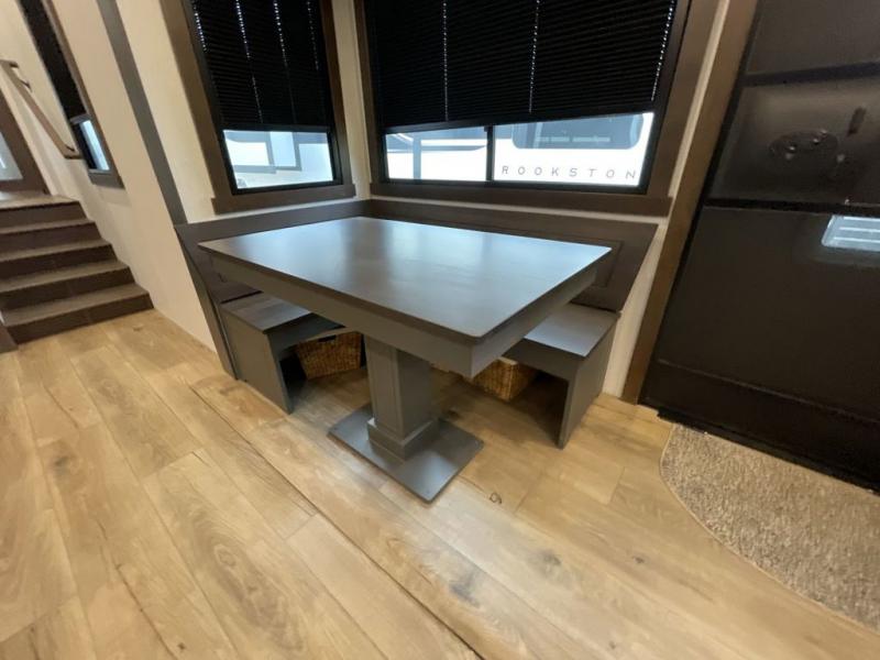The rear living room is a spacious retreat, featuring a comfortable sectional sofa and a flip desk perfect for working or relaxing. Unwind with a glass of wine at the wine bar, or cozy up by the fireplace while enjoying your favorite show on the TV. The mud room is a practical and convenient feature, perfect for storing gear, boots, and jackets. The kitchen is fully equipped with overhead cabinets, a microwave, a refrigerator, and a table with swivel chairs, providing a comfortable spot to enjoy meals with family and friends. The full bathroom features an ample shower, providing plenty of space to get ready for the day, while the front bedroom is the perfect spot to relax and recharge after a long day of exploring, featuring a king bed, closet, and dresser.