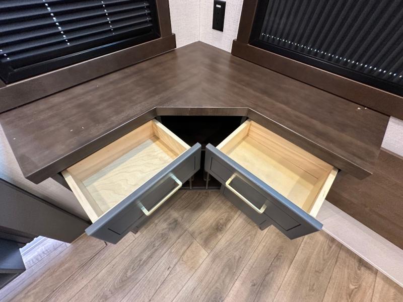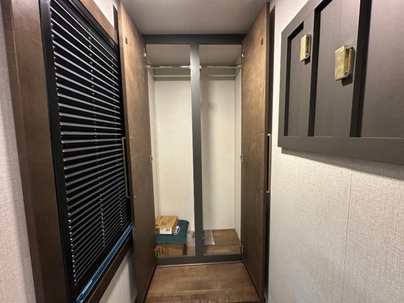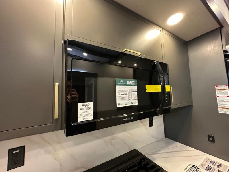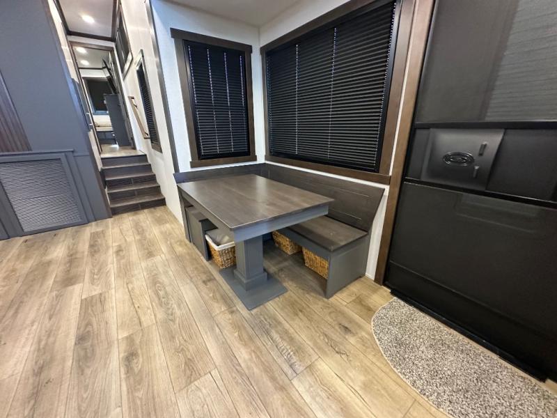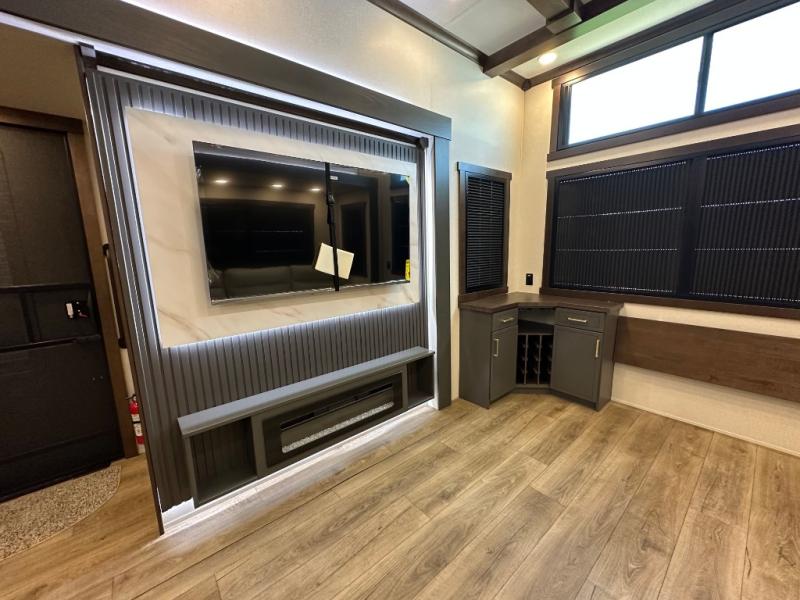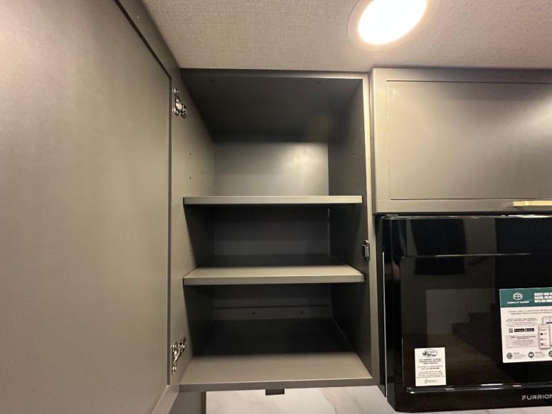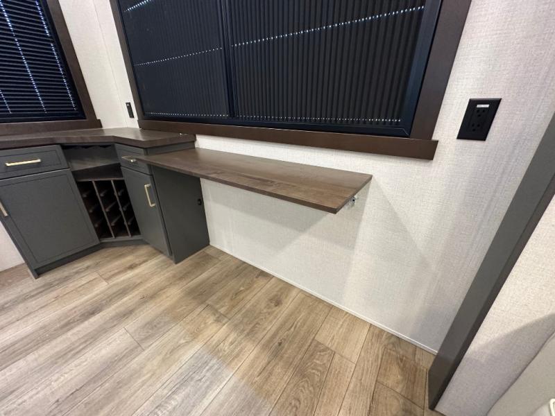 The rear living room is a spacious retreat, featuring a comfortable sectional sofa and a flip desk perfect for working or relaxing. Unwind with a glass of wine at the wine bar, or cozy up by the fireplace while enjoying your favorite show on the TV. The mud room is a practical and convenient feature, perfect for storing gear, boots, and jackets. The kitchen is fully equipped with overhead cabinets, a microwave, a refrigerator, and a table with swivel chairs, providing a comfortable spot to enjoy meals with family and friends. The full bathroom features an ample shower, providing plenty of space to get ready for the day, while the front bedroom is the perfect spot to relax and recharge after a long day of exploring, featuring a king bed, closet, and dresser.