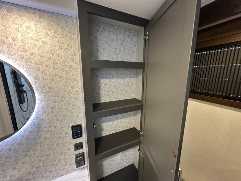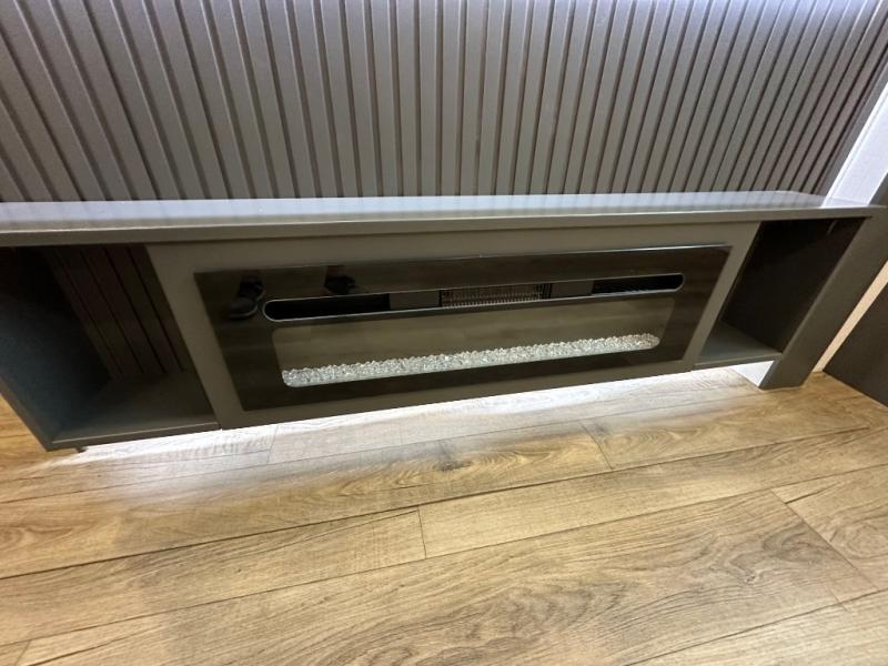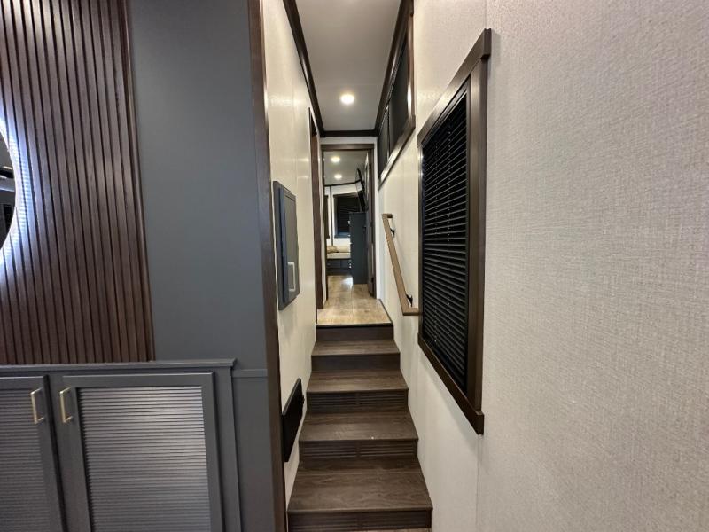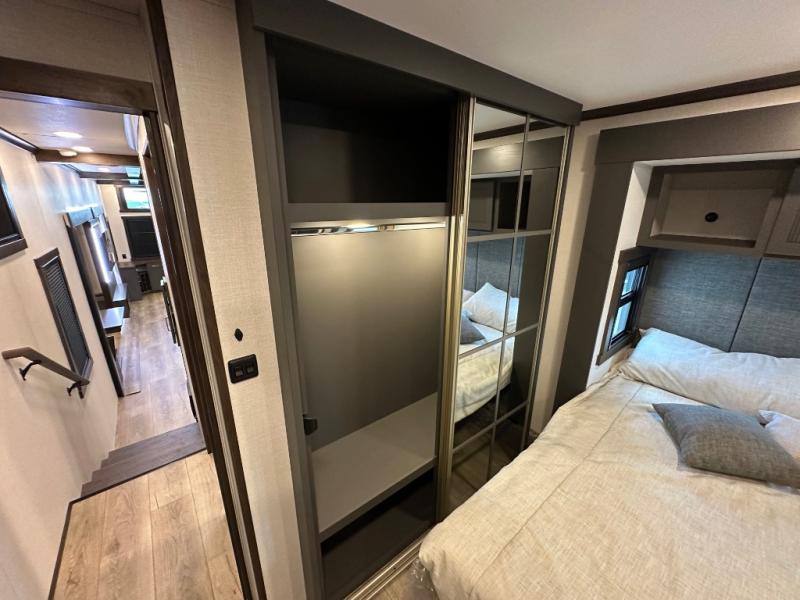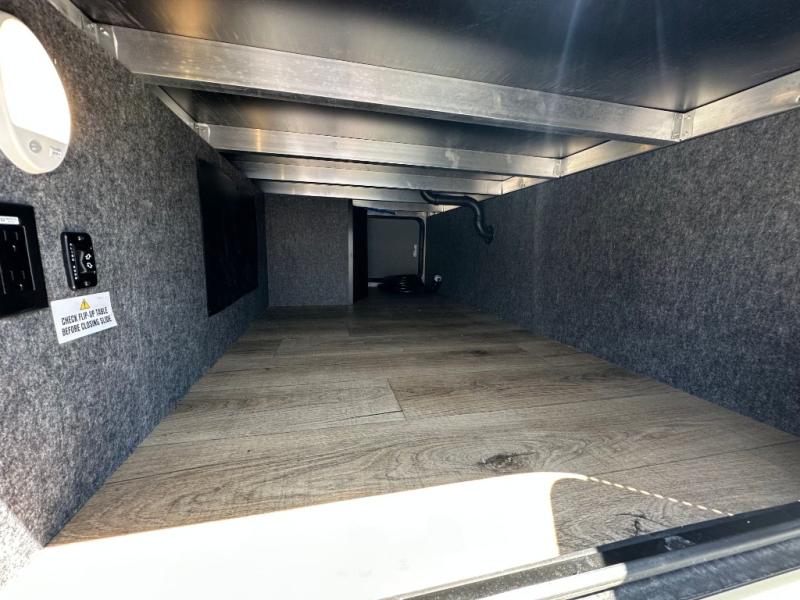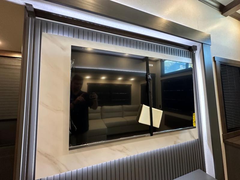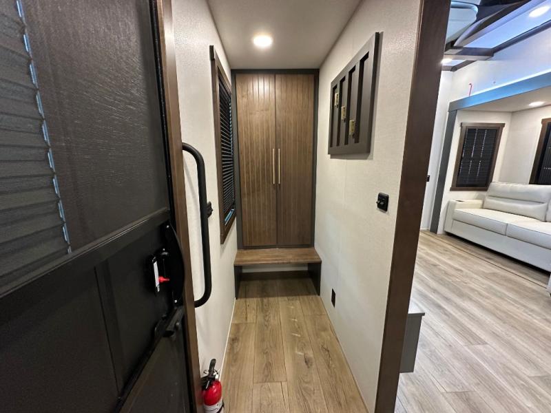 The rear living room is a spacious retreat, featuring a comfortable sectional sofa and a flip desk perfect for working or relaxing. Unwind with a glass of wine at the wine bar, or cozy up by the fireplace while enjoying your favorite show on the TV. The mud room is a practical and convenient feature, perfect for storing gear, boots, and jackets. The kitchen is fully equipped with overhead cabinets, a microwave, a refrigerator, and a table with swivel chairs, providing a comfortable spot to enjoy meals with family and friends. The full bathroom features an ample shower, providing plenty of space to get ready for the day, while the front bedroom is the perfect spot to relax and recharge after a long day of exploring, featuring a king bed, closet, and dresser.