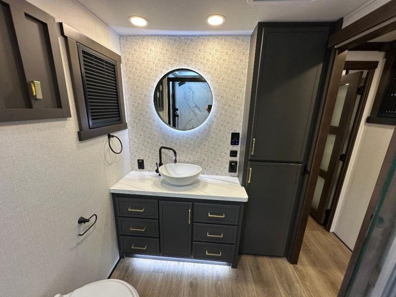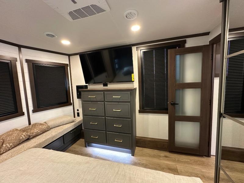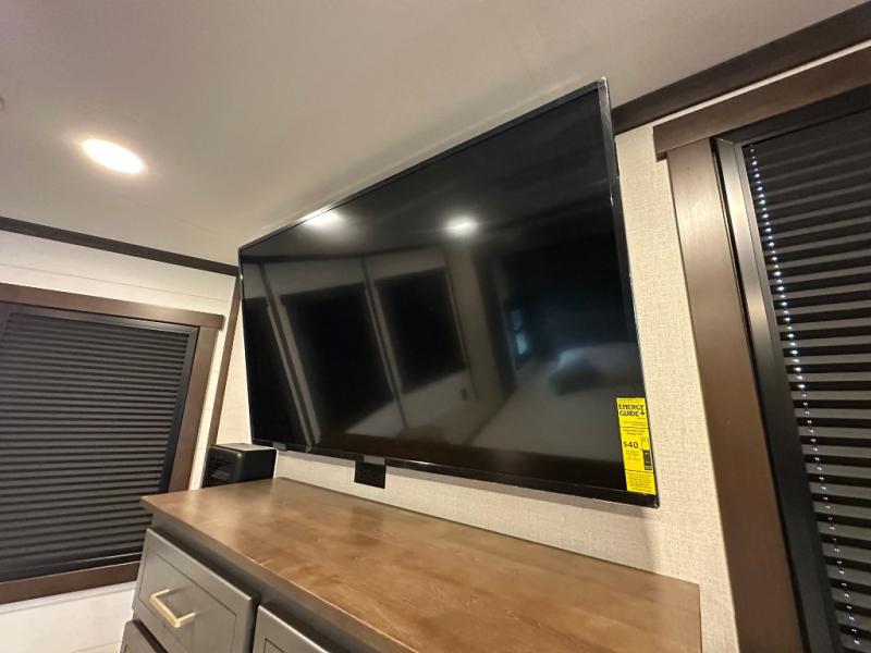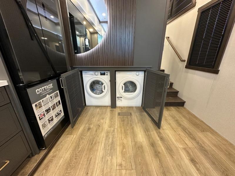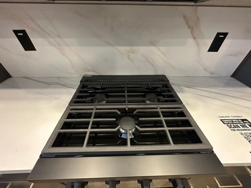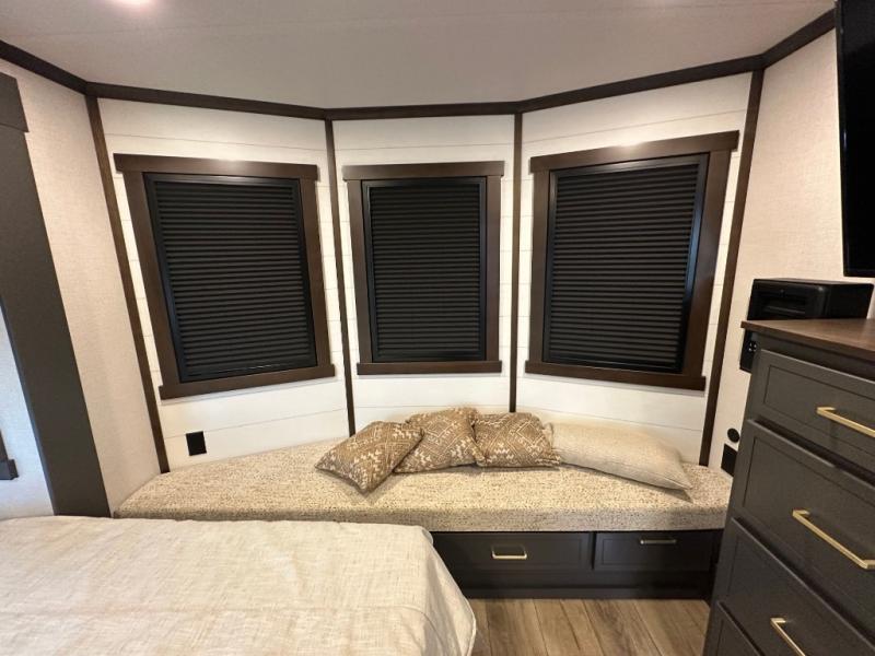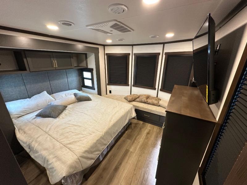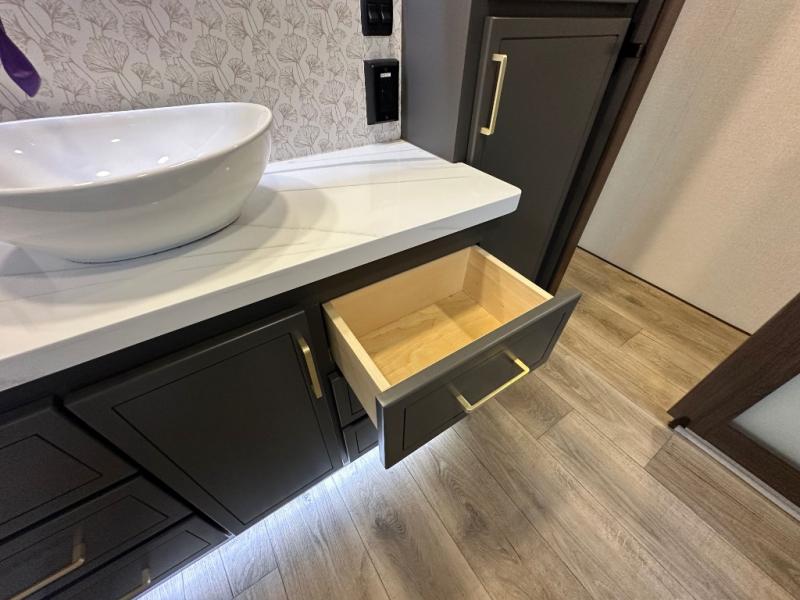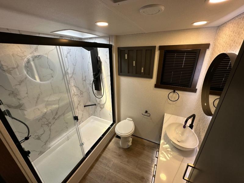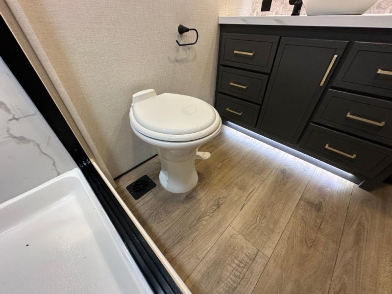 Hop on new adventures with the Forest River Cedar Creek Cottage Fifth Wheels! Each destination fifth wheel features a 101" wide body frame that provides a sturdy foundation for your adventures, while the AlphaPly TPO roof membrane offers superior durability and weather resistance. Plus, the 3M Bonded Sidewalls add an extra layer of protection and strength, and the hydraulic front jacks make setting up camp a breeze. In the luxurious interiors, the vinyl floor covering is easy to clean, and the Vixeinite flush floor slides in the kitchen and living area provide a seamless transition between the floor and the slide-outs. In addition, the 52" ceiling fan in the living room circulates air and adds to the spacious feel, and the kitchen island is a standout feature, boasting a solid surface counter, a flush-mount sink, and a stainless-steel design. You'll feel like you're cooking at home! Finally, the USB ports in the bathroom ensure you can keep your devices charged and within reach, even in the most convenient places.