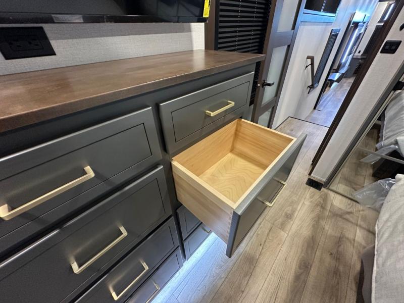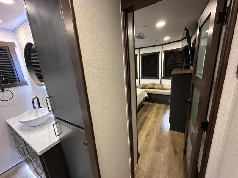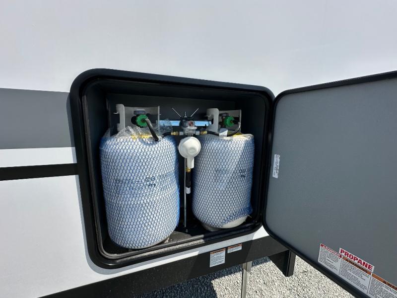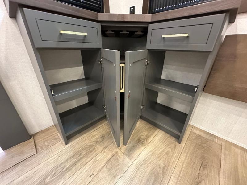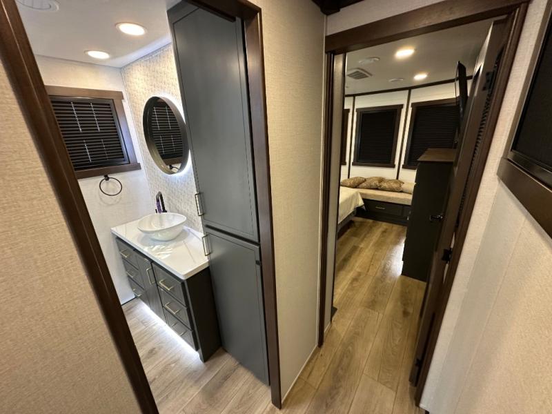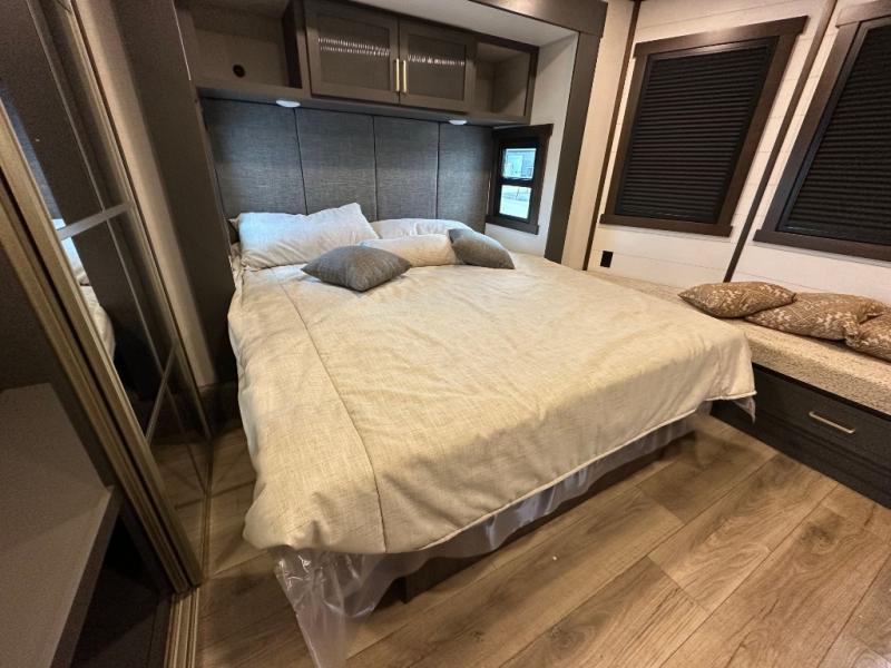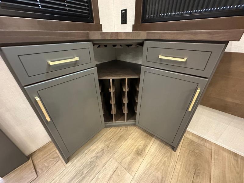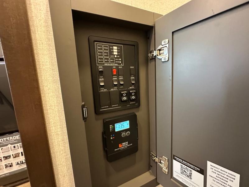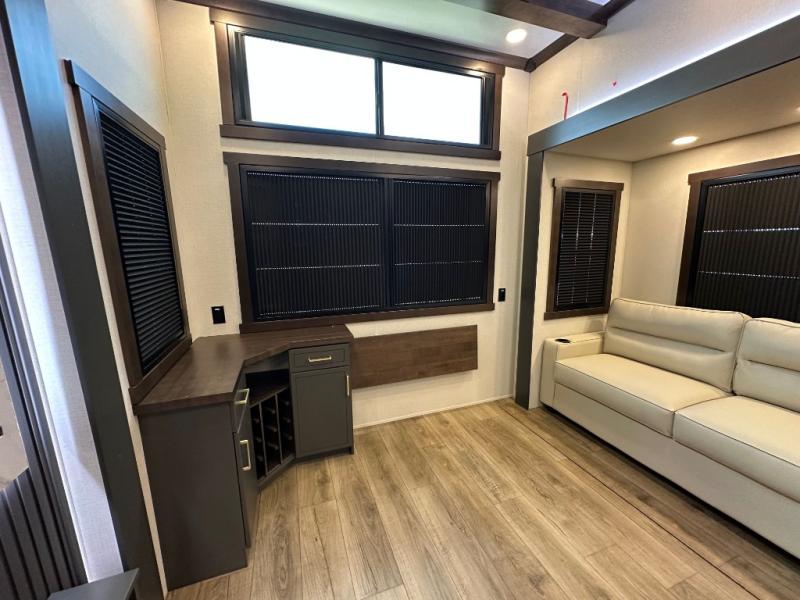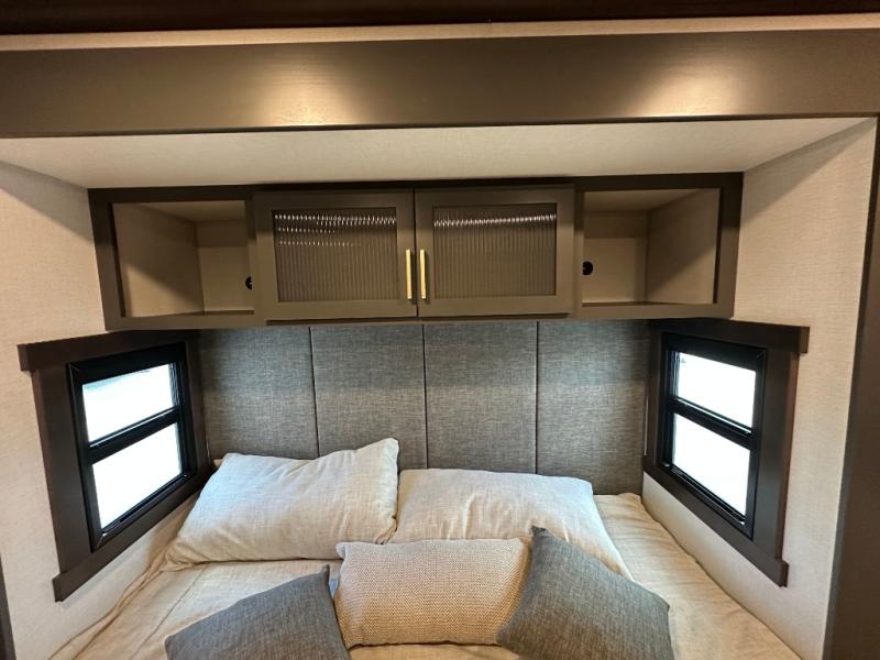 Hop on new adventures with the Forest River Cedar Creek Cottage Fifth Wheels! Each destination fifth wheel features a 101" wide body frame that provides a sturdy foundation for your adventures, while the AlphaPly TPO roof membrane offers superior durability and weather resistance. Plus, the 3M Bonded Sidewalls add an extra layer of protection and strength, and the hydraulic front jacks make setting up camp a breeze. In the luxurious interiors, the vinyl floor covering is easy to clean, and the Vixeinite flush floor slides in the kitchen and living area provide a seamless transition between the floor and the slide-outs. In addition, the 52" ceiling fan in the living room circulates air and adds to the spacious feel, and the kitchen island is a standout feature, boasting a solid surface counter, a flush-mount sink, and a stainless-steel design. You'll feel like you're cooking at home! Finally, the USB ports in the bathroom ensure you can keep your devices charged and within reach, even in the most convenient places.