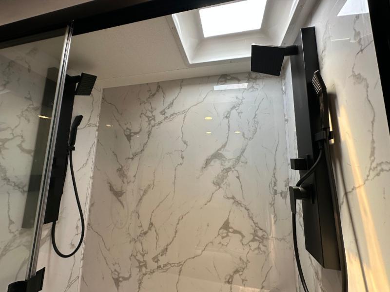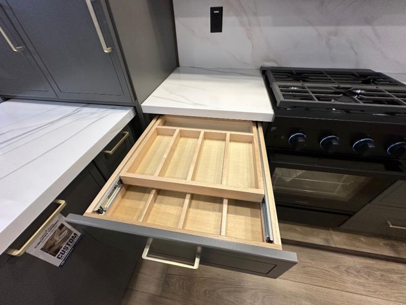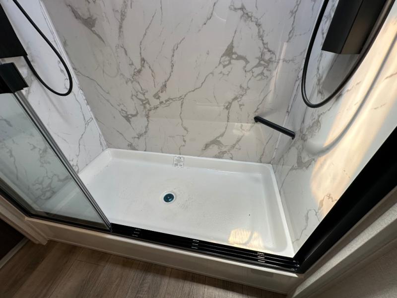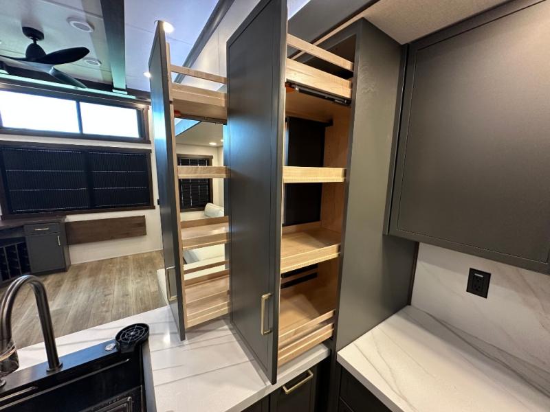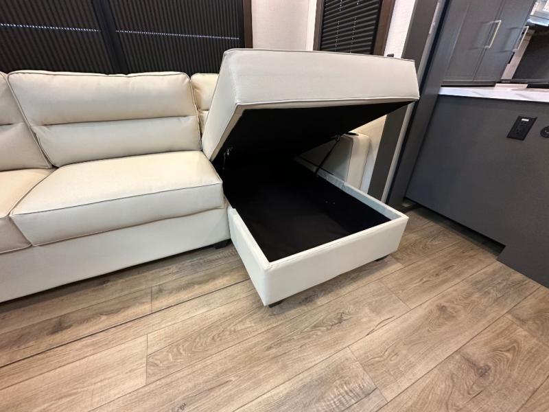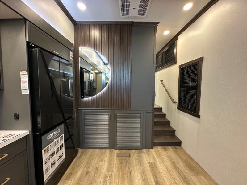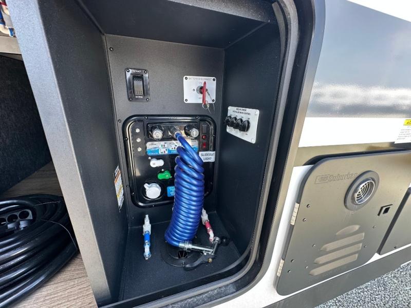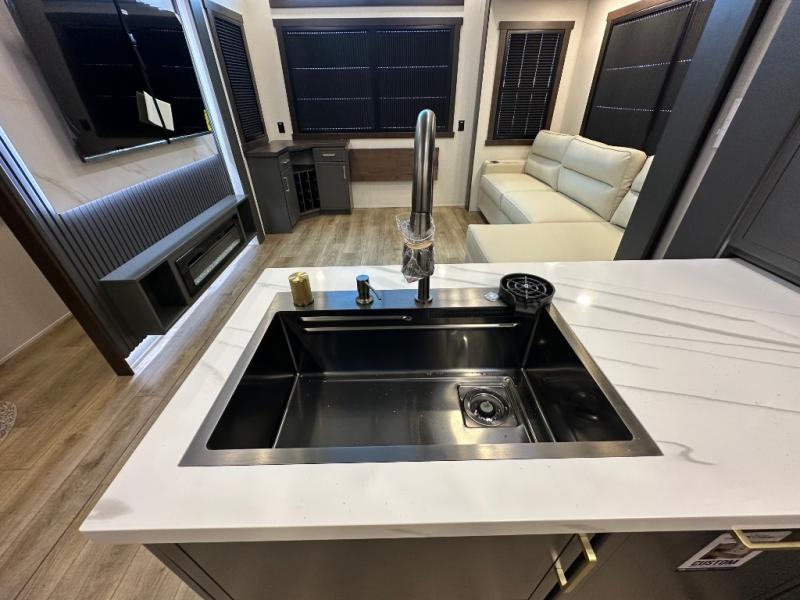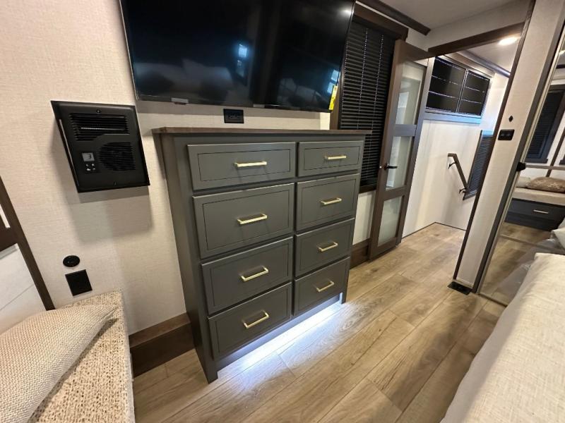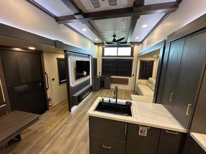 Hop on new adventures with the Forest River Cedar Creek Cottage Fifth Wheels! Each destination fifth wheel features a 101" wide body frame that provides a sturdy foundation for your adventures, while the AlphaPly TPO roof membrane offers superior durability and weather resistance. Plus, the 3M Bonded Sidewalls add an extra layer of protection and strength, and the hydraulic front jacks make setting up camp a breeze. In the luxurious interiors, the vinyl floor covering is easy to clean, and the Vixeinite flush floor slides in the kitchen and living area provide a seamless transition between the floor and the slide-outs. In addition, the 52" ceiling fan in the living room circulates air and adds to the spacious feel, and the kitchen island is a standout feature, boasting a solid surface counter, a flush-mount sink, and a stainless-steel design. You'll feel like you're cooking at home! Finally, the USB ports in the bathroom ensure you can keep your devices charged and within reach, even in the most convenient places.