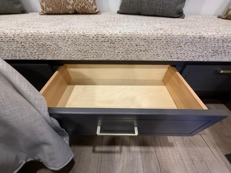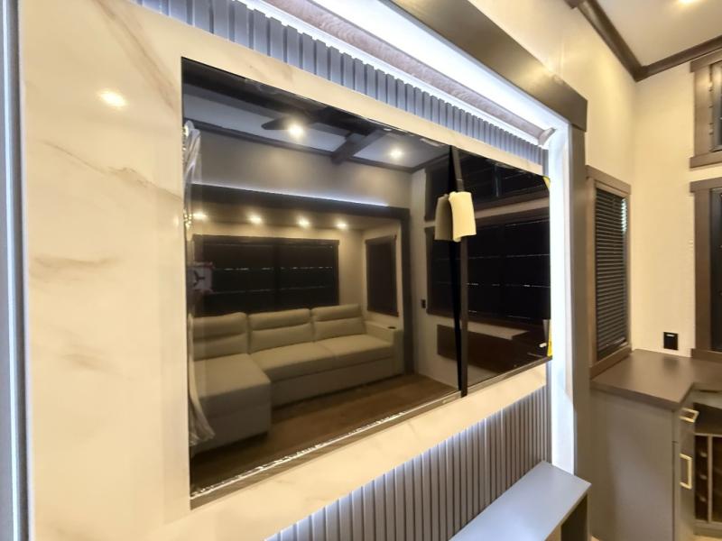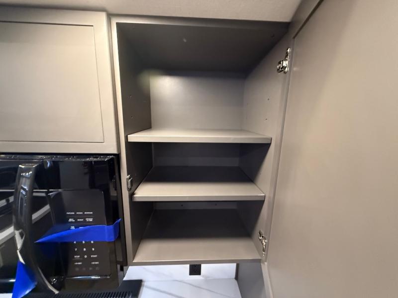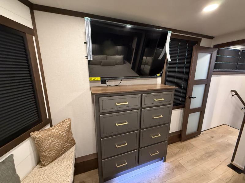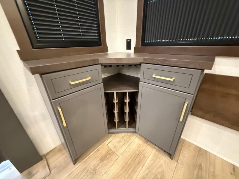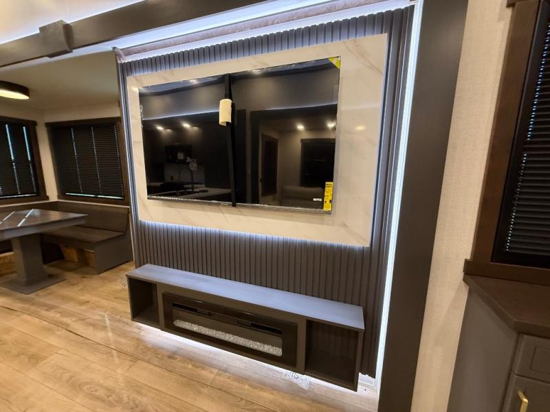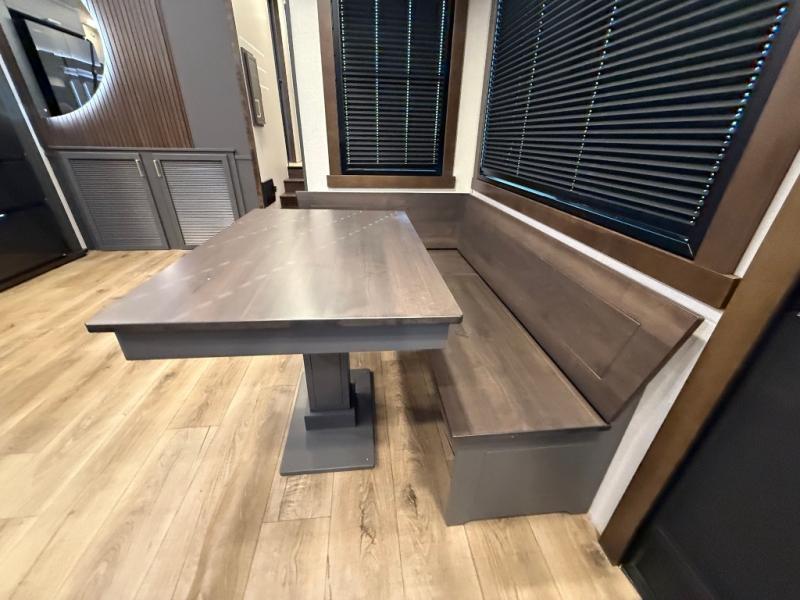 The rear living room is a spacious retreat, featuring a comfortable sectional sofa and a flip desk perfect for working or relaxing. Unwind with a glass of wine at the wine bar, or cozy up by the fireplace while enjoying your favorite show on the TV. The mud room is a practical and convenient feature, perfect for storing gear, boots, and jackets. The kitchen is fully equipped with overhead cabinets, a microwave, a refrigerator, and a table with swivel chairs, providing a comfortable spot to enjoy meals with family and friends. The full bathroom features an ample shower, providing plenty of space to get ready for the day, while the front bedroom is the perfect spot to relax and recharge after a long day of exploring, featuring a king bed, closet, and dresser.