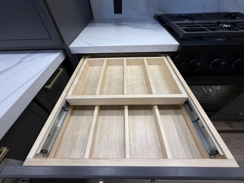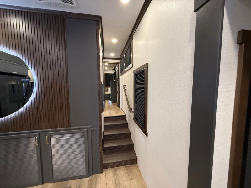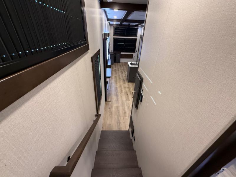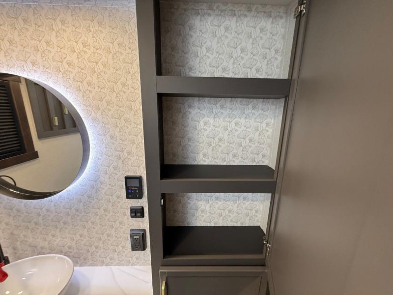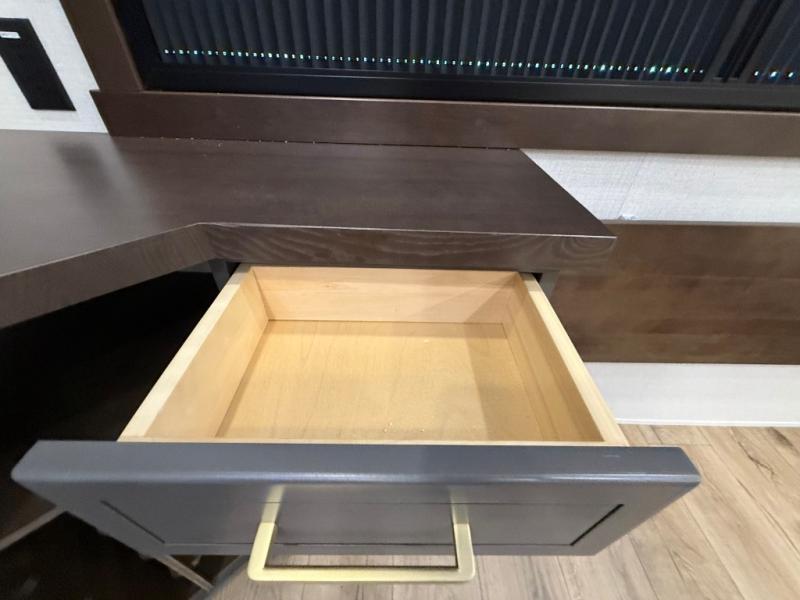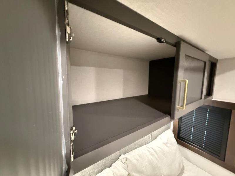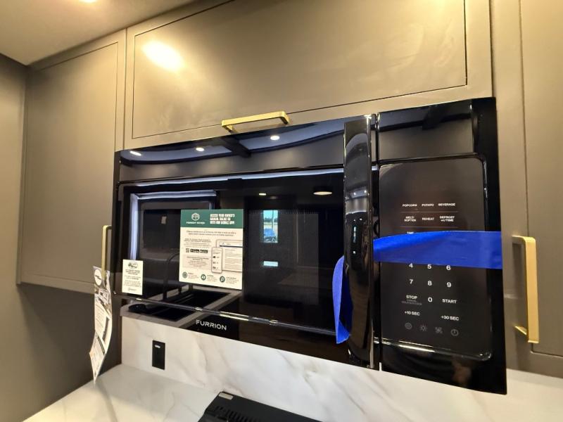 The rear living room is a spacious retreat, featuring a comfortable sectional sofa and a flip desk perfect for working or relaxing. Unwind with a glass of wine at the wine bar, or cozy up by the fireplace while enjoying your favorite show on the TV. The mud room is a practical and convenient feature, perfect for storing gear, boots, and jackets. The kitchen is fully equipped with overhead cabinets, a microwave, a refrigerator, and a table with swivel chairs, providing a comfortable spot to enjoy meals with family and friends. The full bathroom features an ample shower, providing plenty of space to get ready for the day, while the front bedroom is the perfect spot to relax and recharge after a long day of exploring, featuring a king bed, closet, and dresser.