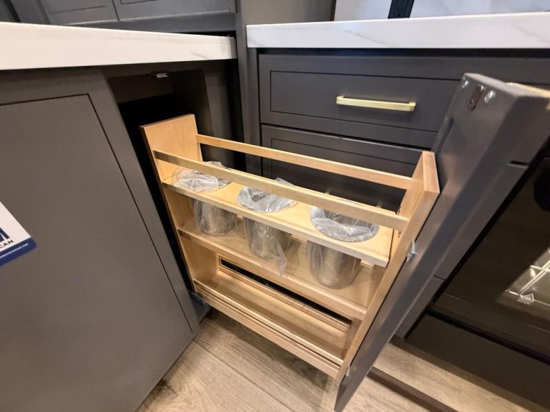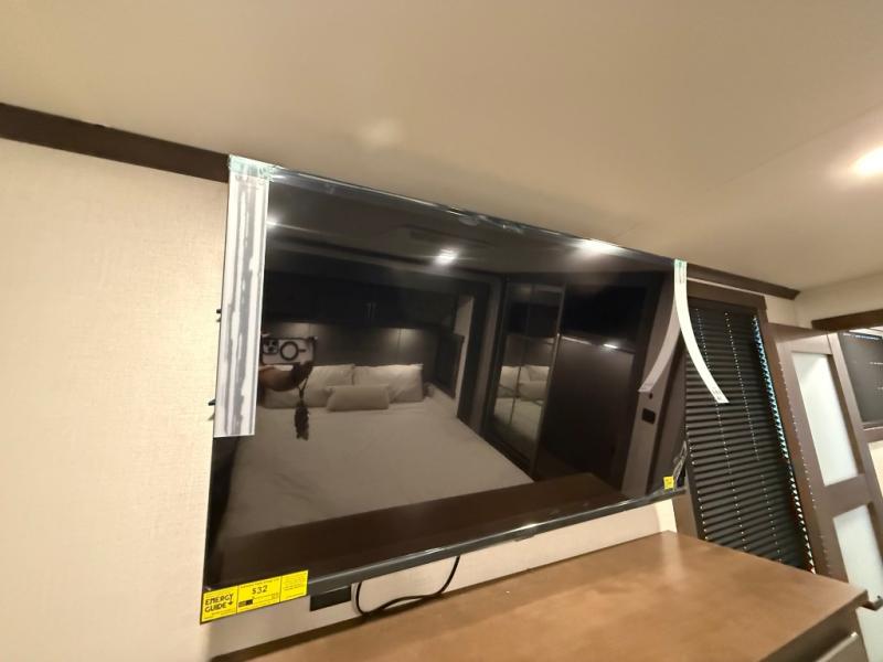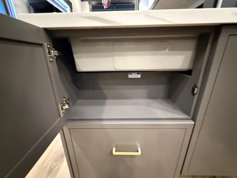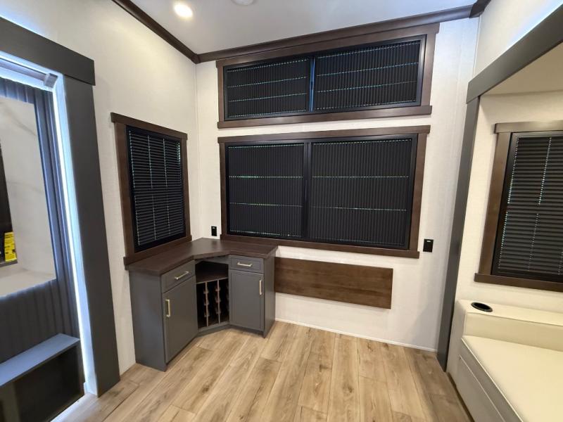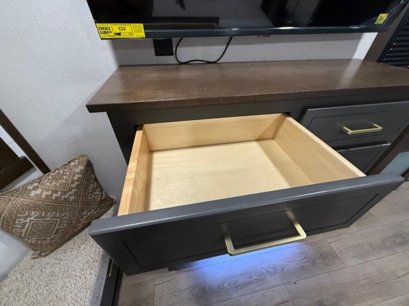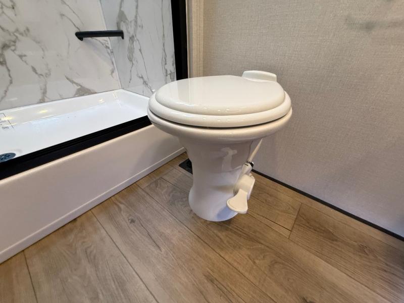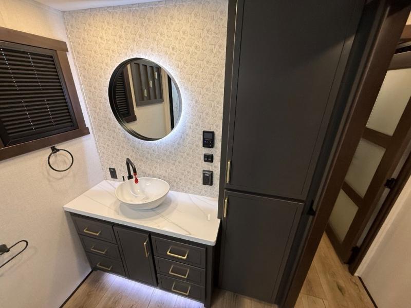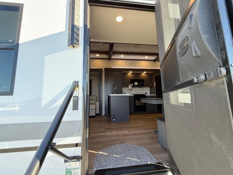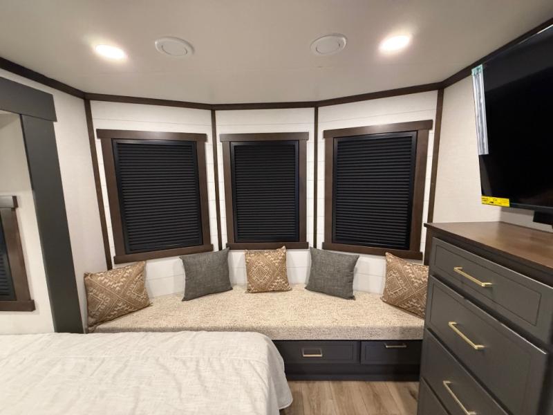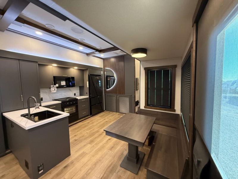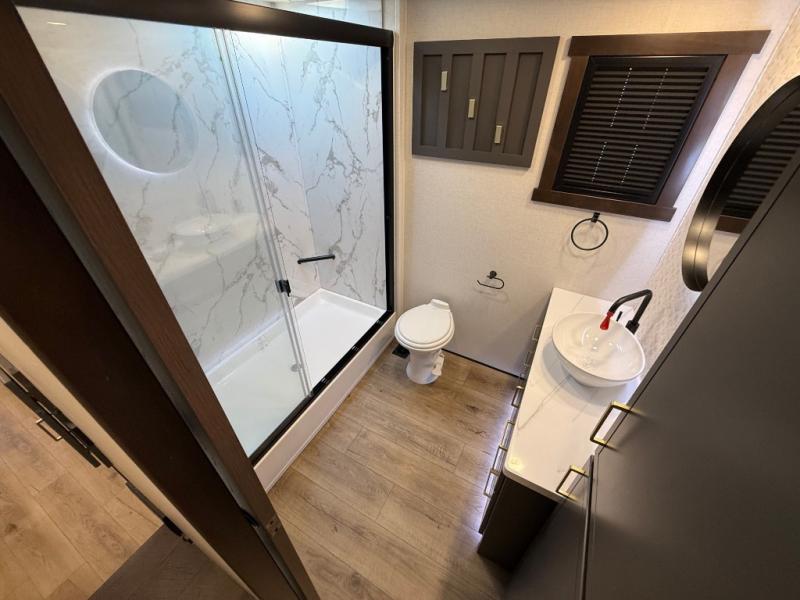 Hop on new adventures with the Forest River Cedar Creek Cottage Fifth Wheels! Each destination fifth wheel features a 101" wide body frame that provides a sturdy foundation for your adventures, while the AlphaPly TPO roof membrane offers superior durability and weather resistance. Plus, the 3M Bonded Sidewalls add an extra layer of protection and strength, and the hydraulic front jacks make setting up camp a breeze. In the luxurious interiors, the vinyl floor covering is easy to clean, and the Vixeinite flush floor slides in the kitchen and living area provide a seamless transition between the floor and the slide-outs. In addition, the 52" ceiling fan in the living room circulates air and adds to the spacious feel, and the kitchen island is a standout feature, boasting a solid surface counter, a flush-mount sink, and a stainless-steel design. You'll feel like you're cooking at home! Finally, the USB ports in the bathroom ensure you can keep your devices charged and within reach, even in the most convenient places.