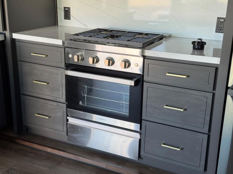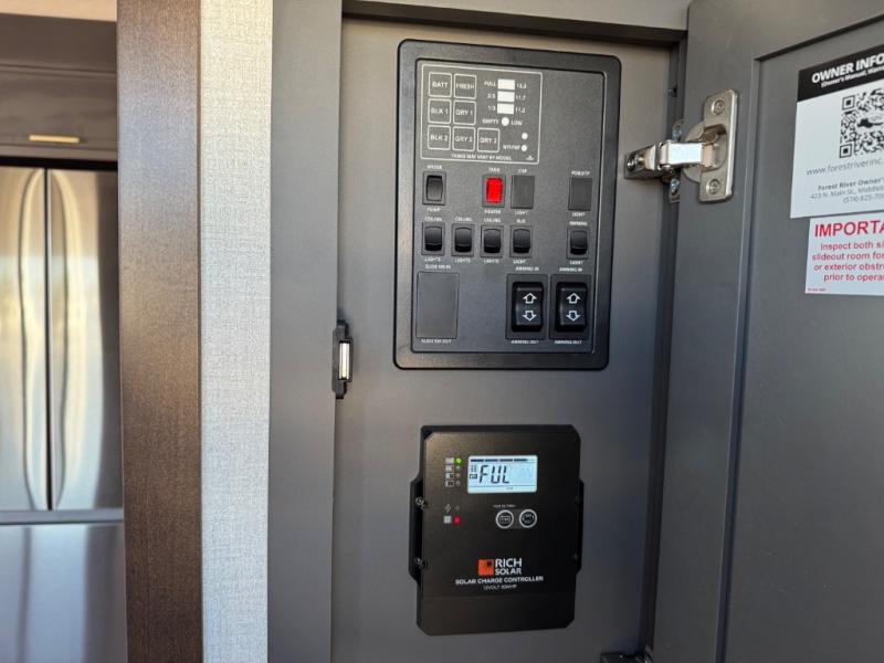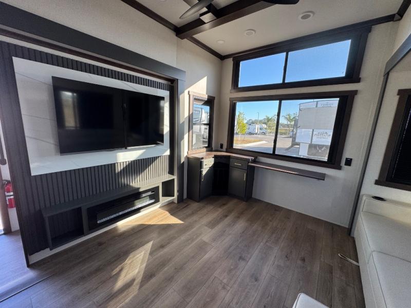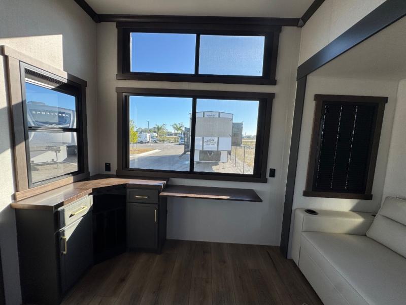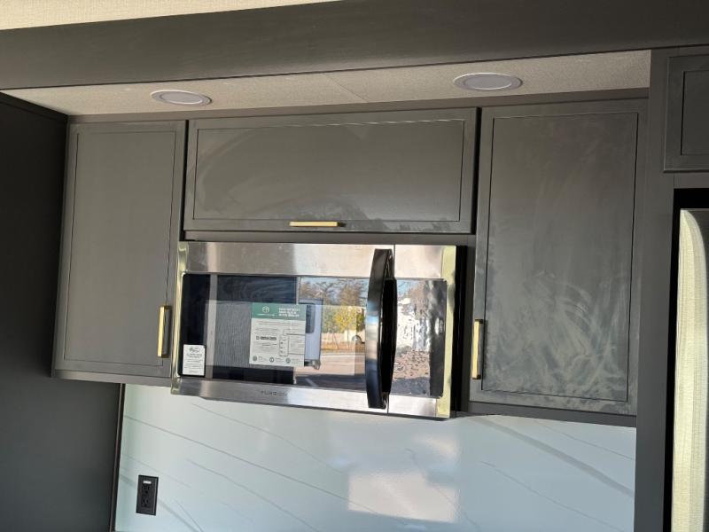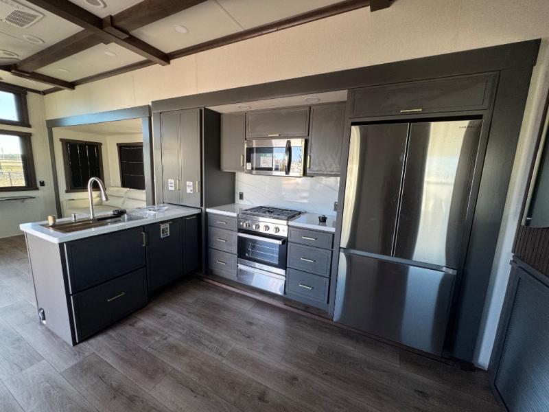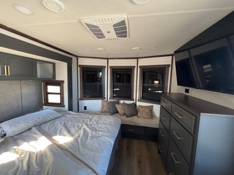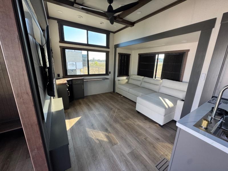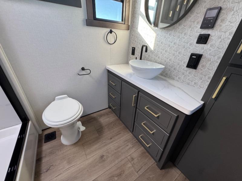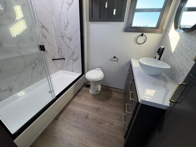 Hop on new adventures with the Forest River Cedar Creek Cottage Fifth Wheels! Each destination fifth wheel features a 101" wide body frame that provides a sturdy foundation for your adventures, while the AlphaPly TPO roof membrane offers superior durability and weather resistance. Plus, the 3M Bonded Sidewalls add an extra layer of protection and strength, and the hydraulic front jacks make setting up camp a breeze. In the luxurious interiors, the vinyl floor covering is easy to clean, and the Vixeinite flush floor slides in the kitchen and living area provide a seamless transition between the floor and the slide-outs. In addition, the 52" ceiling fan in the living room circulates air and adds to the spacious feel, and the kitchen island is a standout feature, boasting a solid surface counter, a flush-mount sink, and a stainless-steel design. You'll feel like you're cooking at home! Finally, the USB ports in the bathroom ensure you can keep your devices charged and within reach, even in the most convenient places.