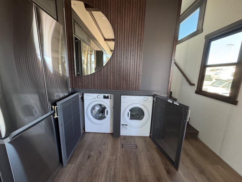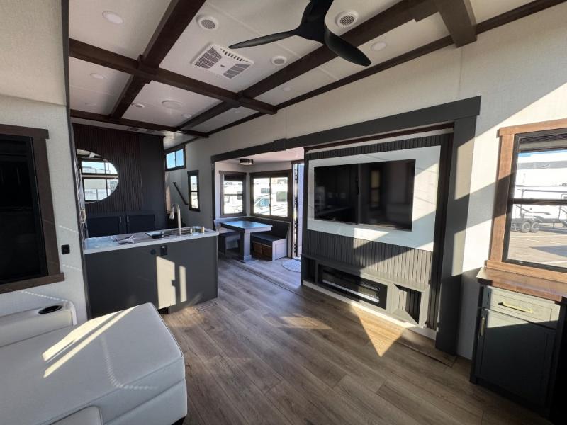 The rear living room is a spacious retreat, featuring a comfortable sectional sofa and a flip desk perfect for working or relaxing. Unwind with a glass of wine at the wine bar, or cozy up by the fireplace while enjoying your favorite show on the TV. The mud room is a practical and convenient feature, perfect for storing gear, boots, and jackets. The kitchen is fully equipped with overhead cabinets, a microwave, a refrigerator, and a table with swivel chairs, providing a comfortable spot to enjoy meals with family and friends. The full bathroom features an ample shower, providing plenty of space to get ready for the day, while the front bedroom is the perfect spot to relax and recharge after a long day of exploring, featuring a king bed, closet, and dresser.