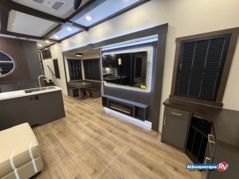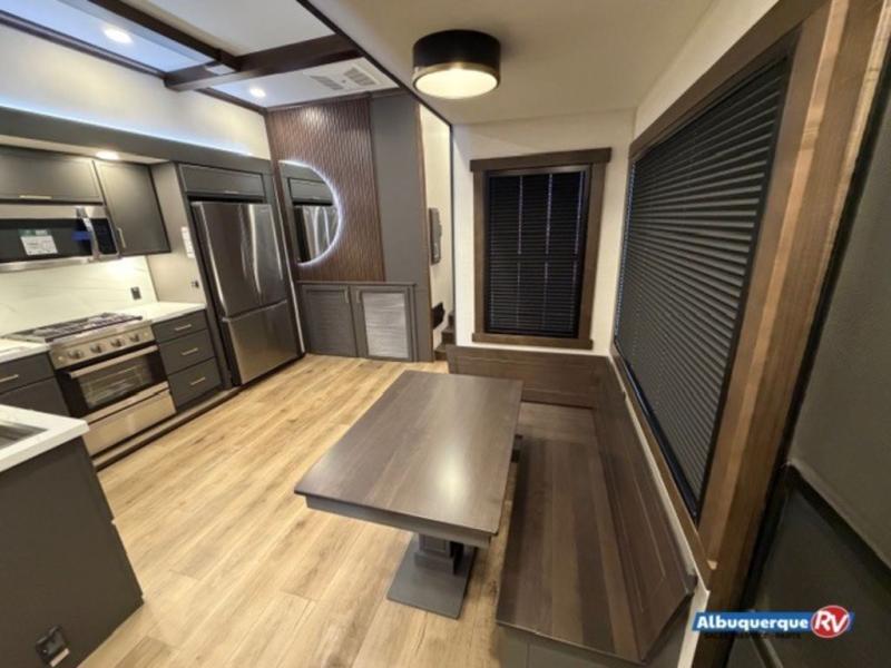 The rear living room is a spacious retreat, featuring a comfortable sectional sofa and a flip desk perfect for working or relaxing. Unwind with a glass of wine at the wine bar, or cozy up by the fireplace while enjoying your favorite show on the TV. The mud room is a practical and convenient feature, perfect for storing gear, boots, and jackets. The kitchen is fully equipped with overhead cabinets, a microwave, a refrigerator, and a table with swivel chairs, providing a comfortable spot to enjoy meals with family and friends. The full bathroom features an ample shower, providing plenty of space to get ready for the day, while the front bedroom is the perfect spot to relax and recharge after a long day of exploring, featuring a king bed, closet, and dresser.