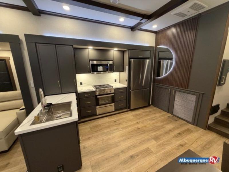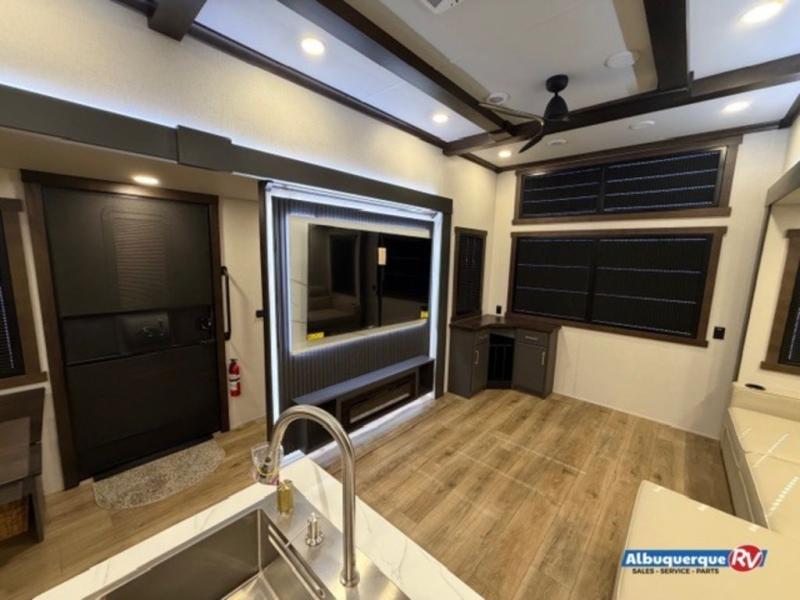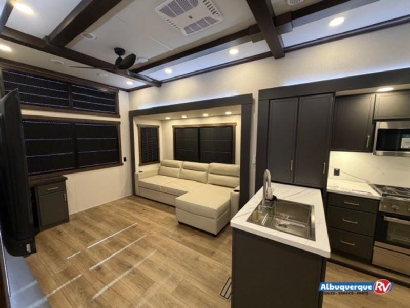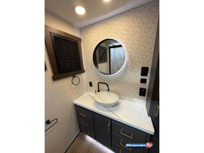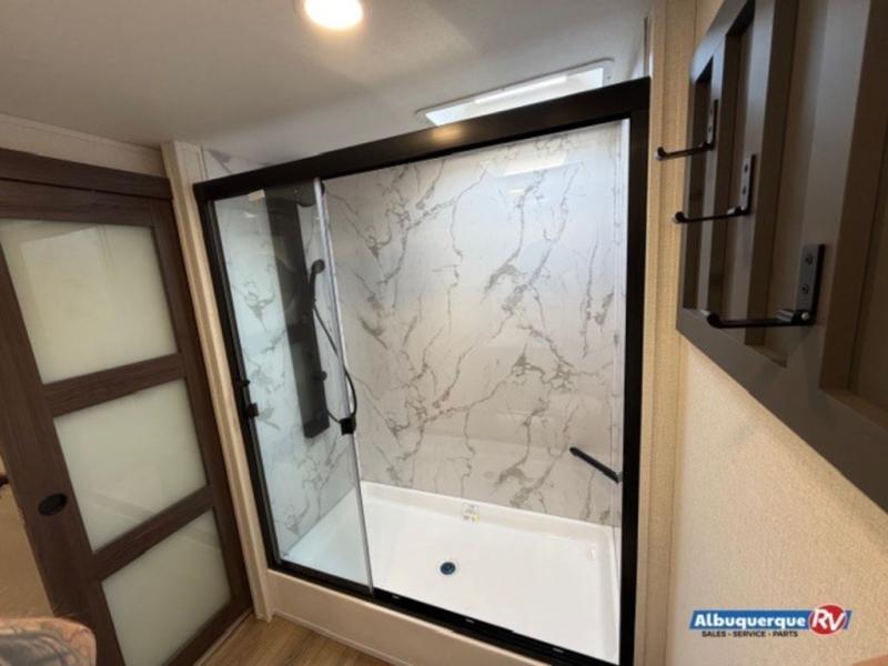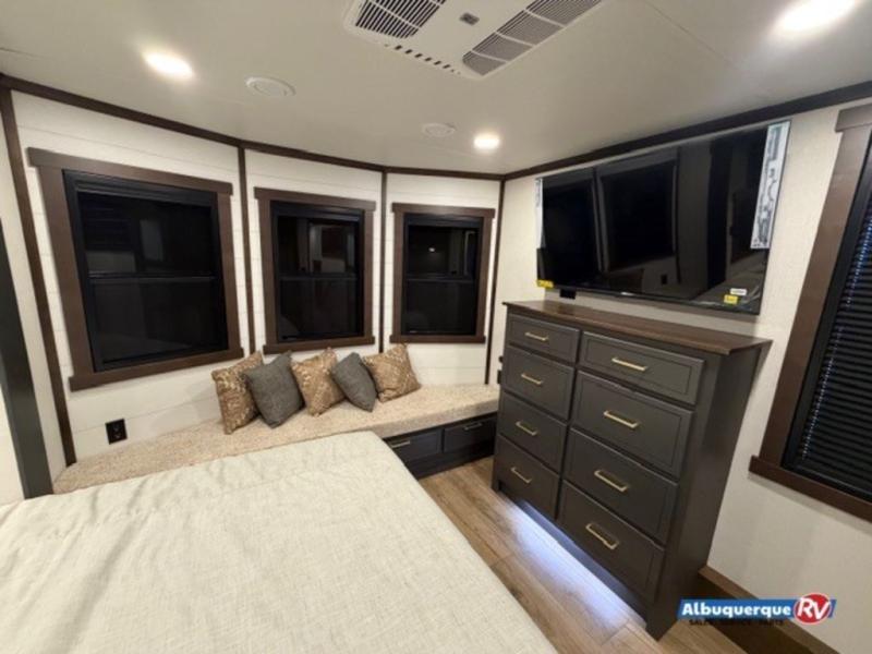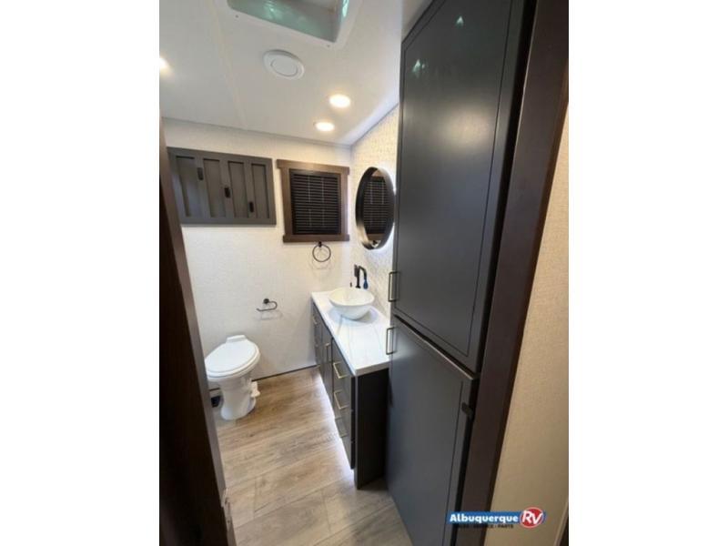 Hop on new adventures with the Forest River Cedar Creek Cottage Fifth Wheels! Each destination fifth wheel features a 101" wide body frame that provides a sturdy foundation for your adventures, while the AlphaPly TPO roof membrane offers superior durability and weather resistance. Plus, the 3M Bonded Sidewalls add an extra layer of protection and strength, and the hydraulic front jacks make setting up camp a breeze. In the luxurious interiors, the vinyl floor covering is easy to clean, and the Vixeinite flush floor slides in the kitchen and living area provide a seamless transition between the floor and the slide-outs. In addition, the 52" ceiling fan in the living room circulates air and adds to the spacious feel, and the kitchen island is a standout feature, boasting a solid surface counter, a flush-mount sink, and a stainless-steel design. You'll feel like you're cooking at home! Finally, the USB ports in the bathroom ensure you can keep your devices charged and within reach, even in the most convenient places.