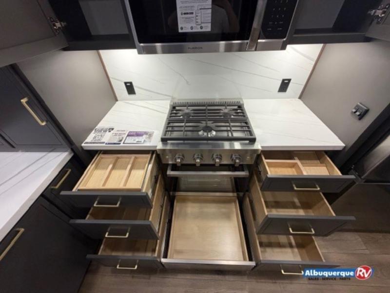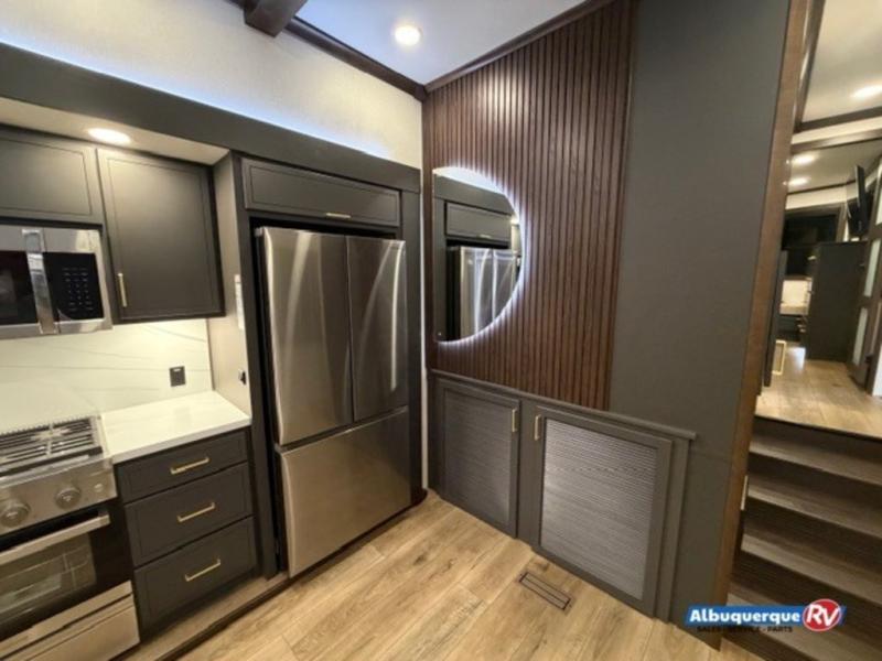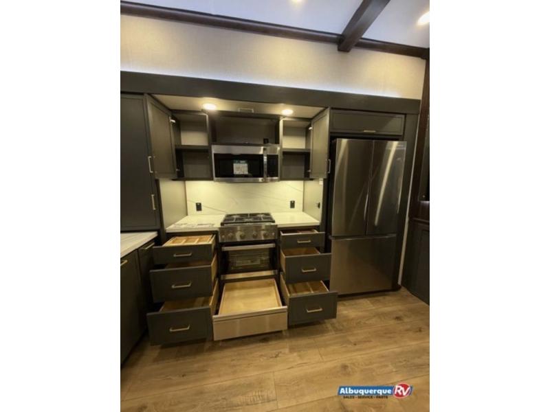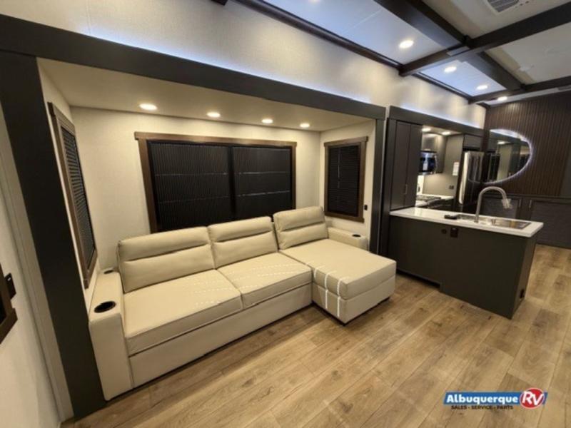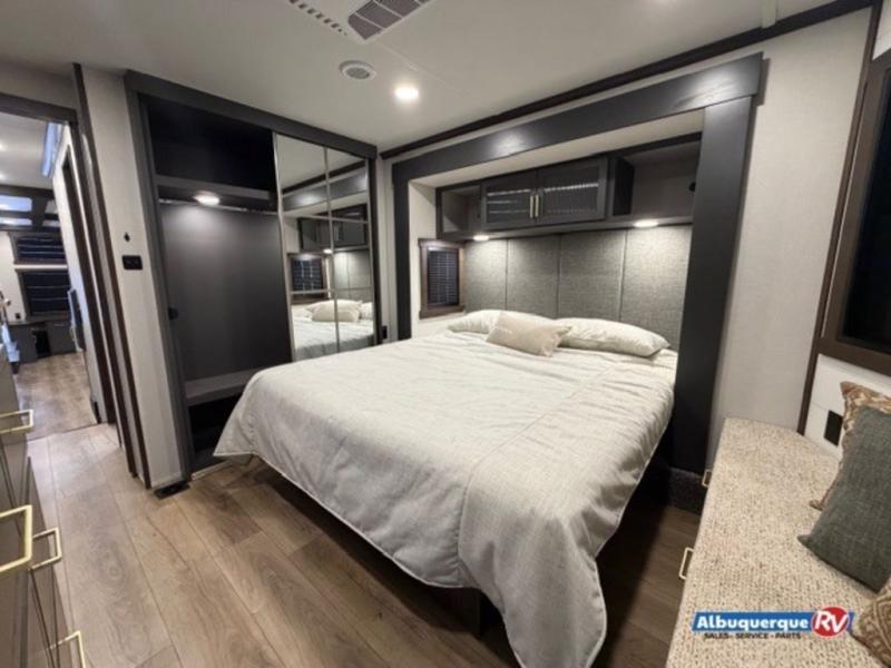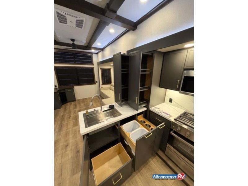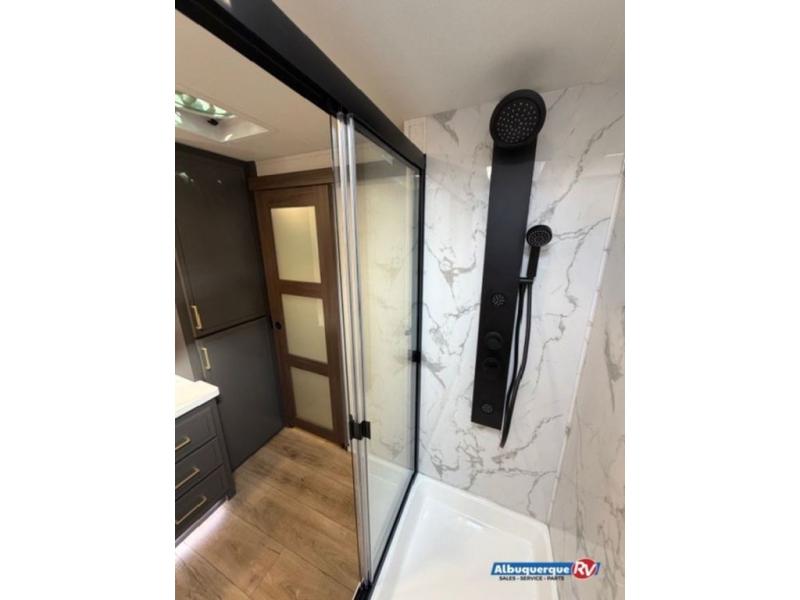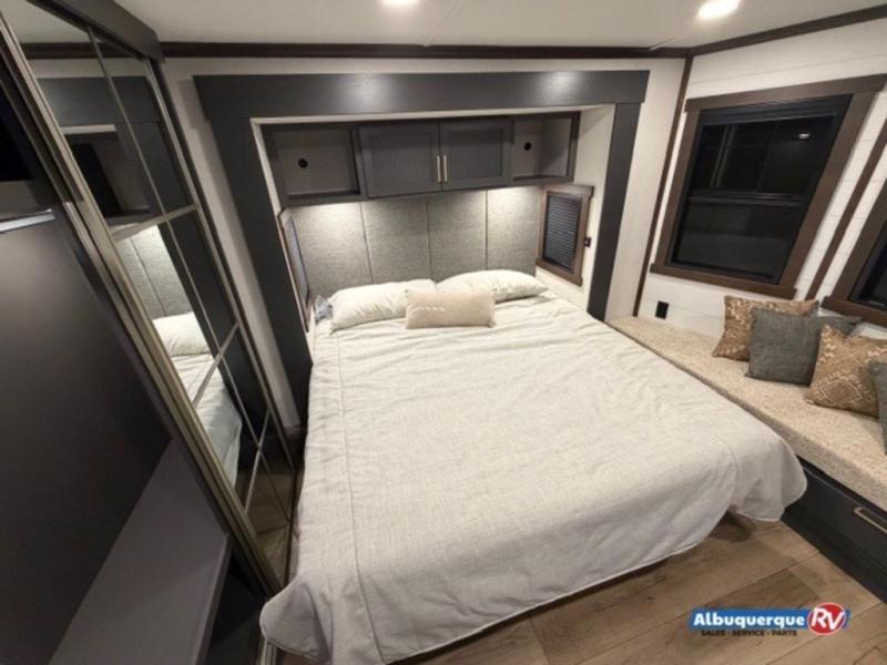 Hop on new adventures with the Forest River Cedar Creek Cottage Fifth Wheels! Each destination fifth wheel features a 101" wide body frame that provides a sturdy foundation for your adventures, while the AlphaPly TPO roof membrane offers superior durability and weather resistance. Plus, the 3M Bonded Sidewalls add an extra layer of protection and strength, and the hydraulic front jacks make setting up camp a breeze. In the luxurious interiors, the vinyl floor covering is easy to clean, and the Vixeinite flush floor slides in the kitchen and living area provide a seamless transition between the floor and the slide-outs. In addition, the 52" ceiling fan in the living room circulates air and adds to the spacious feel, and the kitchen island is a standout feature, boasting a solid surface counter, a flush-mount sink, and a stainless-steel design. You'll feel like you're cooking at home! Finally, the USB ports in the bathroom ensure you can keep your devices charged and within reach, even in the most convenient places.