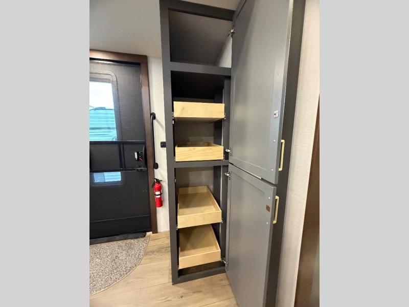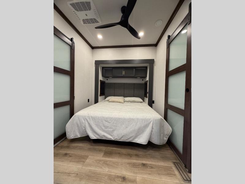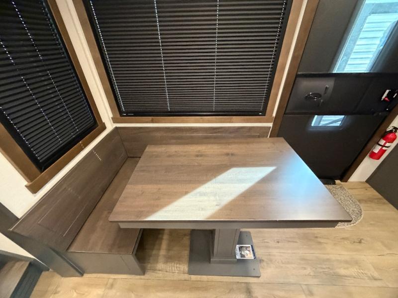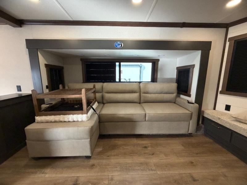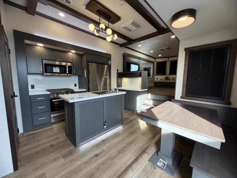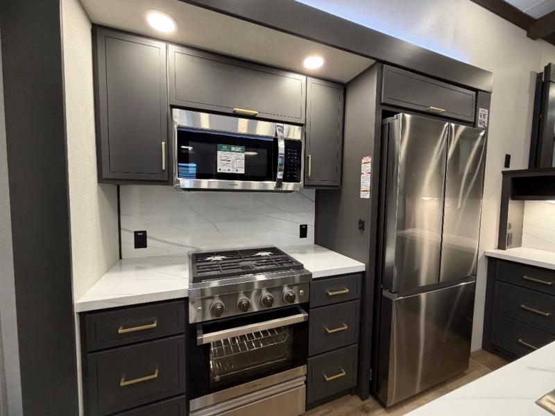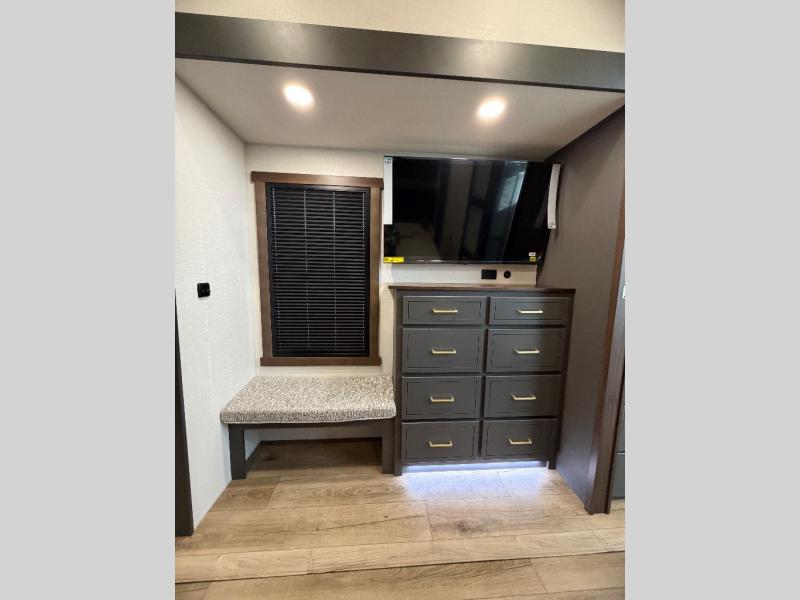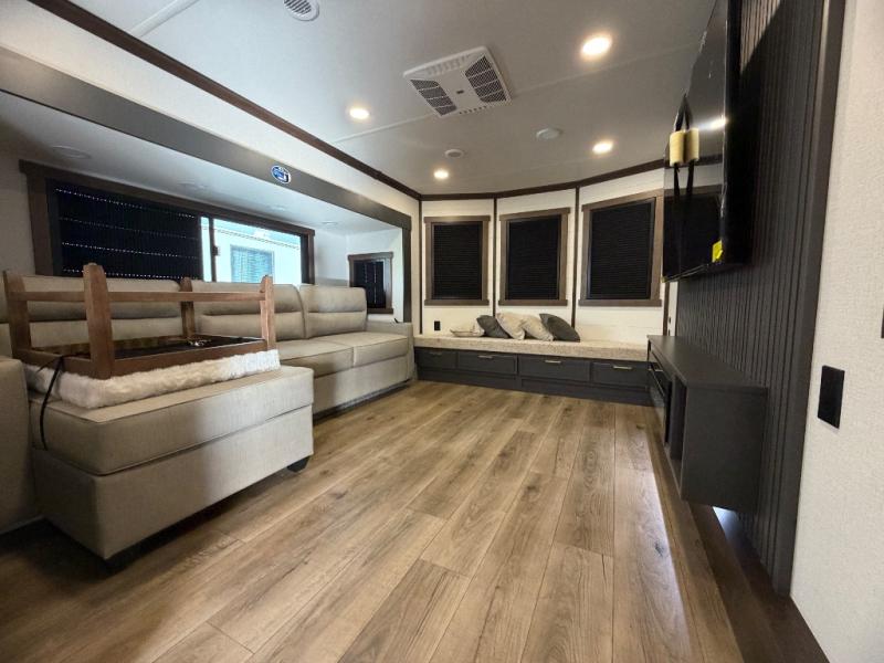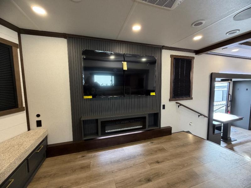 Unwind and refresh in this serene space of the rear bathroom, featuring dual sinks and a spacious linen closet for added convenience and storage. Drift off to sleep surrounded by peaceful surroundings in the private bedroom, complete with a plush king bed, an elegant dresser, and a stunning TV mounted above. The kitchen is a culinary haven, equipped with ample overhead cabinets, a convenient microwave, and a spacious fridge. The ample pantry and second pantry offer ample storage for your favorite ingredients and snacks. Plus, you can enjoy meals with loved ones at the table with swivel chairs! Also, the coat closet and half bath add a touch of practicality, making this fifth wheel perfect for everyday living or extended adventures. The front living room is a vibrant gathering space, featuring a comfortable sectional sofa and a cozy fireplace so you can snuggle up and enjoy quality time with family and friends while watching your favorite shows on the TV!