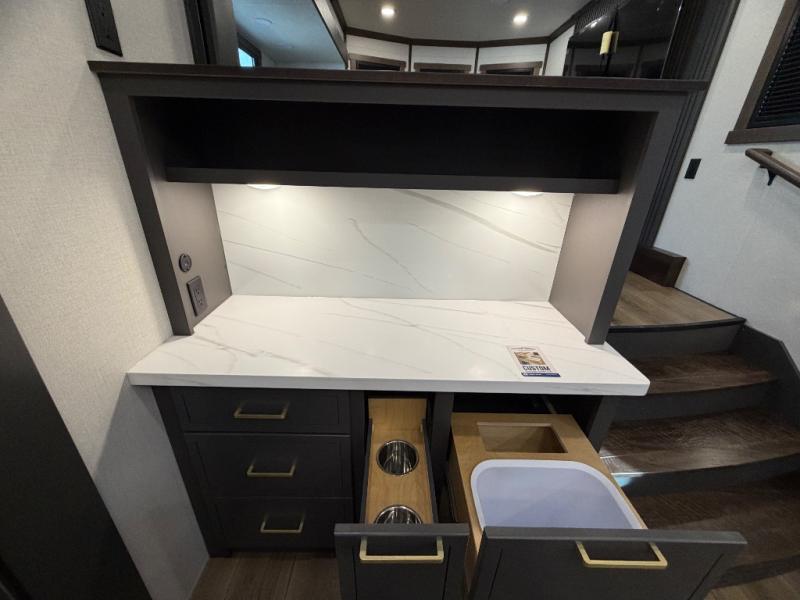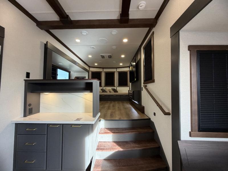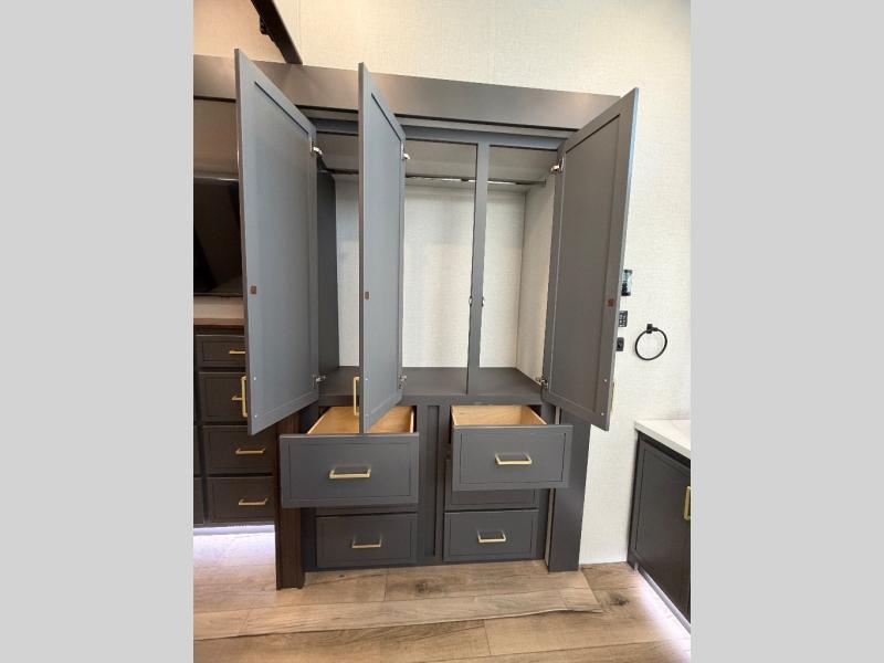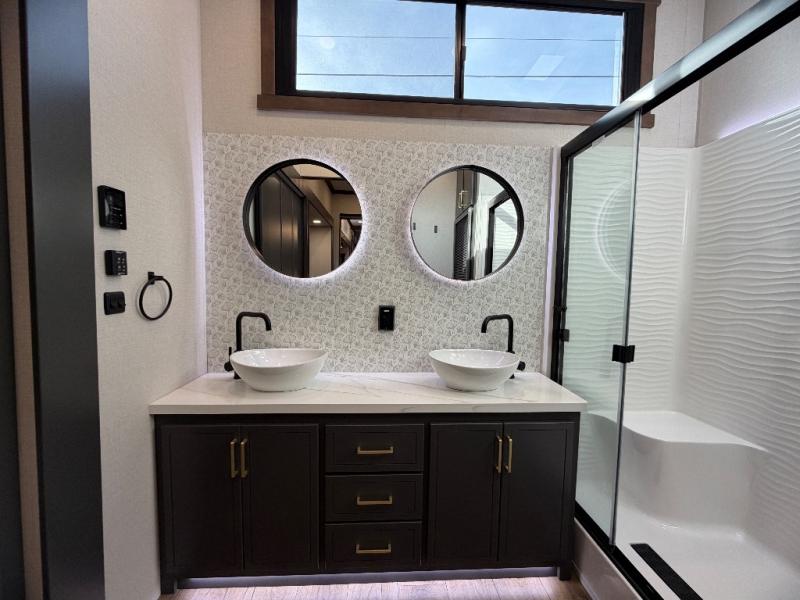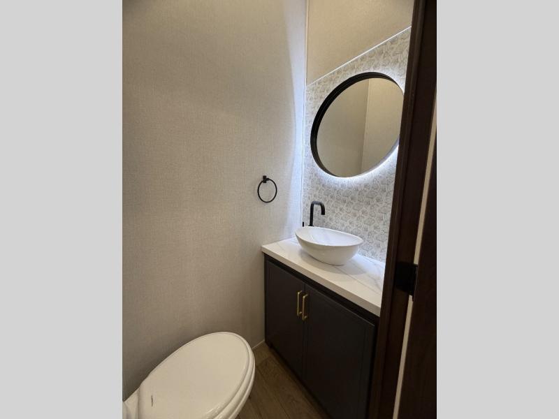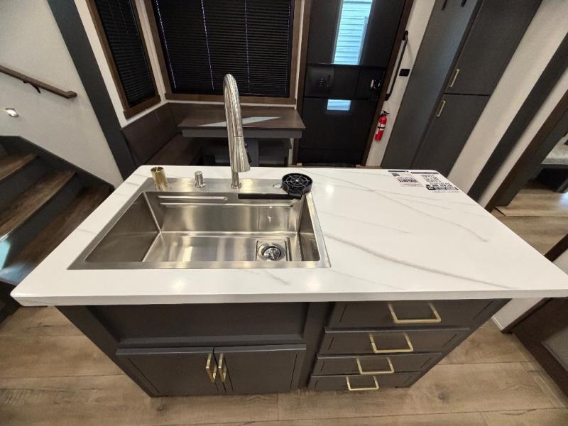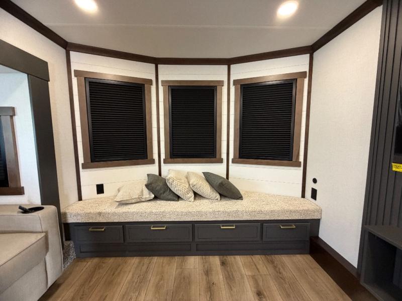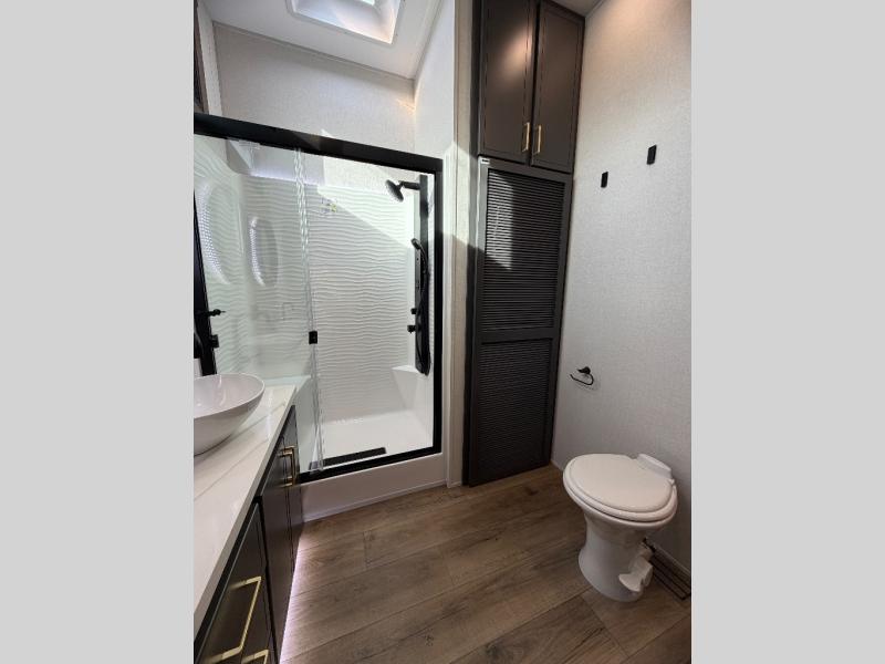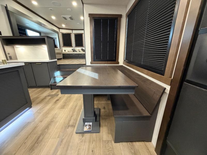 Unwind and refresh in this serene space of the rear bathroom, featuring dual sinks and a spacious linen closet for added convenience and storage. Drift off to sleep surrounded by peaceful surroundings in the private bedroom, complete with a plush king bed, an elegant dresser, and a stunning TV mounted above. The kitchen is a culinary haven, equipped with ample overhead cabinets, a convenient microwave, and a spacious fridge. The ample pantry and second pantry offer ample storage for your favorite ingredients and snacks. Plus, you can enjoy meals with loved ones at the table with swivel chairs! Also, the coat closet and half bath add a touch of practicality, making this fifth wheel perfect for everyday living or extended adventures. The front living room is a vibrant gathering space, featuring a comfortable sectional sofa and a cozy fireplace so you can snuggle up and enjoy quality time with family and friends while watching your favorite shows on the TV!