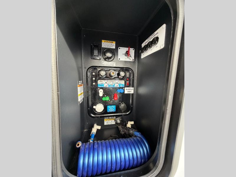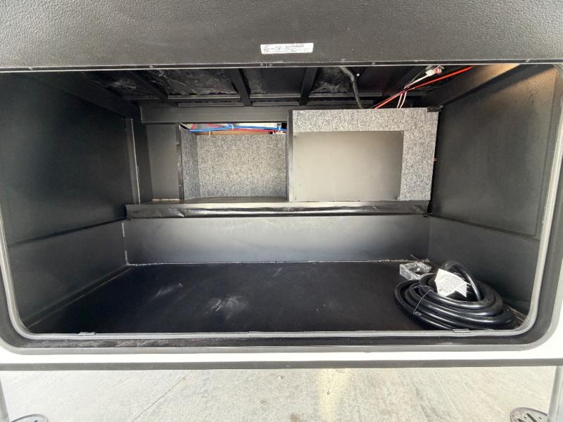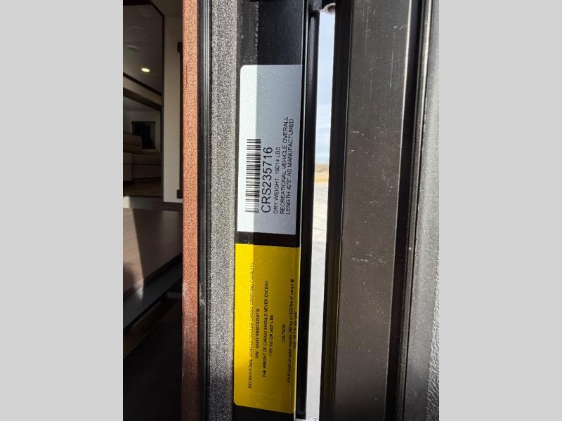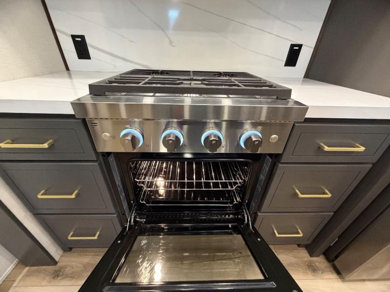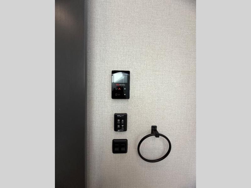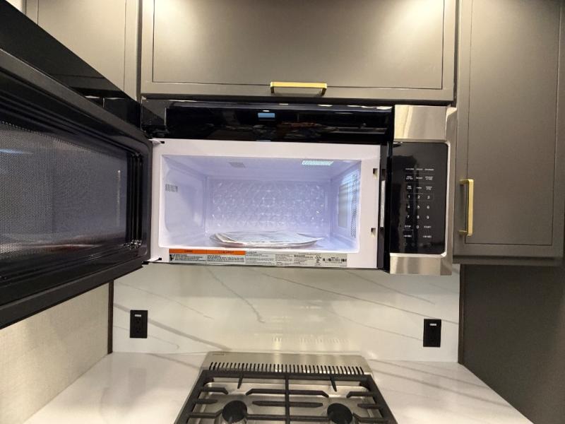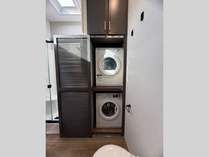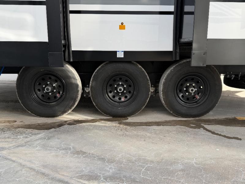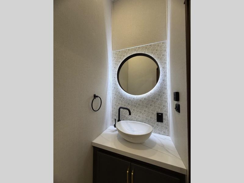 Unwind and refresh in this serene space of the rear bathroom, featuring dual sinks and a spacious linen closet for added convenience and storage. Drift off to sleep surrounded by peaceful surroundings in the private bedroom, complete with a plush king bed, an elegant dresser, and a stunning TV mounted above. The kitchen is a culinary haven, equipped with ample overhead cabinets, a convenient microwave, and a spacious fridge. The ample pantry and second pantry offer ample storage for your favorite ingredients and snacks. Plus, you can enjoy meals with loved ones at the table with swivel chairs! Also, the coat closet and half bath add a touch of practicality, making this fifth wheel perfect for everyday living or extended adventures. The front living room is a vibrant gathering space, featuring a comfortable sectional sofa and a cozy fireplace so you can snuggle up and enjoy quality time with family and friends while watching your favorite shows on the TV!