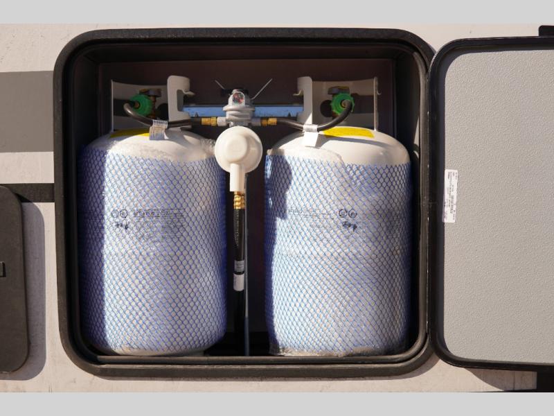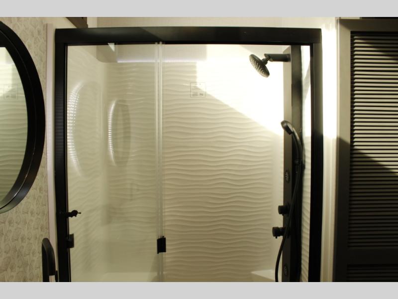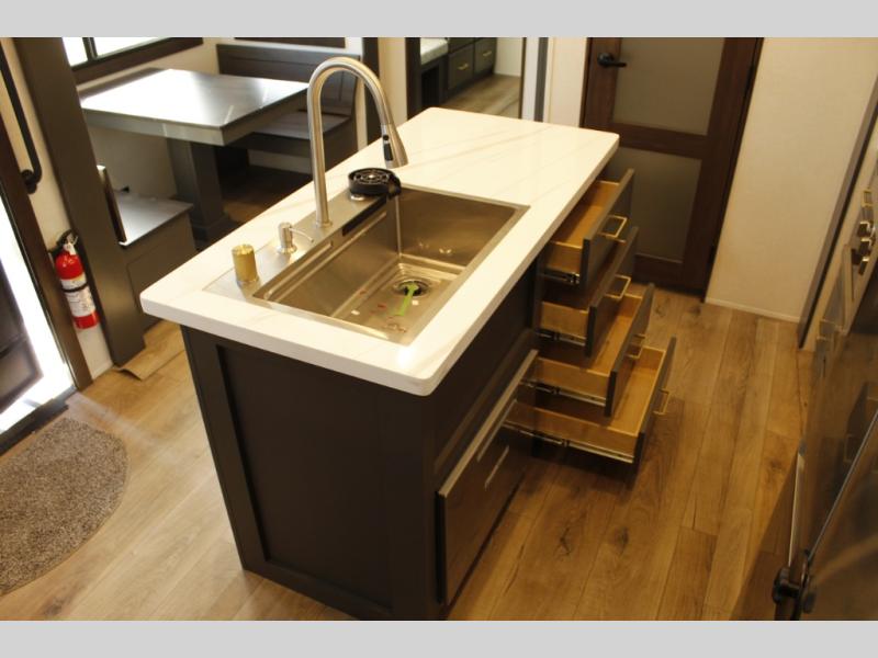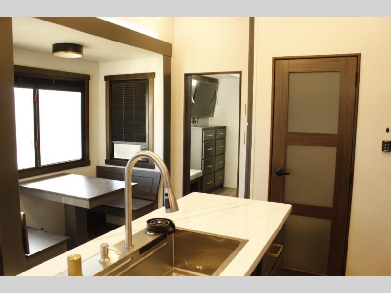 Hop on new adventures with these Forest River Cedar Creek Cottage Fifth Wheels! Each destination fifth wheel features a 101" wide body frame that provides a sturdy foundation for your adventures, while the AlphaPly TPO roof membrane offers superior durability and weather resistance. Plus, the 3M Bonded Sidewalls add an extra layer of protection and strength, and the hydraulic front jacks make setting up camp a breeze. In the luxurious interiors, the vinyl floor covering is easy to clean, and the Vixeinite flush floor slides in the kitchen and living area provide a seamless transition between the floor and the slide-outs. In addition, the 52" ceiling fan in the living room circulates air and adds to the spacious feel, and the kitchen island is a standout feature, boasting a solid surface counter, a flush-mount sink, and a stainless-steel design. You'll feel like you're cooking at home! Finally, the USB ports in the bathroom ensure you can keep your devices charged and within reach, even in the most convenient places.