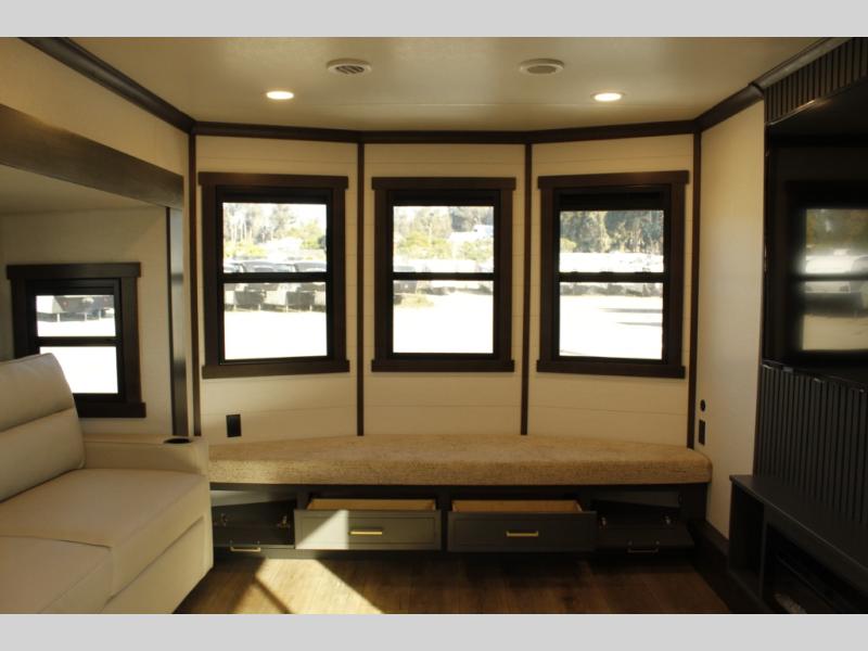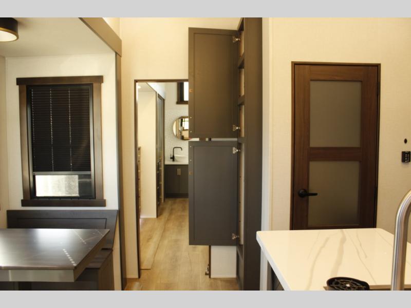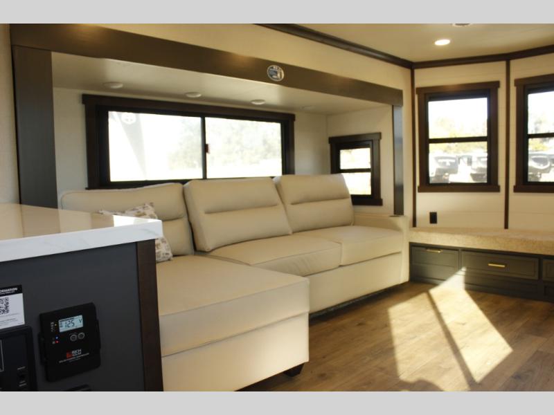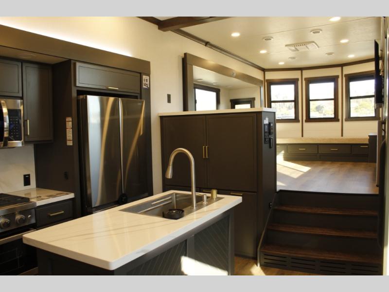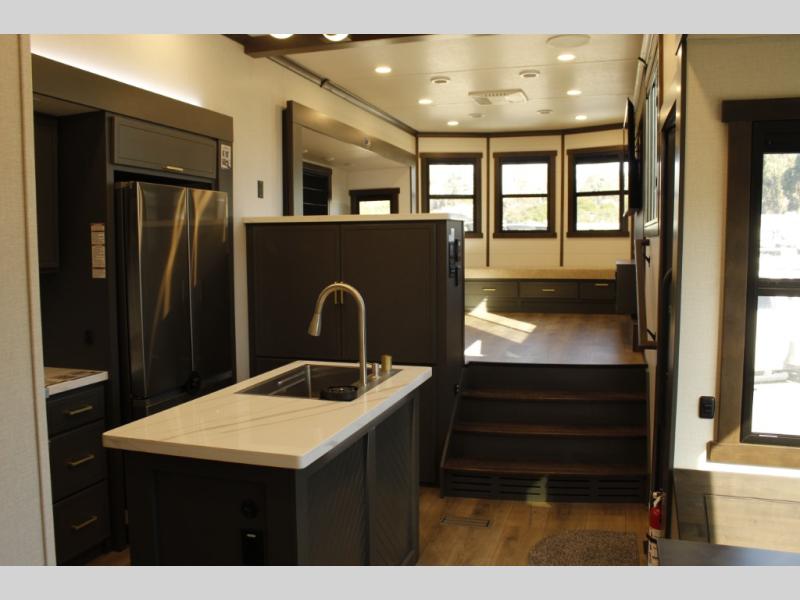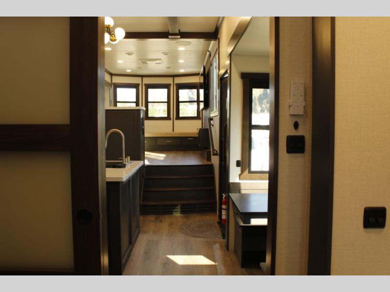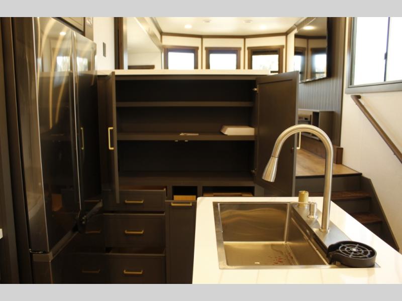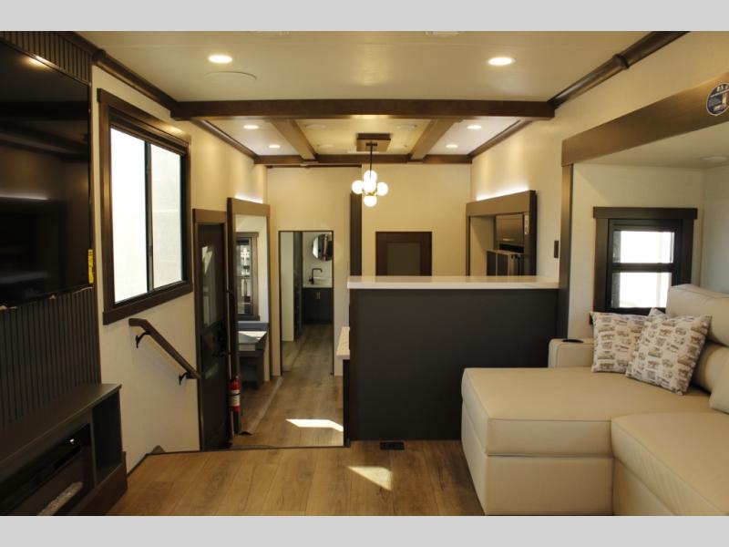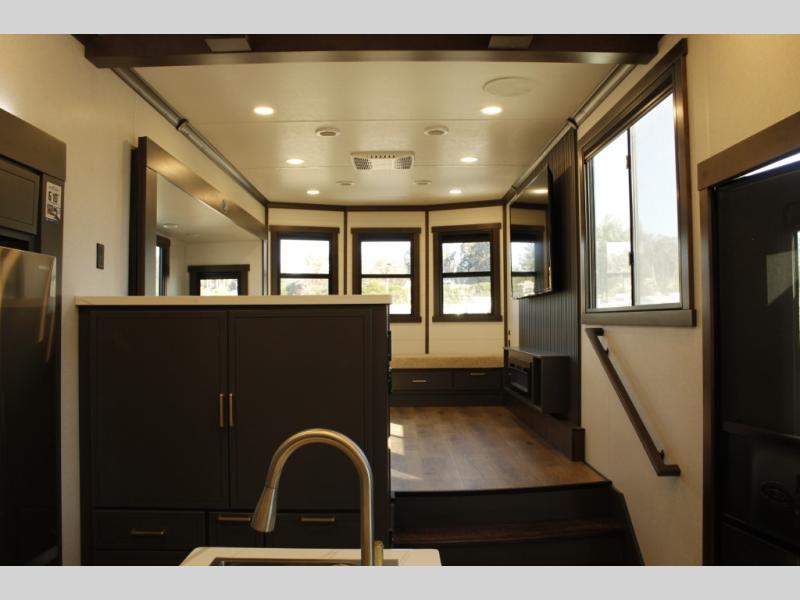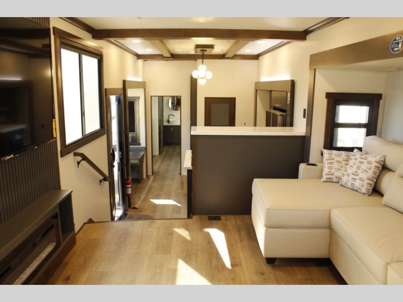 Unwind and refresh in this serene space of the rear bathroom, featuring dual sinks and a spacious linen closet for added convenience and storage. Drift off to sleep surrounded by peaceful surroundings in the private bedroom, complete with a plush king bed, an elegant dresser, and a stunning TV mounted above. The kitchen is a culinary haven, equipped with ample overhead cabinets, a convenient microwave, and a spacious fridge. The ample pantry and second pantry offer ample storage for your favorite ingredients and snacks. Plus, you can enjoy meals with loved ones at the table with swivel chairs! Also, the coat closet and half bath add a touch of practicality, making this fifth wheel perfect for everyday living or extended adventures. The front living room is a vibrant gathering space, featuring a comfortable sectional sofa and a cozy fireplace so you can snuggle up and enjoy quality time with family and friends while watching your favorite shows on the TV!