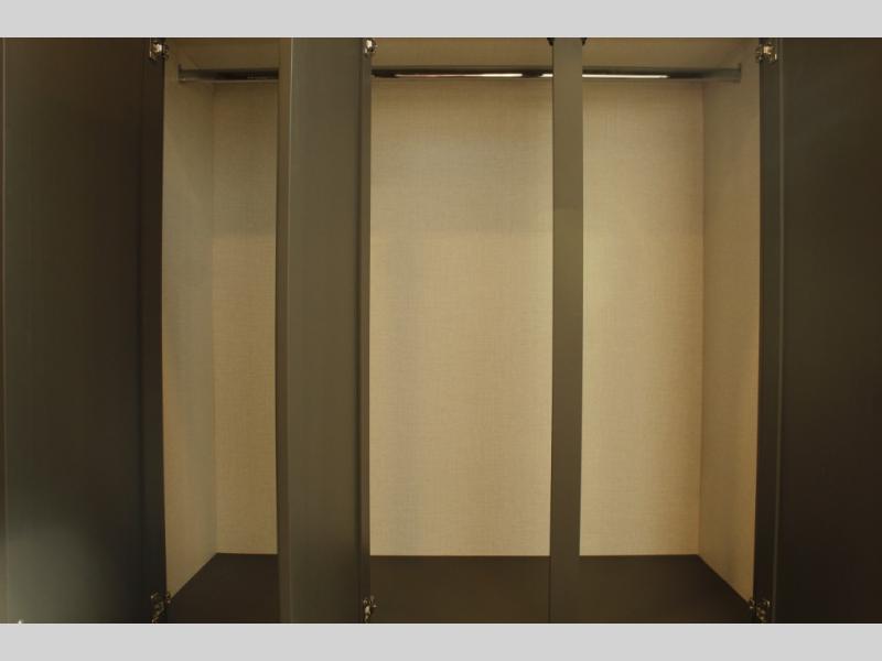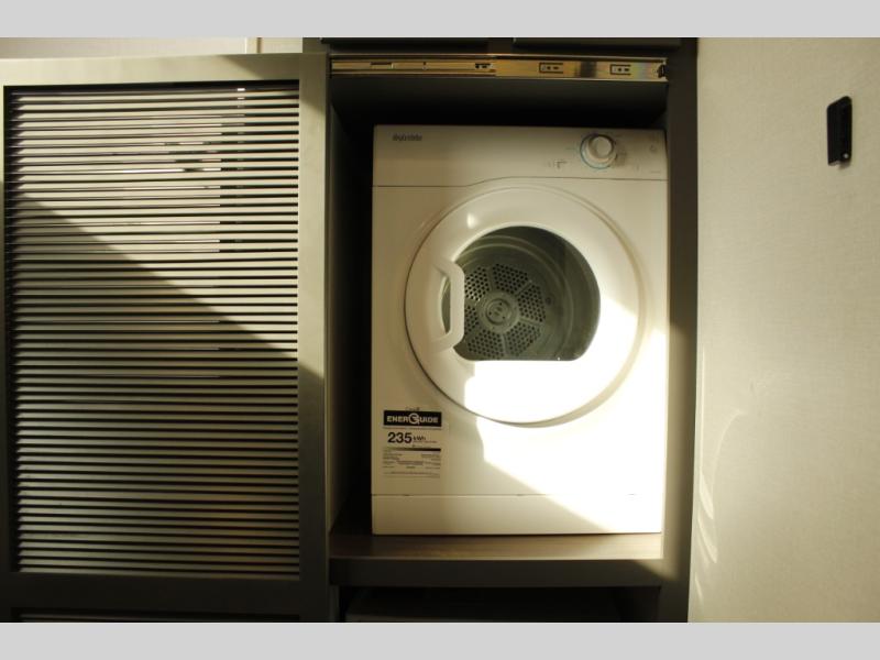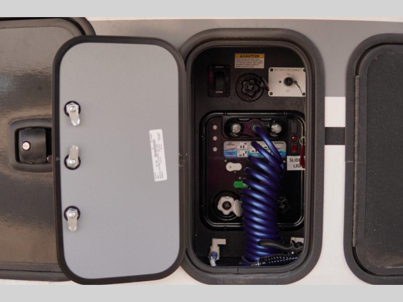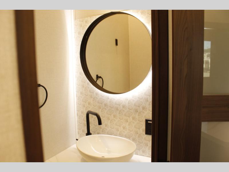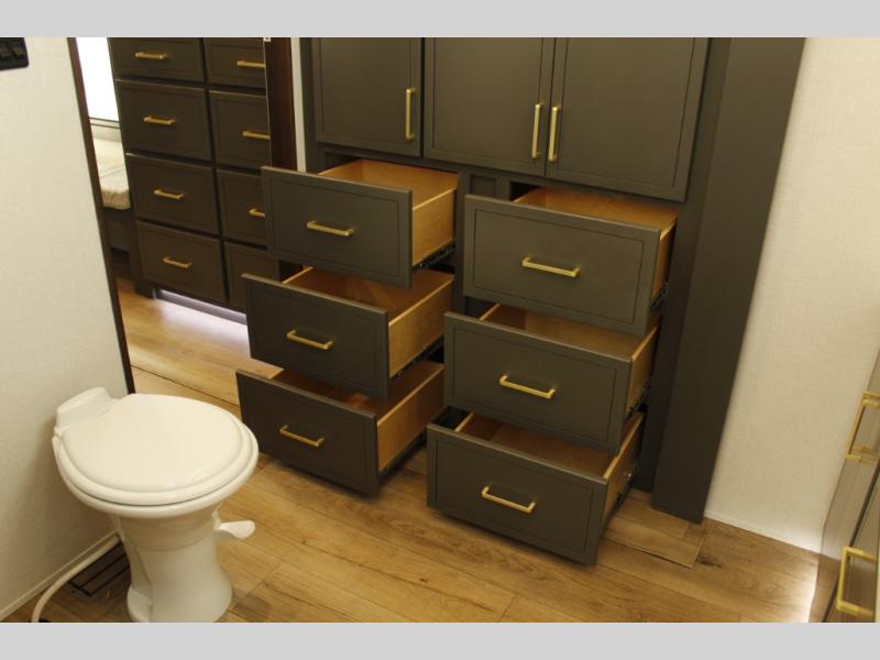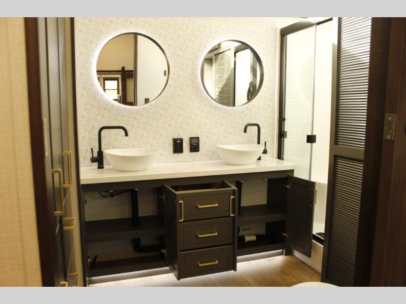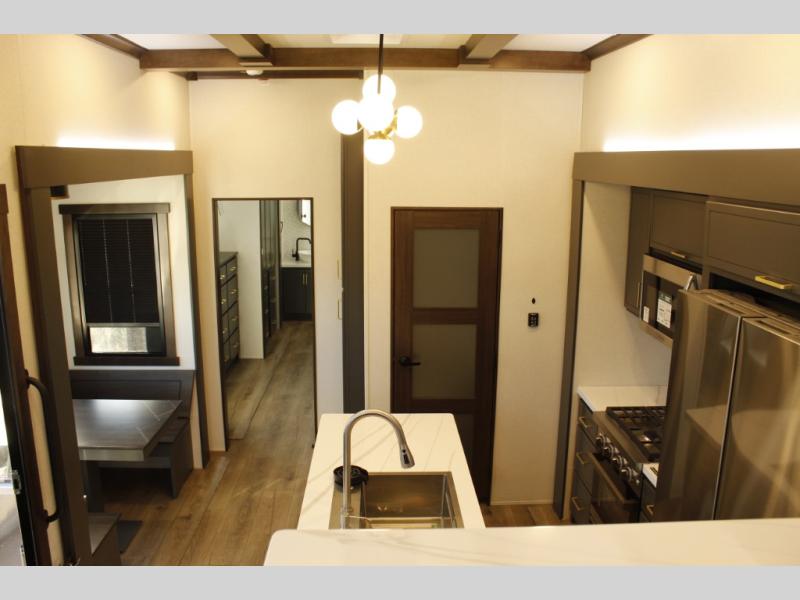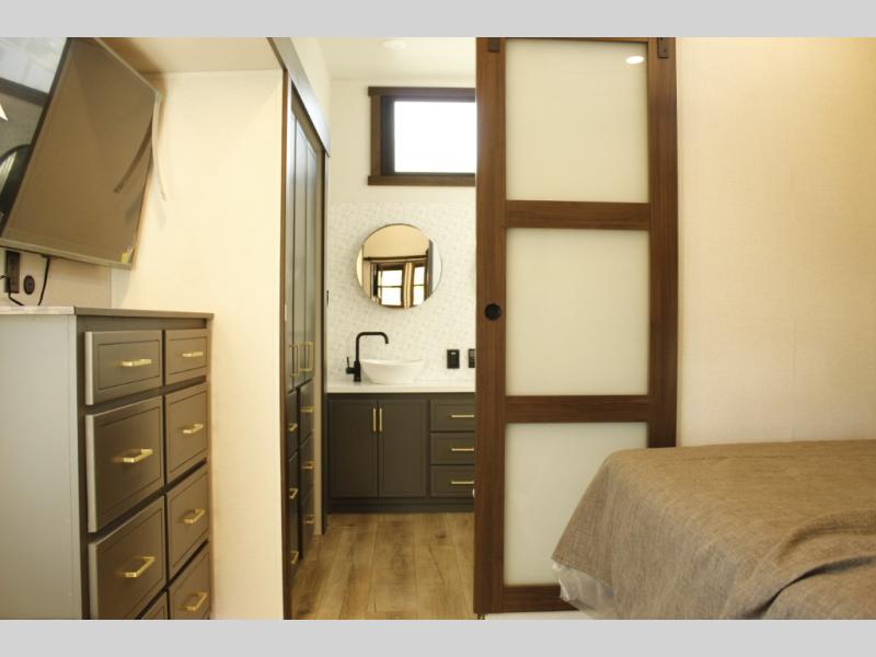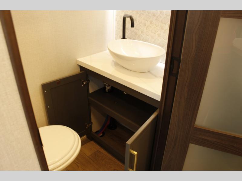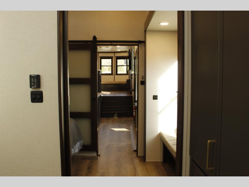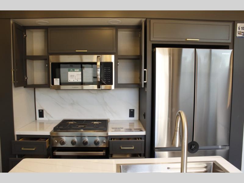 Unwind and refresh in this serene space of the rear bathroom, featuring dual sinks and a spacious linen closet for added convenience and storage. Drift off to sleep surrounded by peaceful surroundings in the private bedroom, complete with a plush king bed, an elegant dresser, and a stunning TV mounted above. The kitchen is a culinary haven, equipped with ample overhead cabinets, a convenient microwave, and a spacious fridge. The ample pantry and second pantry offer ample storage for your favorite ingredients and snacks. Plus, you can enjoy meals with loved ones at the table with swivel chairs! Also, the coat closet and half bath add a touch of practicality, making this fifth wheel perfect for everyday living or extended adventures. The front living room is a vibrant gathering space, featuring a comfortable sectional sofa and a cozy fireplace so you can snuggle up and enjoy quality time with family and friends while watching your favorite shows on the TV!