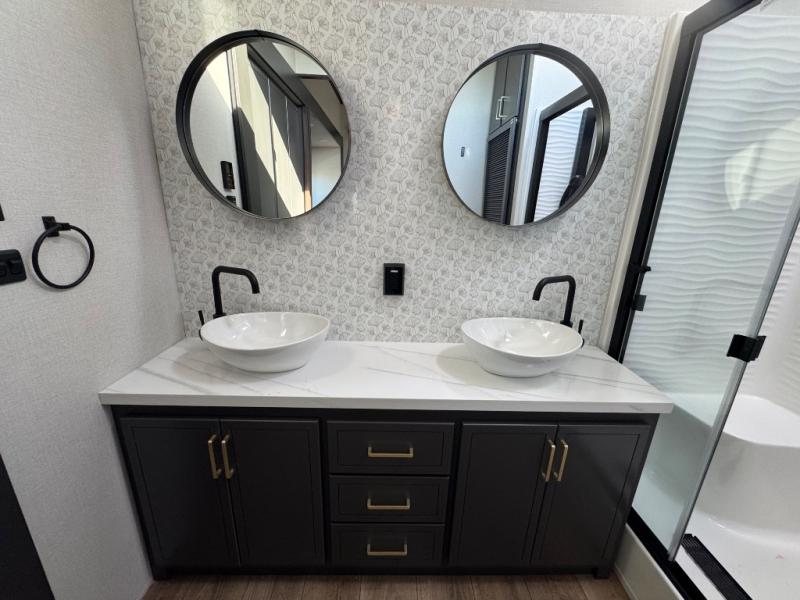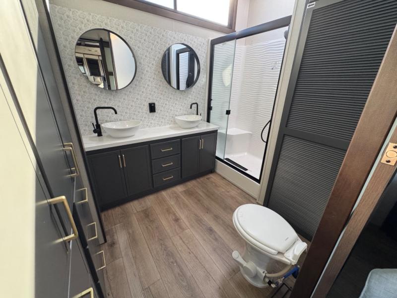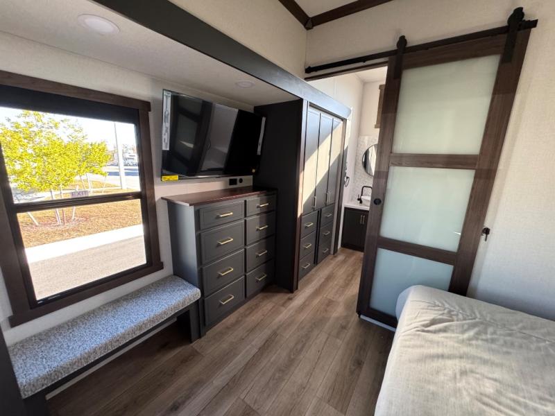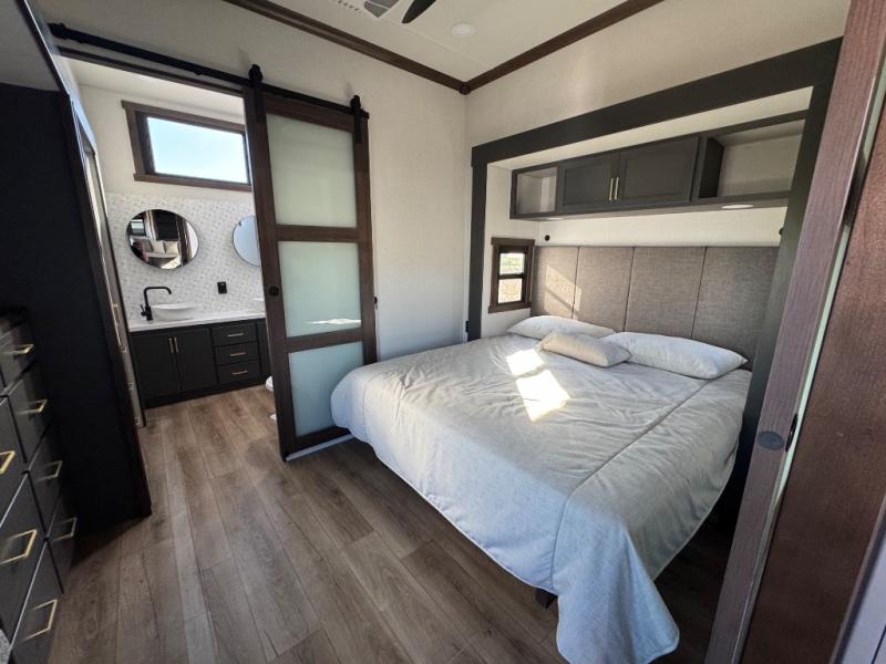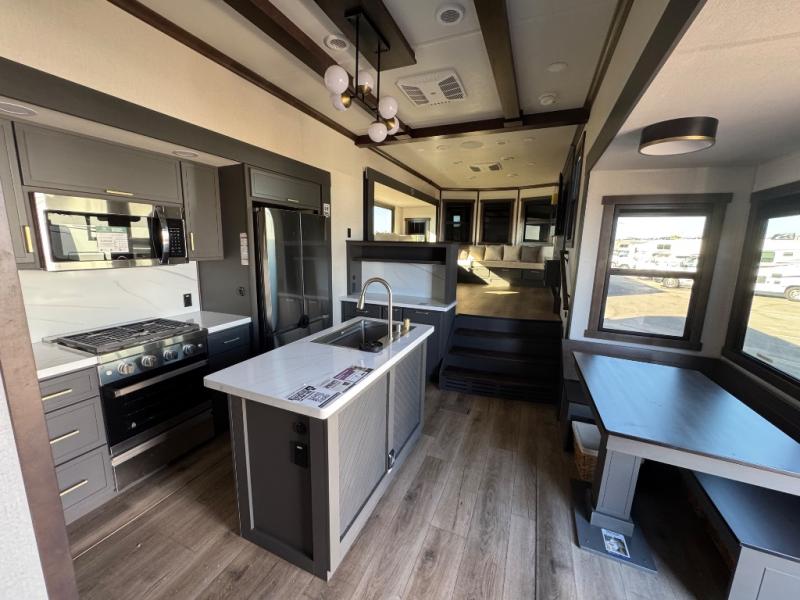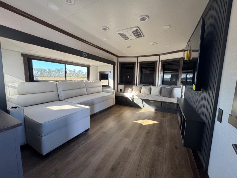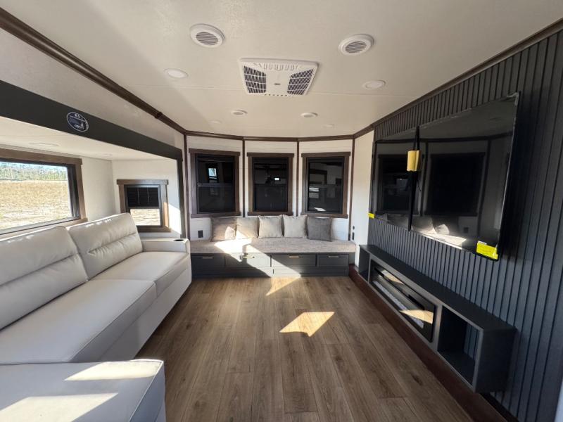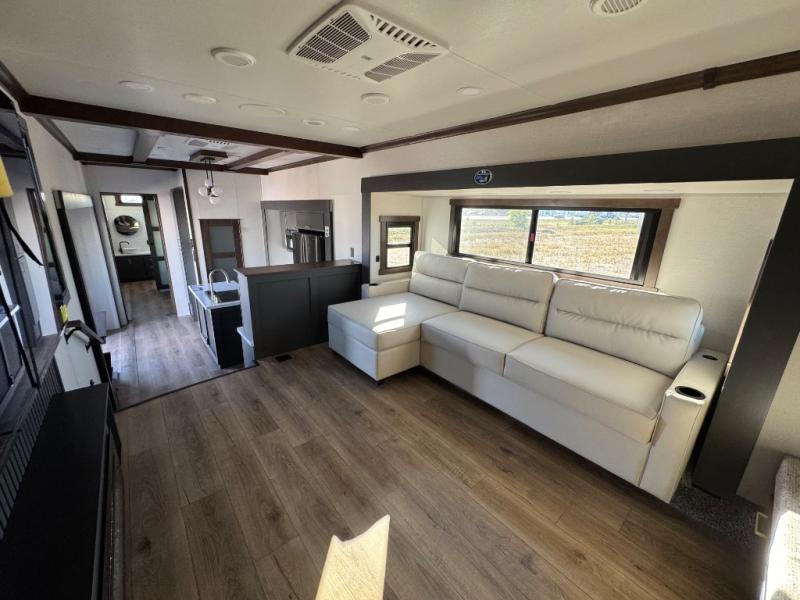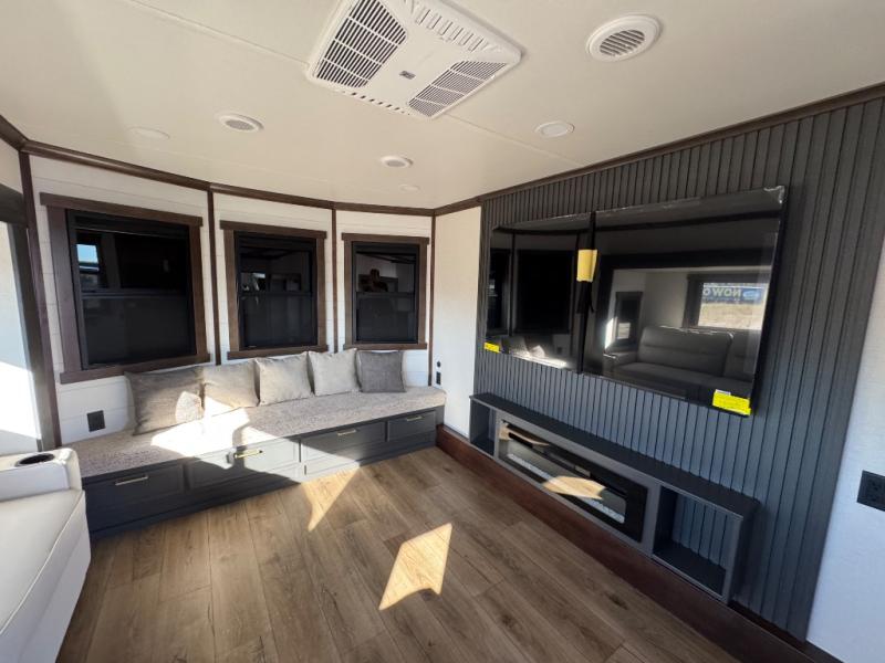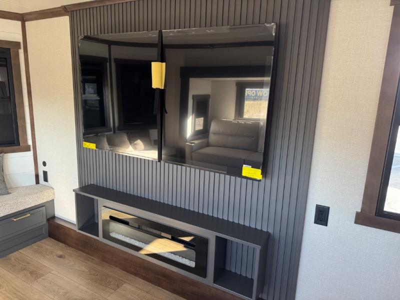 Unwind and refresh in this serene space of the rear bathroom, featuring dual sinks and a spacious linen closet for added convenience and storage. Drift off to sleep surrounded by peaceful surroundings in the private bedroom, complete with a plush king bed, an elegant dresser, and a stunning TV mounted above. The kitchen is a culinary haven, equipped with ample overhead cabinets, a convenient microwave, and a spacious fridge. The ample pantry and second pantry offer ample storage for your favorite ingredients and snacks. Plus, you can enjoy meals with loved ones at the table with swivel chairs! Also, the coat closet and half bath add a touch of practicality, making this fifth wheel perfect for everyday living or extended adventures. The front living room is a vibrant gathering space, featuring a comfortable sectional sofa and a cozy fireplace so you can snuggle up and enjoy quality time with family and friends while watching your favorite shows on the TV!