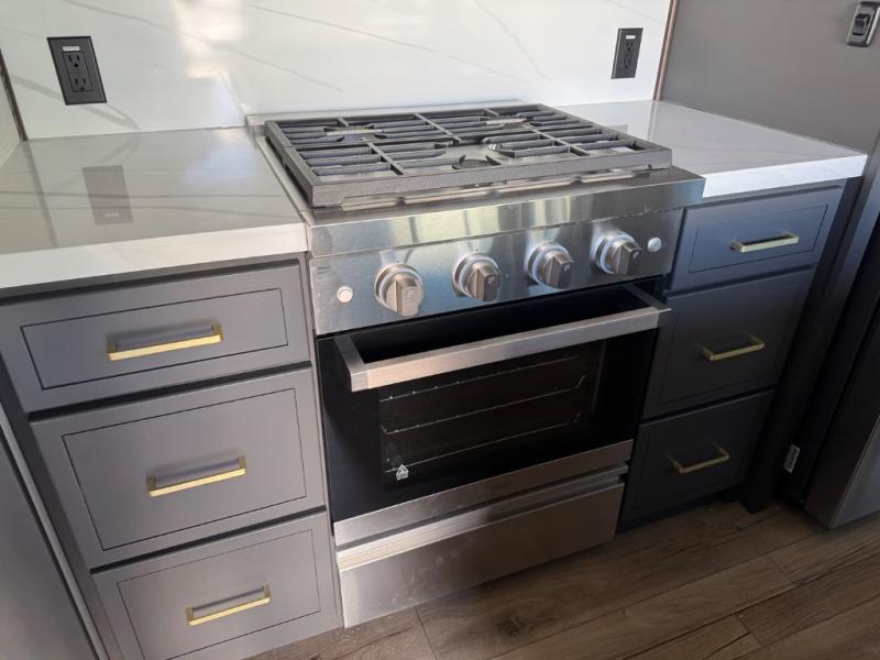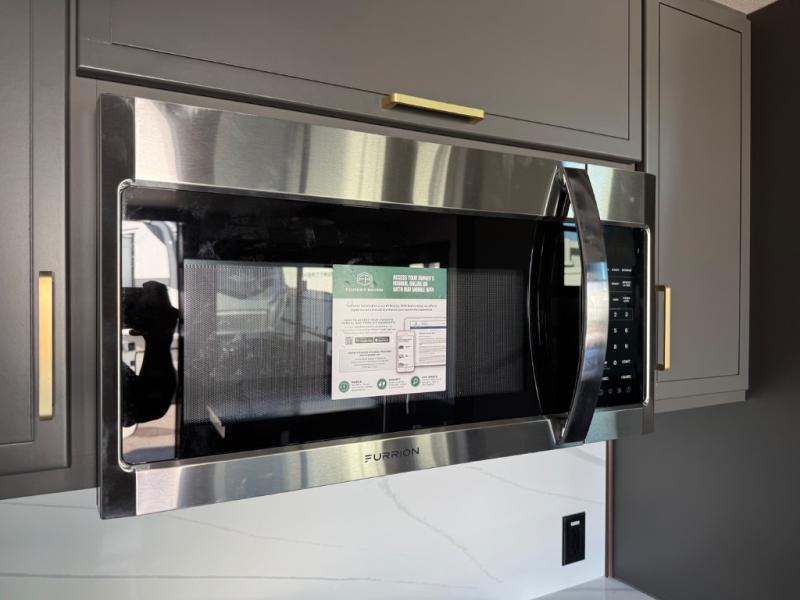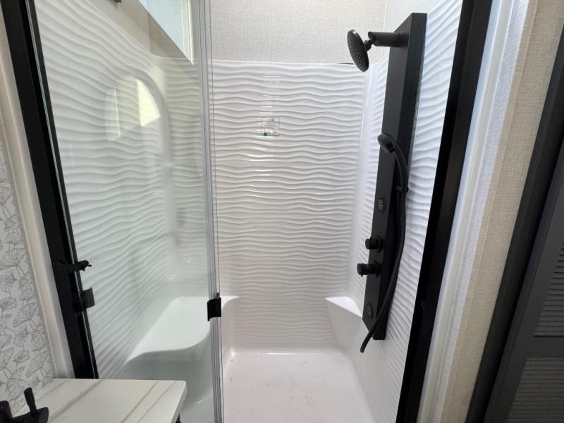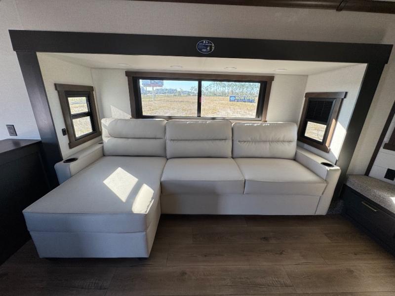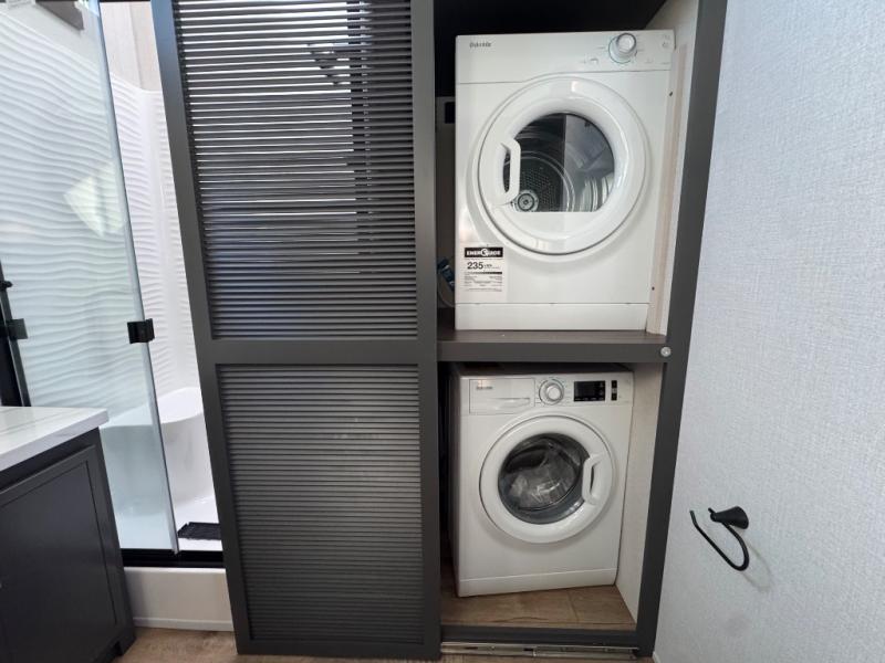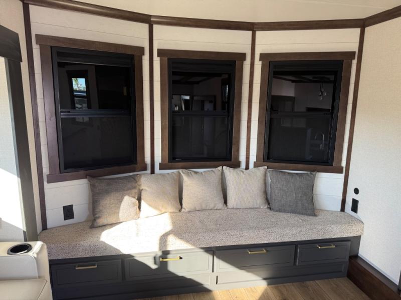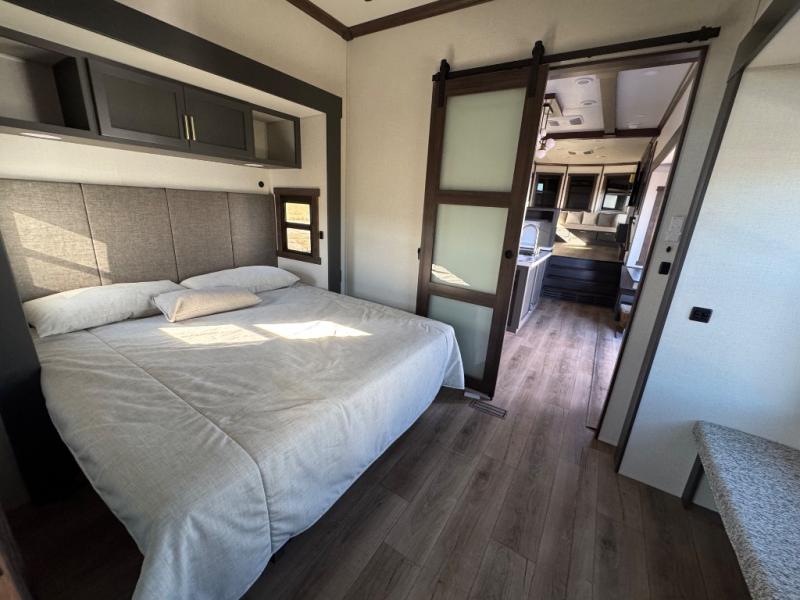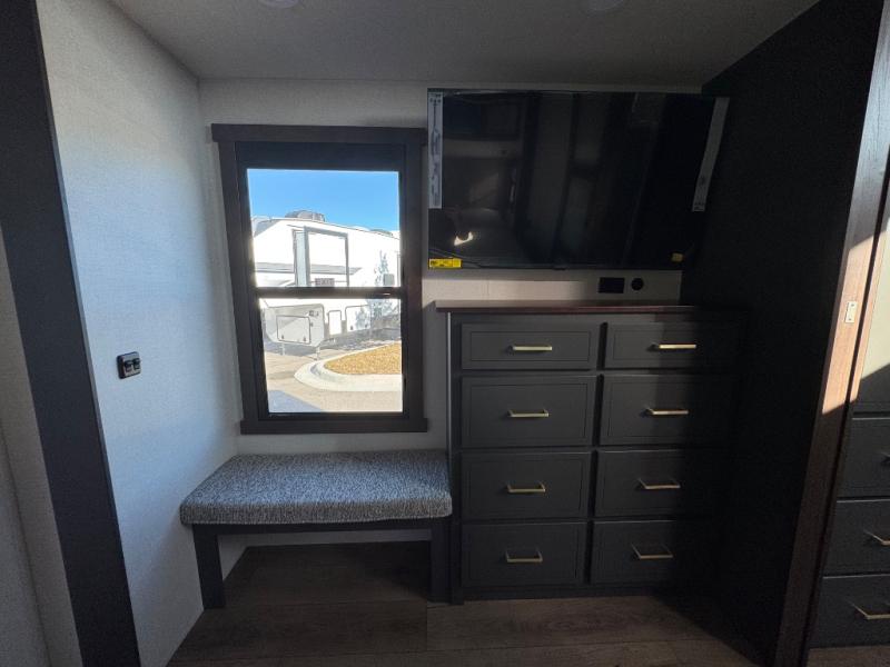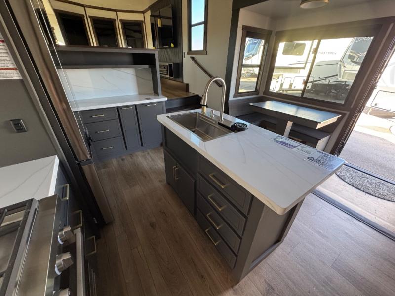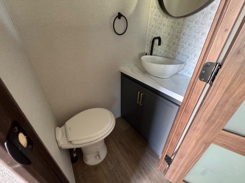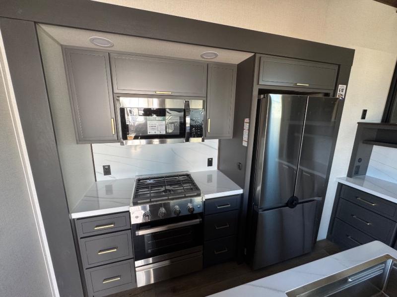 Unwind and refresh in this serene space of the rear bathroom, featuring dual sinks and a spacious linen closet for added convenience and storage. Drift off to sleep surrounded by peaceful surroundings in the private bedroom, complete with a plush king bed, an elegant dresser, and a stunning TV mounted above. The kitchen is a culinary haven, equipped with ample overhead cabinets, a convenient microwave, and a spacious fridge. The ample pantry and second pantry offer ample storage for your favorite ingredients and snacks. Plus, you can enjoy meals with loved ones at the table with swivel chairs! Also, the coat closet and half bath add a touch of practicality, making this fifth wheel perfect for everyday living or extended adventures. The front living room is a vibrant gathering space, featuring a comfortable sectional sofa and a cozy fireplace so you can snuggle up and enjoy quality time with family and friends while watching your favorite shows on the TV!