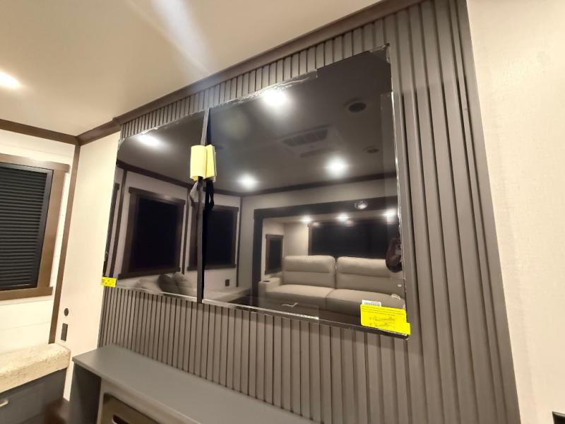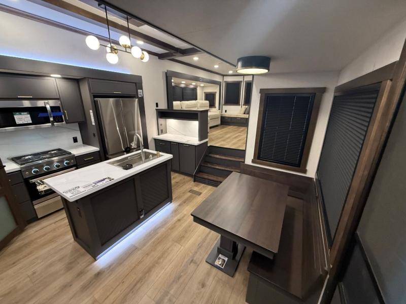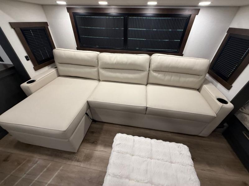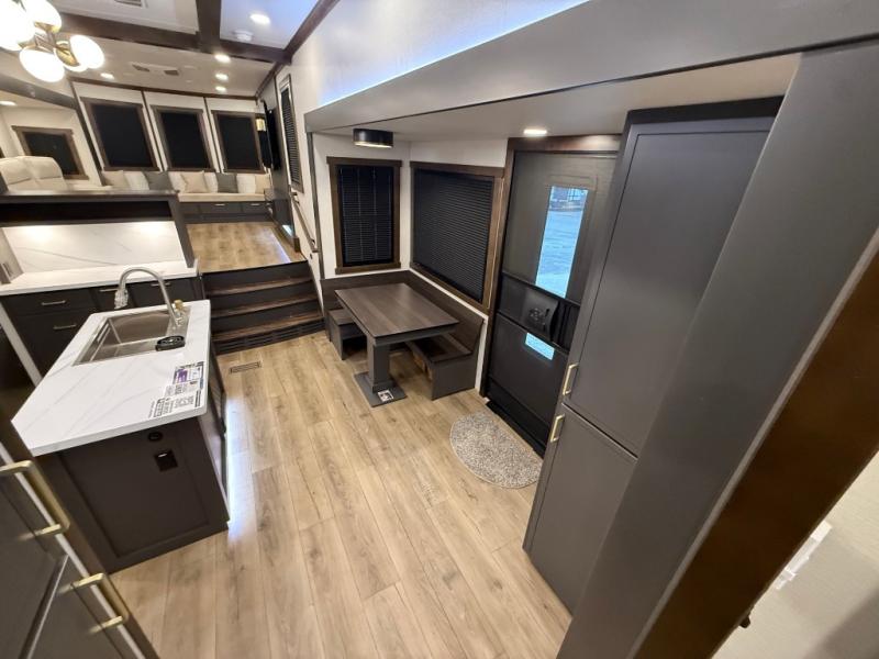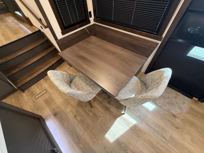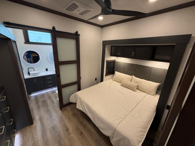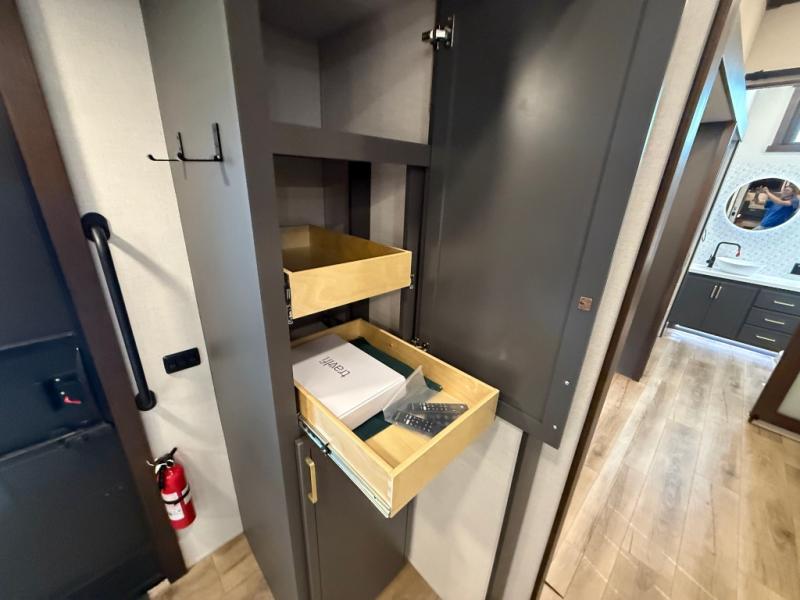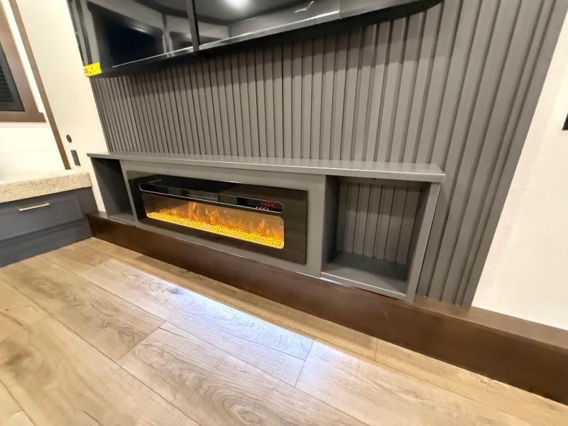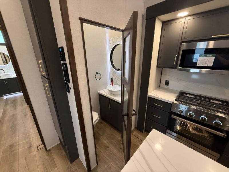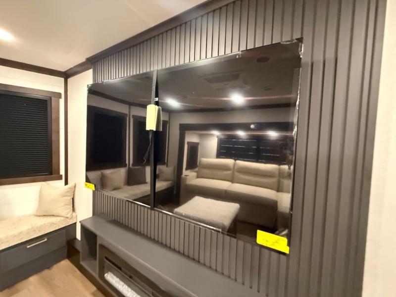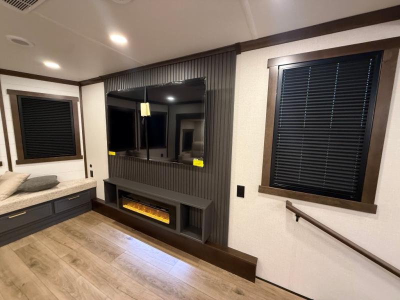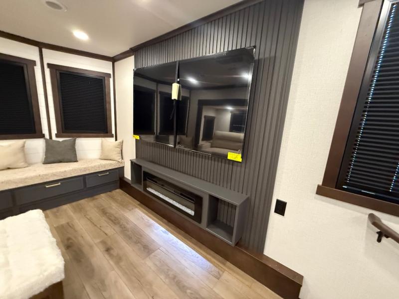 Unwind and refresh in this serene space of the rear bathroom, featuring dual sinks and a spacious linen closet for added convenience and storage. Drift off to sleep surrounded by peaceful surroundings in the private bedroom, complete with a plush king bed, an elegant dresser, and a stunning TV mounted above. The kitchen is a culinary haven, equipped with ample overhead cabinets, a convenient microwave, and a spacious fridge. The ample pantry and second pantry offer ample storage for your favorite ingredients and snacks. Plus, you can enjoy meals with loved ones at the table with swivel chairs! Also, the coat closet and half bath add a touch of practicality, making this fifth wheel perfect for everyday living or extended adventures. The front living room is a vibrant gathering space, featuring a comfortable sectional sofa and a cozy fireplace so you can snuggle up and enjoy quality time with family and friends while watching your favorite shows on the TV!