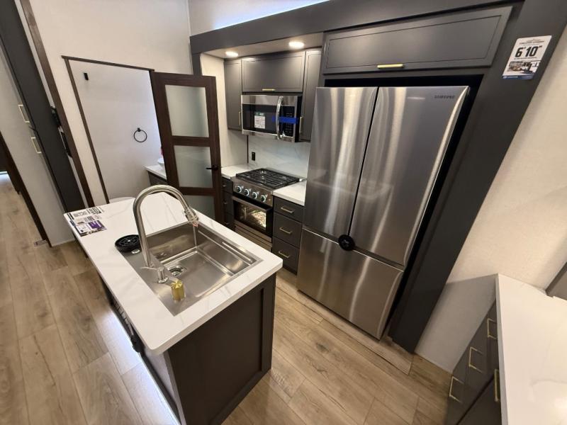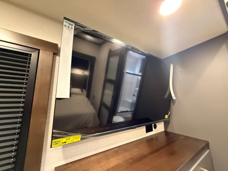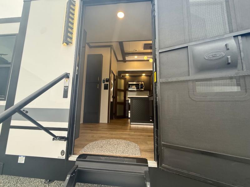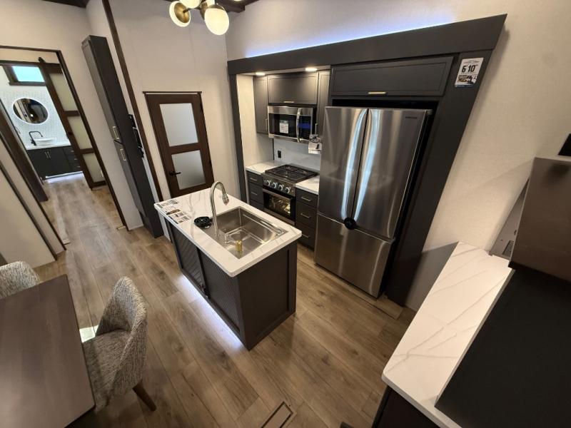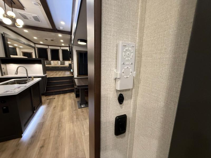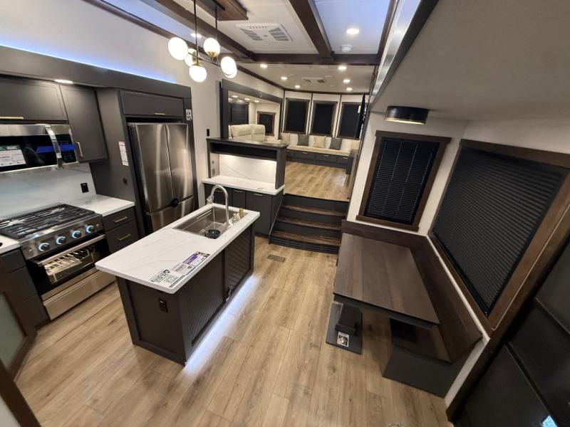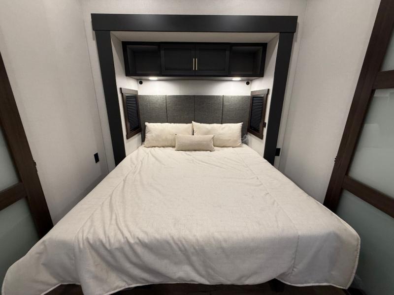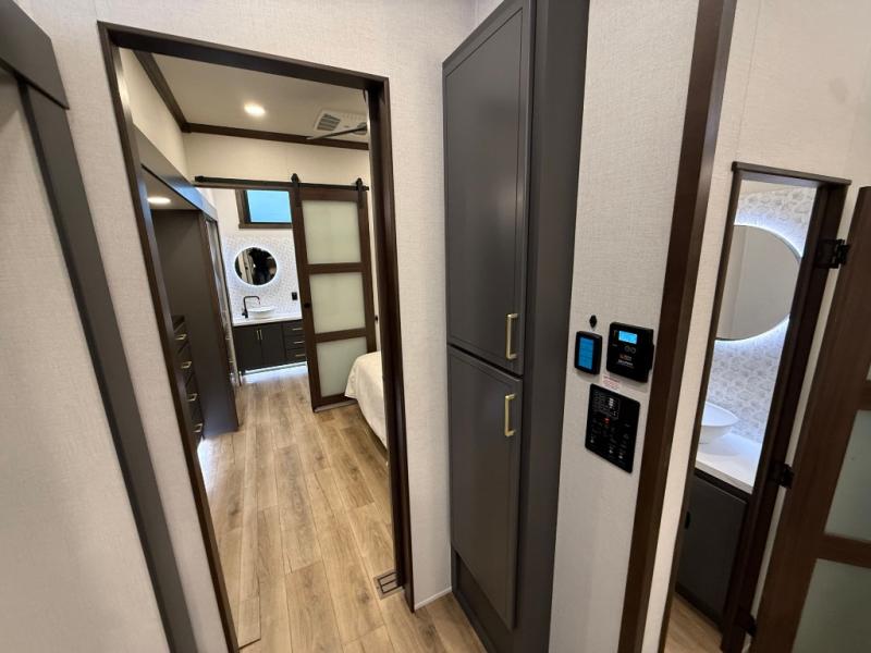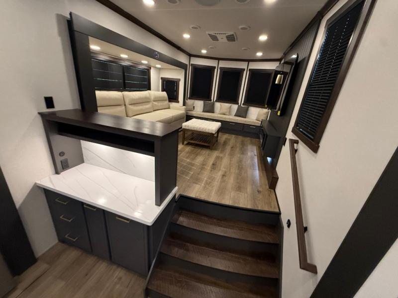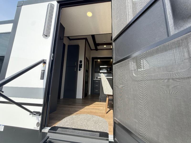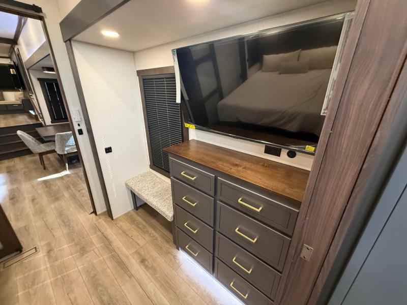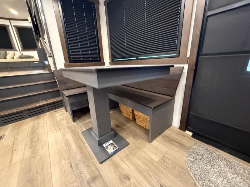 Unwind and refresh in this serene space of the rear bathroom, featuring dual sinks and a spacious linen closet for added convenience and storage. Drift off to sleep surrounded by peaceful surroundings in the private bedroom, complete with a plush king bed, an elegant dresser, and a stunning TV mounted above. The kitchen is a culinary haven, equipped with ample overhead cabinets, a convenient microwave, and a spacious fridge. The ample pantry and second pantry offer ample storage for your favorite ingredients and snacks. Plus, you can enjoy meals with loved ones at the table with swivel chairs! Also, the coat closet and half bath add a touch of practicality, making this fifth wheel perfect for everyday living or extended adventures. The front living room is a vibrant gathering space, featuring a comfortable sectional sofa and a cozy fireplace so you can snuggle up and enjoy quality time with family and friends while watching your favorite shows on the TV!