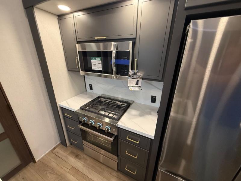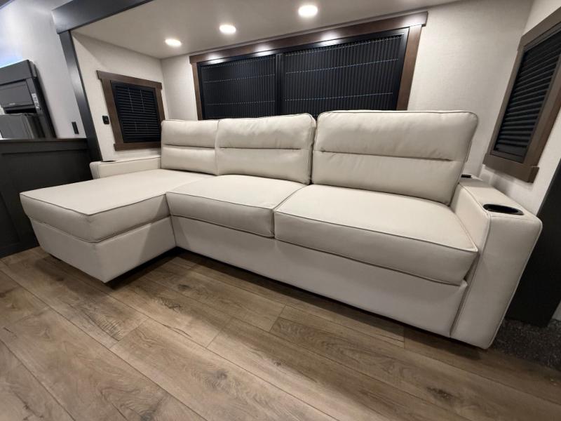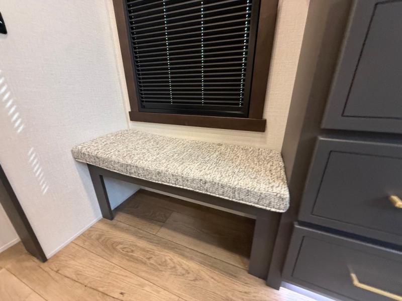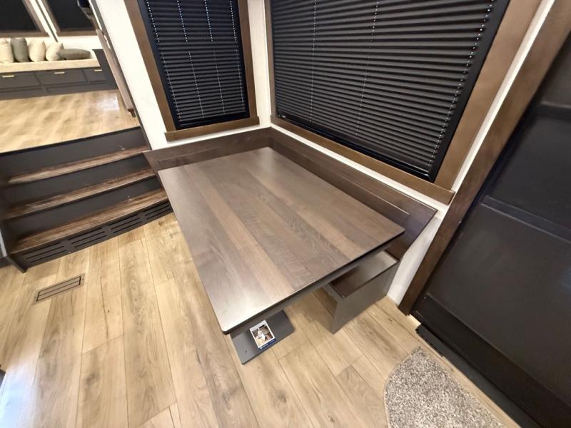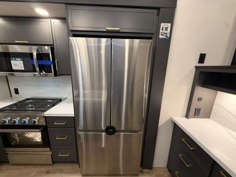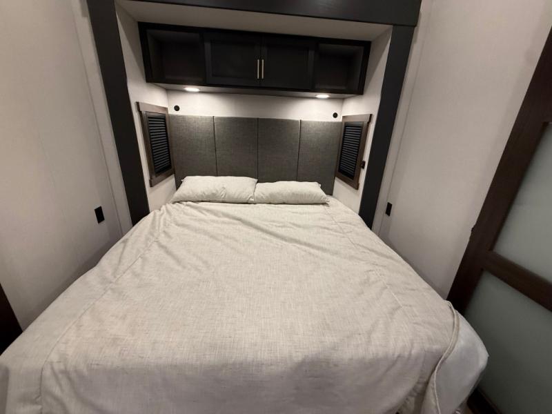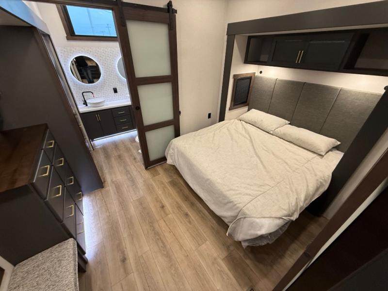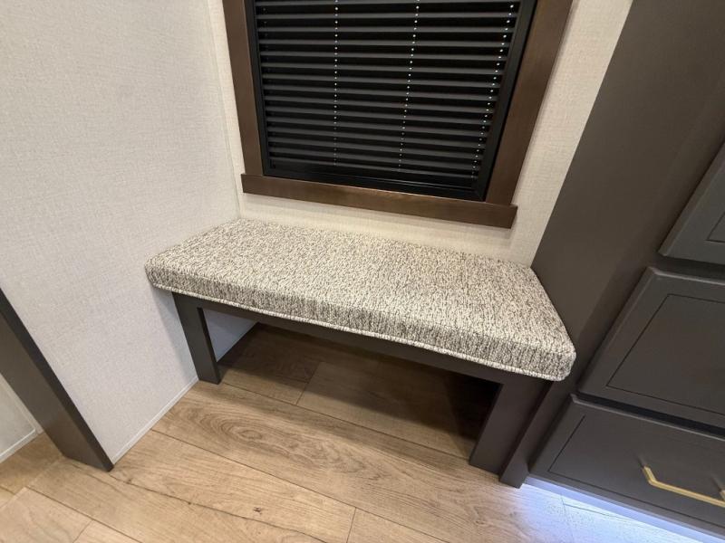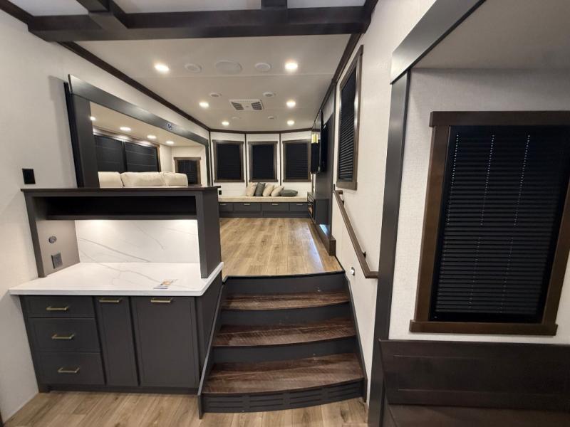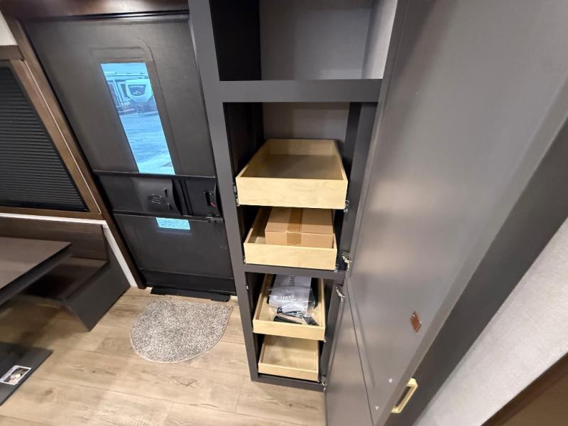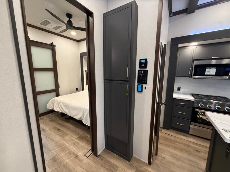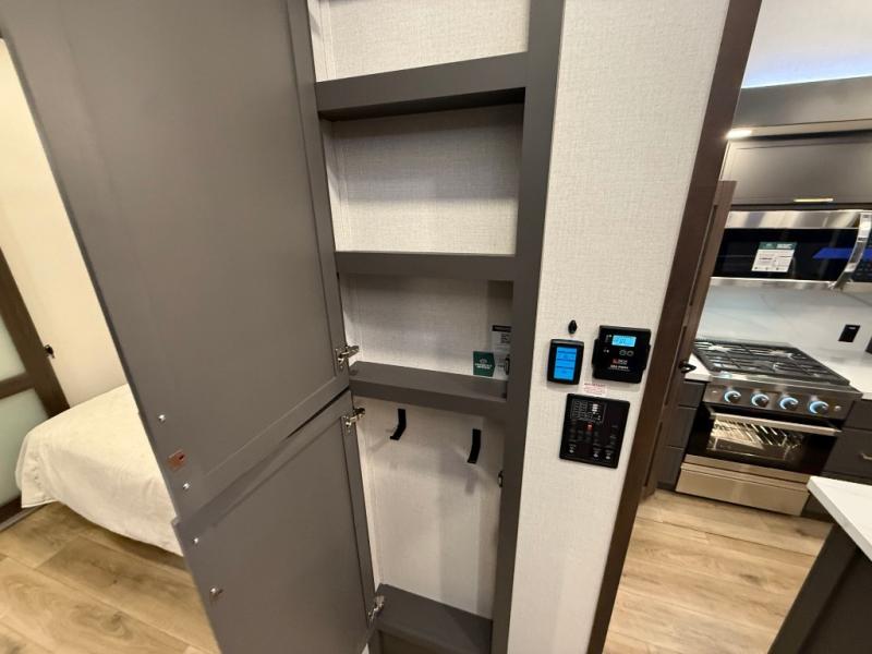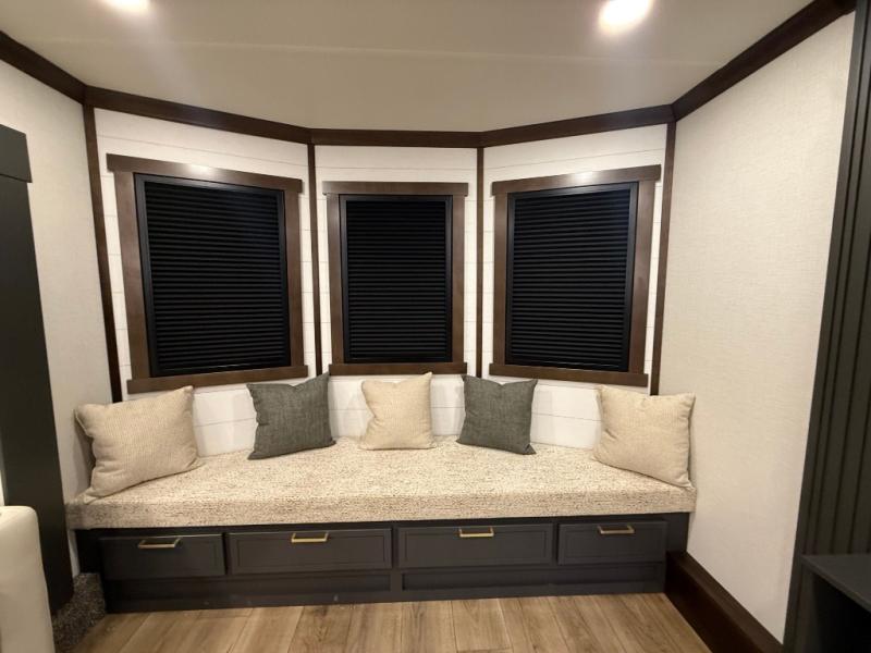 Unwind and refresh in this serene space of the rear bathroom, featuring dual sinks and a spacious linen closet for added convenience and storage. Drift off to sleep surrounded by peaceful surroundings in the private bedroom, complete with a plush king bed, an elegant dresser, and a stunning TV mounted above. The kitchen is a culinary haven, equipped with ample overhead cabinets, a convenient microwave, and a spacious fridge. The ample pantry and second pantry offer ample storage for your favorite ingredients and snacks. Plus, you can enjoy meals with loved ones at the table with swivel chairs! Also, the coat closet and half bath add a touch of practicality, making this fifth wheel perfect for everyday living or extended adventures. The front living room is a vibrant gathering space, featuring a comfortable sectional sofa and a cozy fireplace so you can snuggle up and enjoy quality time with family and friends while watching your favorite shows on the TV!