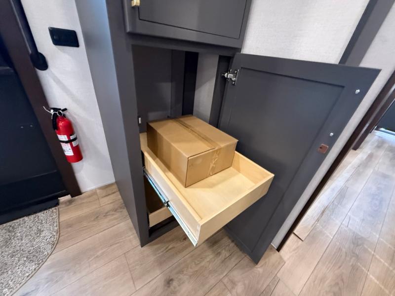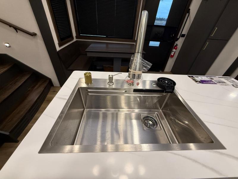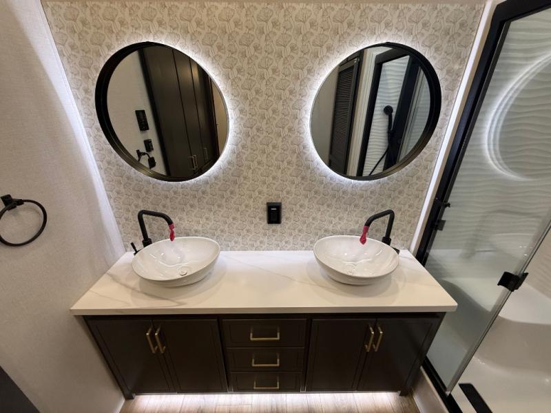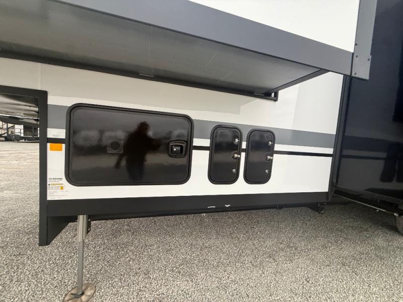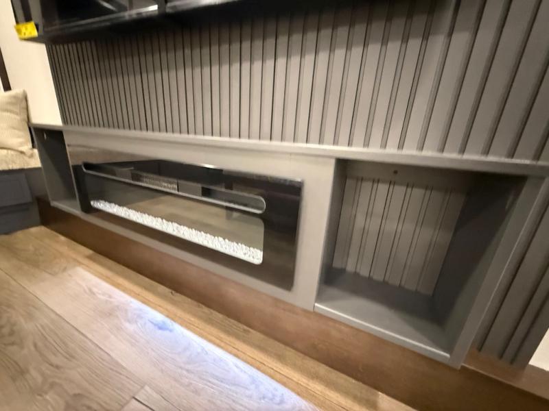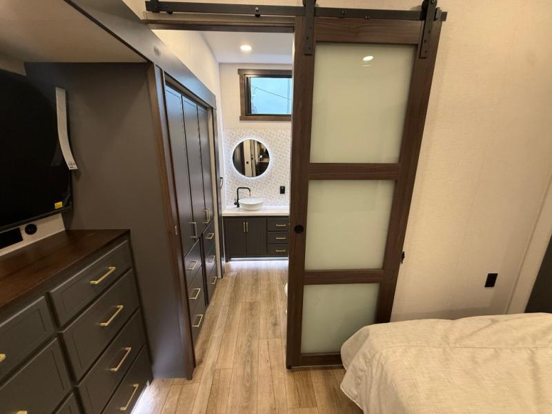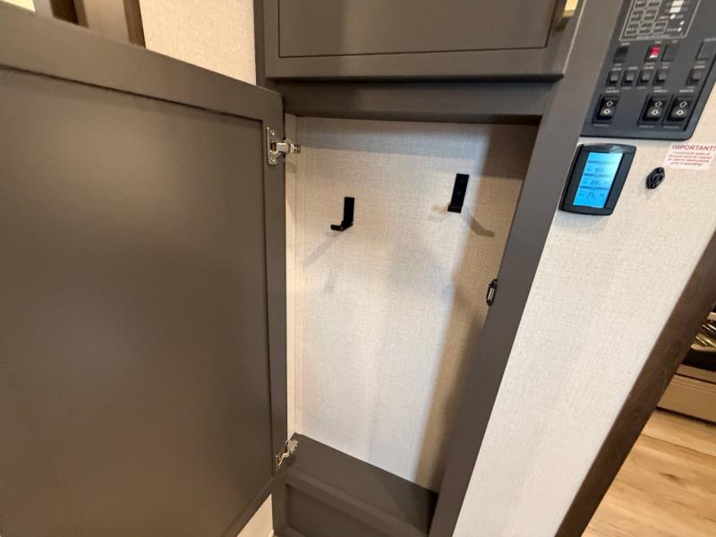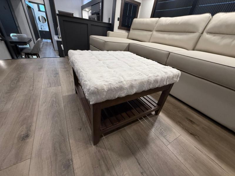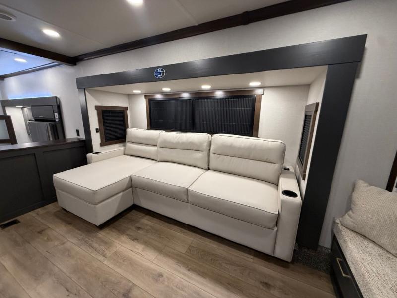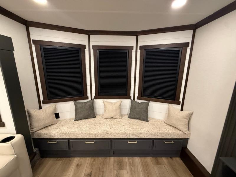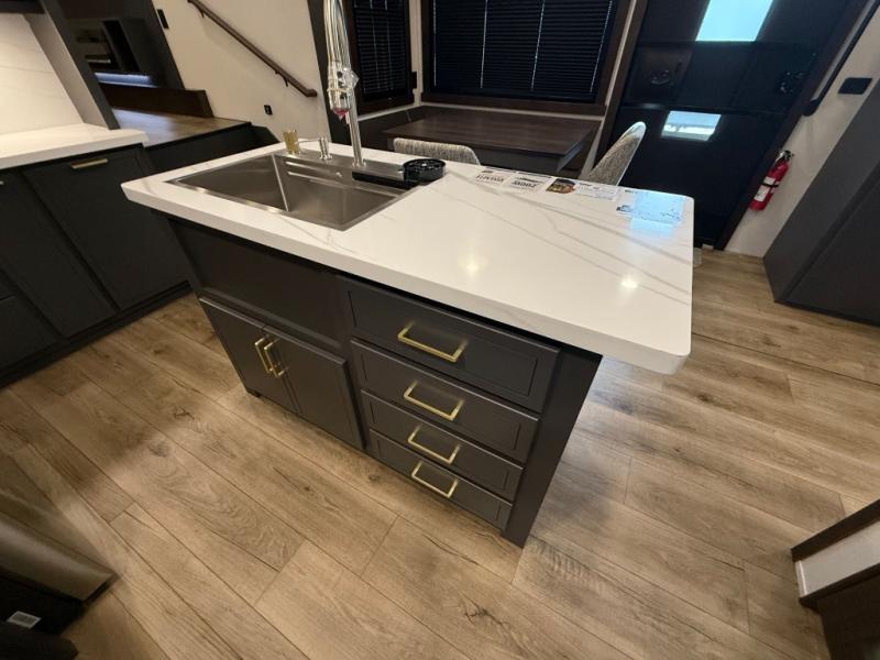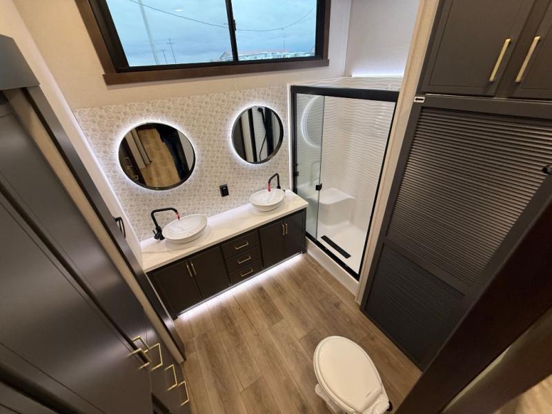 Unwind and refresh in this serene space of the rear bathroom, featuring dual sinks and a spacious linen closet for added convenience and storage. Drift off to sleep surrounded by peaceful surroundings in the private bedroom, complete with a plush king bed, an elegant dresser, and a stunning TV mounted above. The kitchen is a culinary haven, equipped with ample overhead cabinets, a convenient microwave, and a spacious fridge. The ample pantry and second pantry offer ample storage for your favorite ingredients and snacks. Plus, you can enjoy meals with loved ones at the table with swivel chairs! Also, the coat closet and half bath add a touch of practicality, making this fifth wheel perfect for everyday living or extended adventures. The front living room is a vibrant gathering space, featuring a comfortable sectional sofa and a cozy fireplace so you can snuggle up and enjoy quality time with family and friends while watching your favorite shows on the TV!