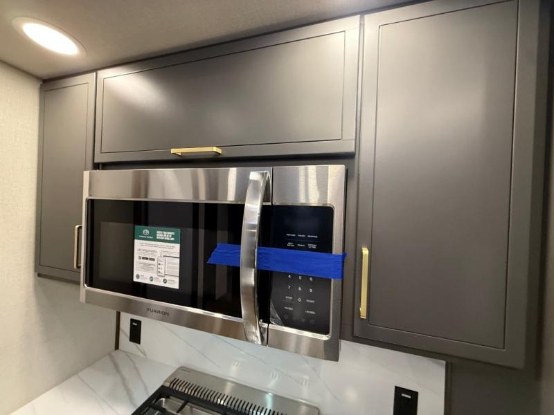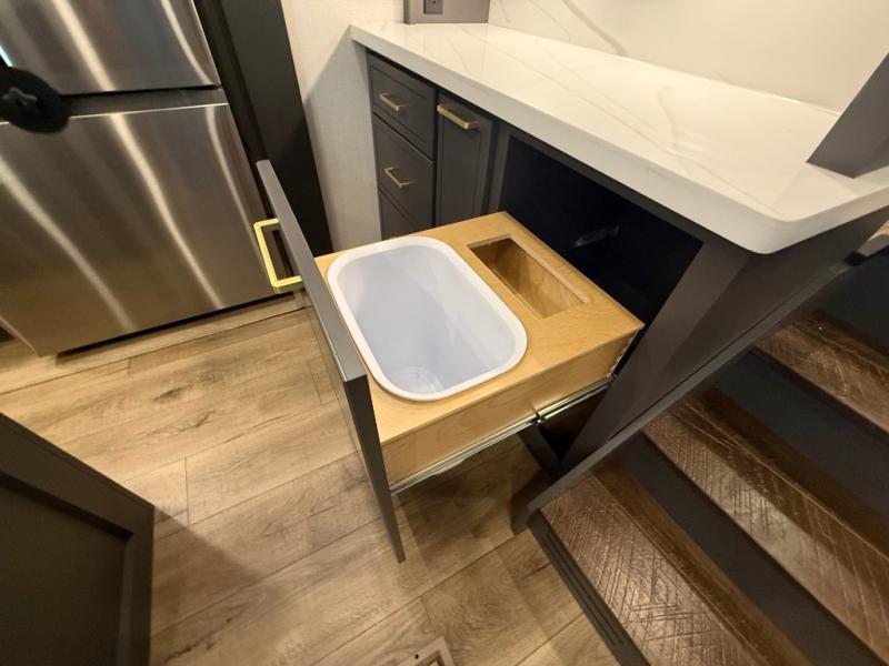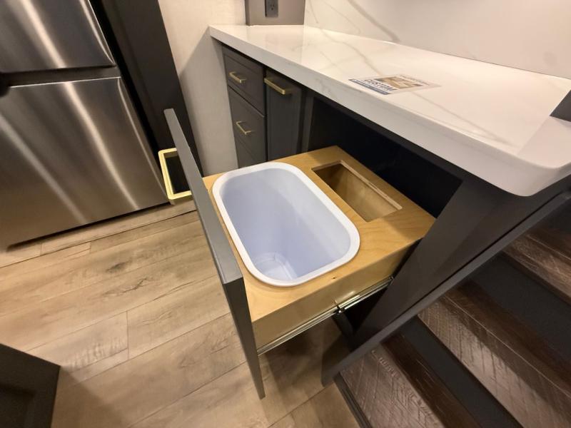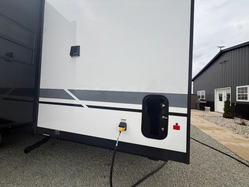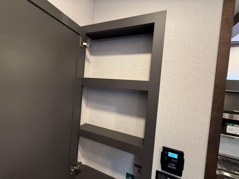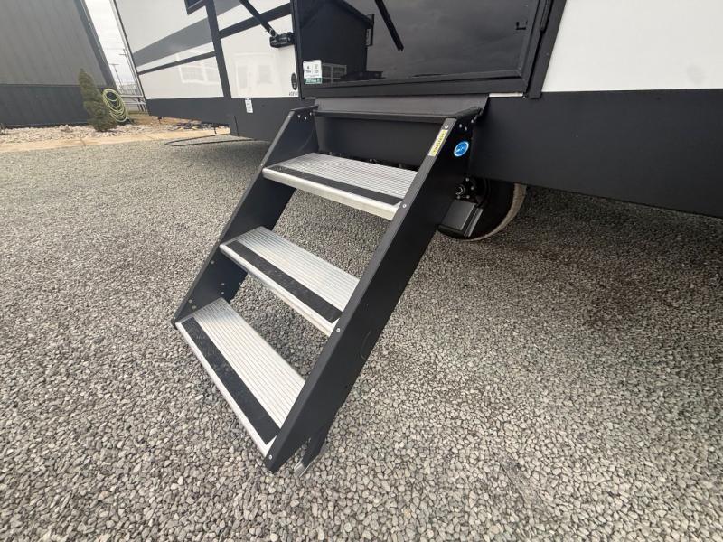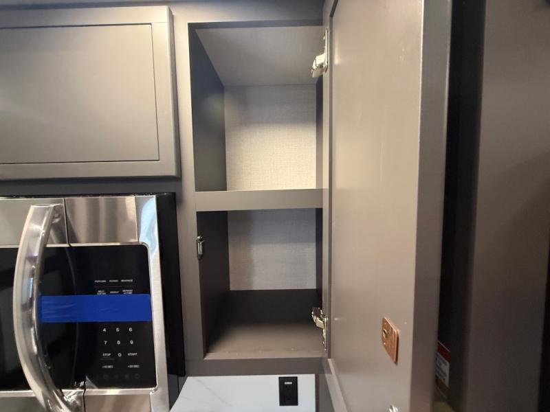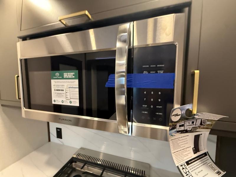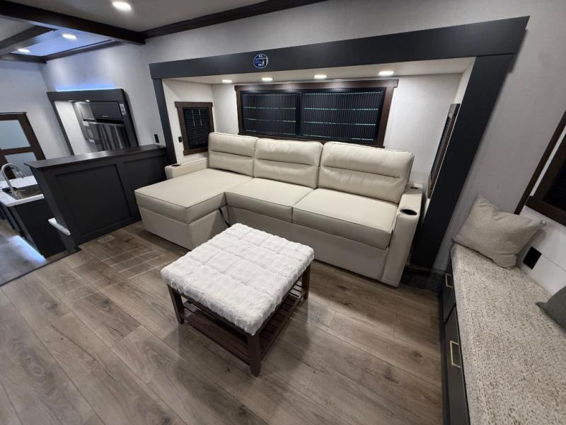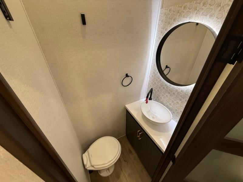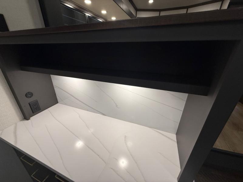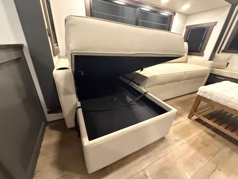 Unwind and refresh in this serene space of the rear bathroom, featuring dual sinks and a spacious linen closet for added convenience and storage. Drift off to sleep surrounded by peaceful surroundings in the private bedroom, complete with a plush king bed, an elegant dresser, and a stunning TV mounted above. The kitchen is a culinary haven, equipped with ample overhead cabinets, a convenient microwave, and a spacious fridge. The ample pantry and second pantry offer ample storage for your favorite ingredients and snacks. Plus, you can enjoy meals with loved ones at the table with swivel chairs! Also, the coat closet and half bath add a touch of practicality, making this fifth wheel perfect for everyday living or extended adventures. The front living room is a vibrant gathering space, featuring a comfortable sectional sofa and a cozy fireplace so you can snuggle up and enjoy quality time with family and friends while watching your favorite shows on the TV!