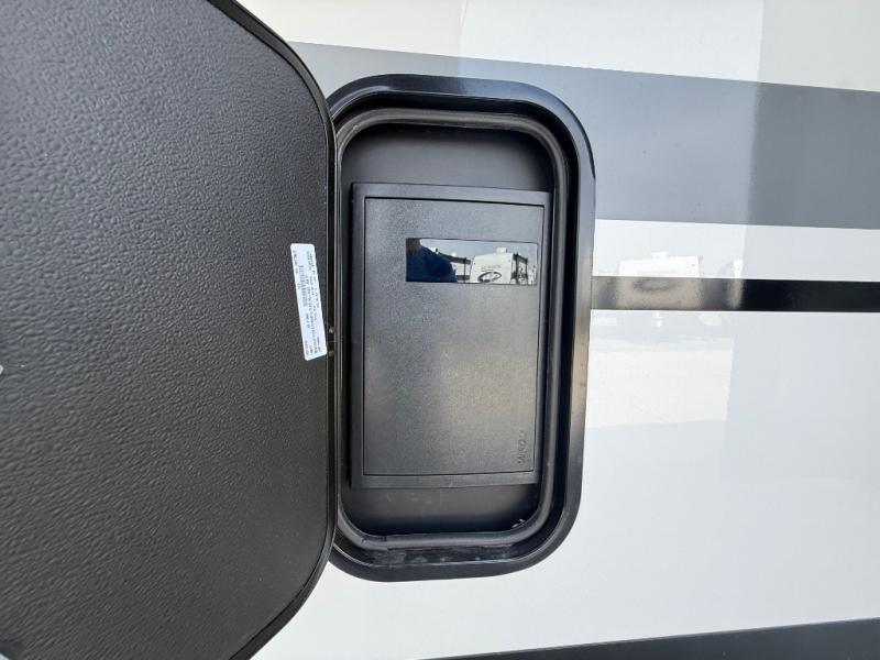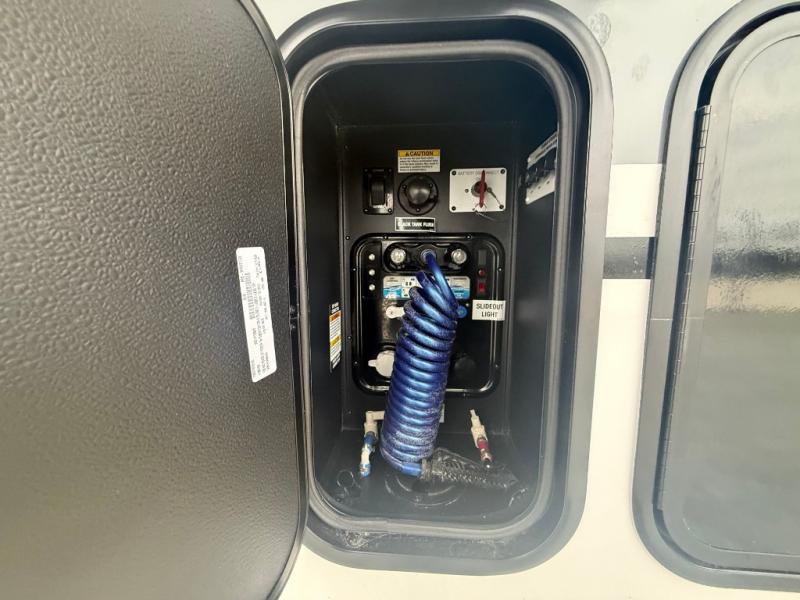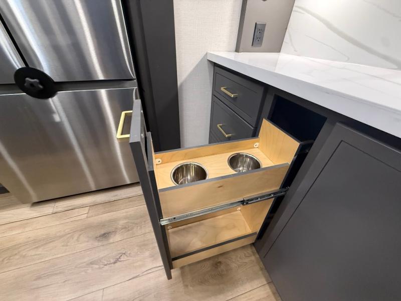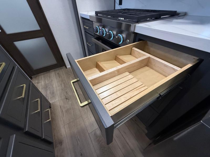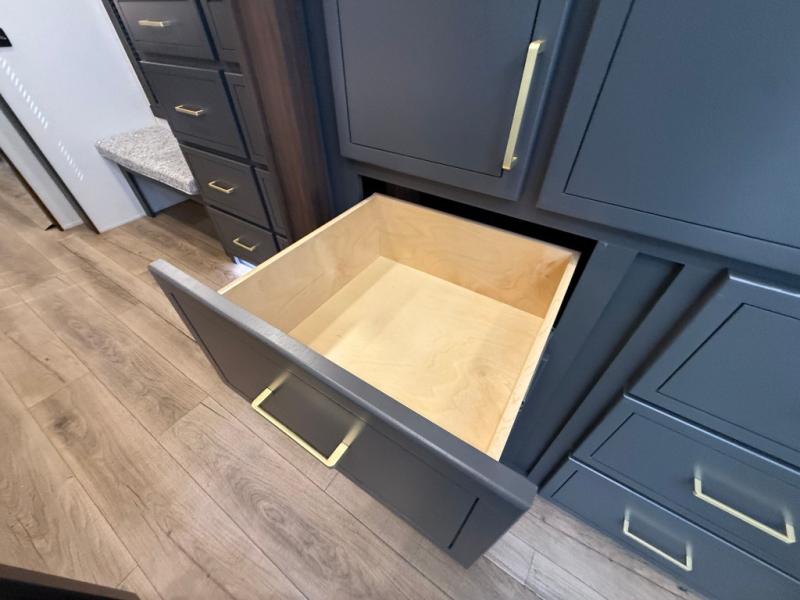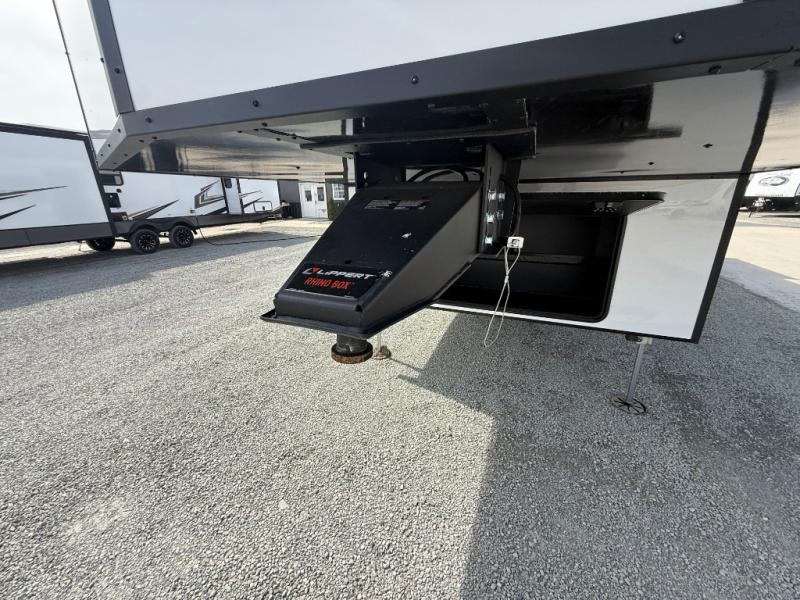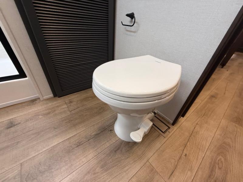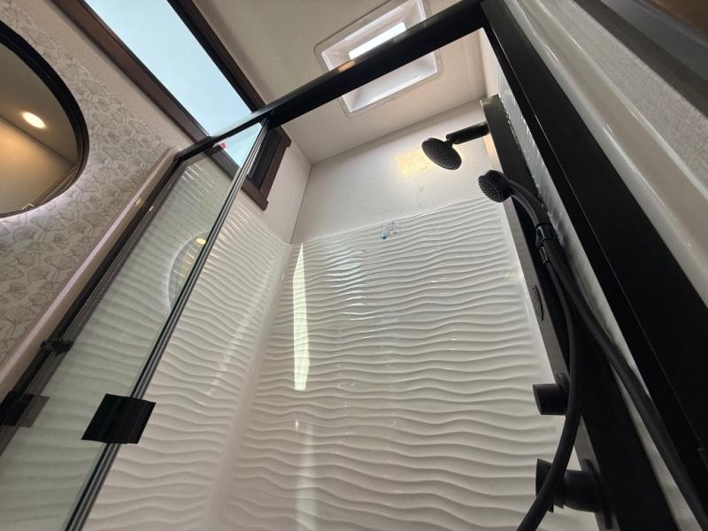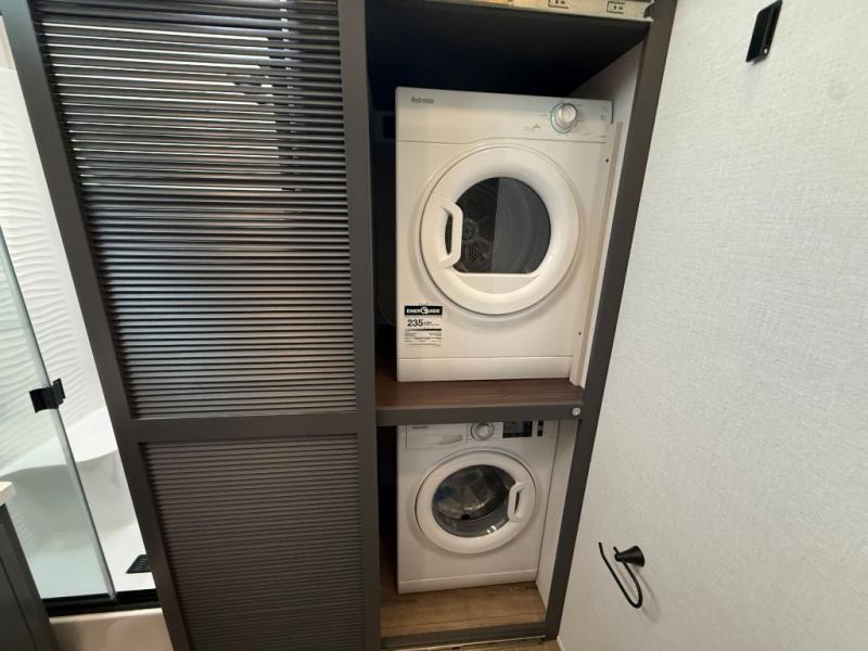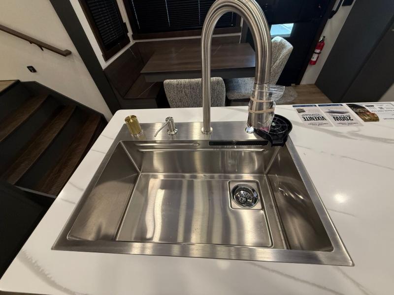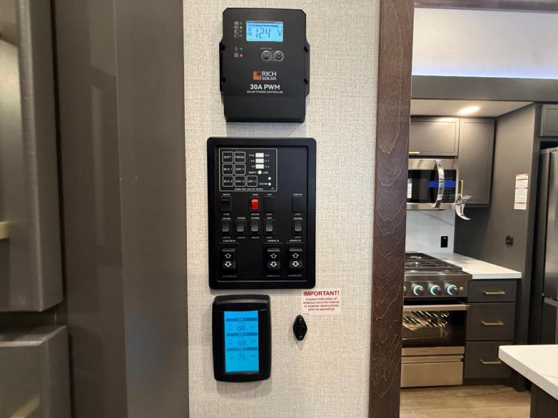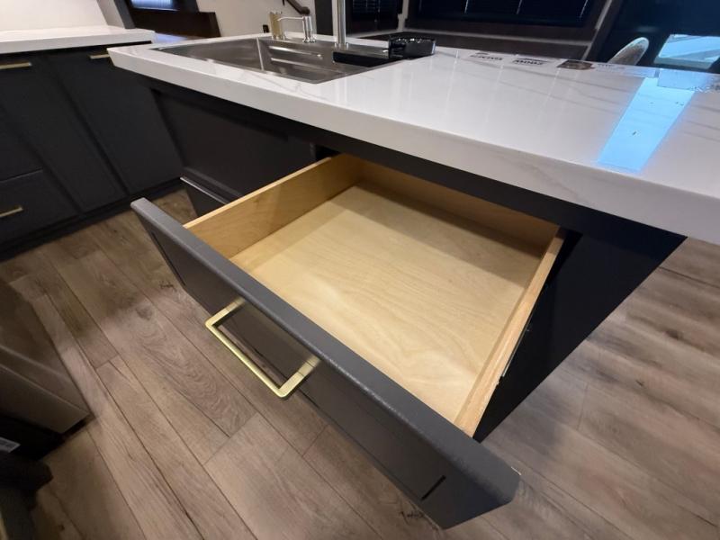 Unwind and refresh in this serene space of the rear bathroom, featuring dual sinks and a spacious linen closet for added convenience and storage. Drift off to sleep surrounded by peaceful surroundings in the private bedroom, complete with a plush king bed, an elegant dresser, and a stunning TV mounted above. The kitchen is a culinary haven, equipped with ample overhead cabinets, a convenient microwave, and a spacious fridge. The ample pantry and second pantry offer ample storage for your favorite ingredients and snacks. Plus, you can enjoy meals with loved ones at the table with swivel chairs! Also, the coat closet and half bath add a touch of practicality, making this fifth wheel perfect for everyday living or extended adventures. The front living room is a vibrant gathering space, featuring a comfortable sectional sofa and a cozy fireplace so you can snuggle up and enjoy quality time with family and friends while watching your favorite shows on the TV!