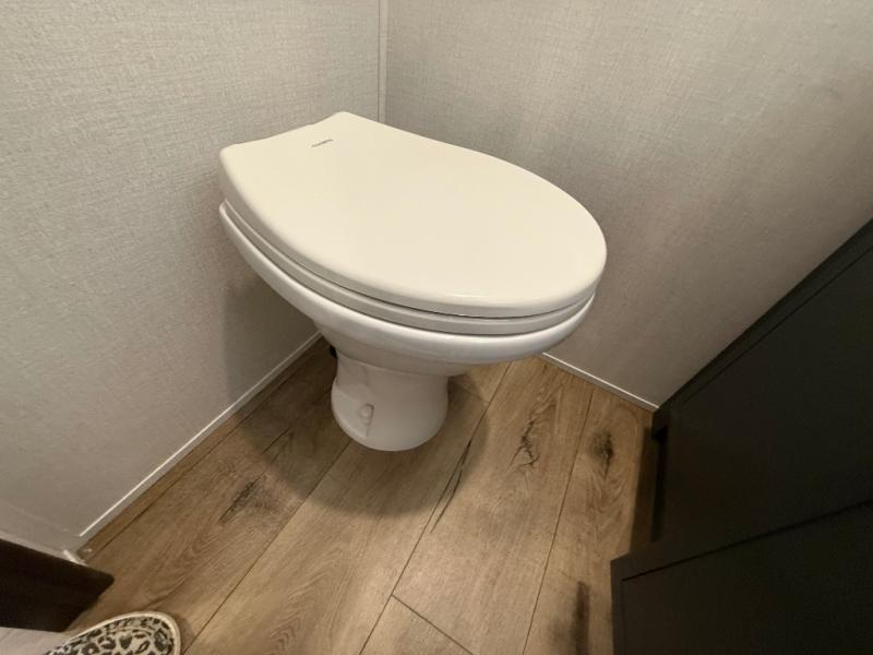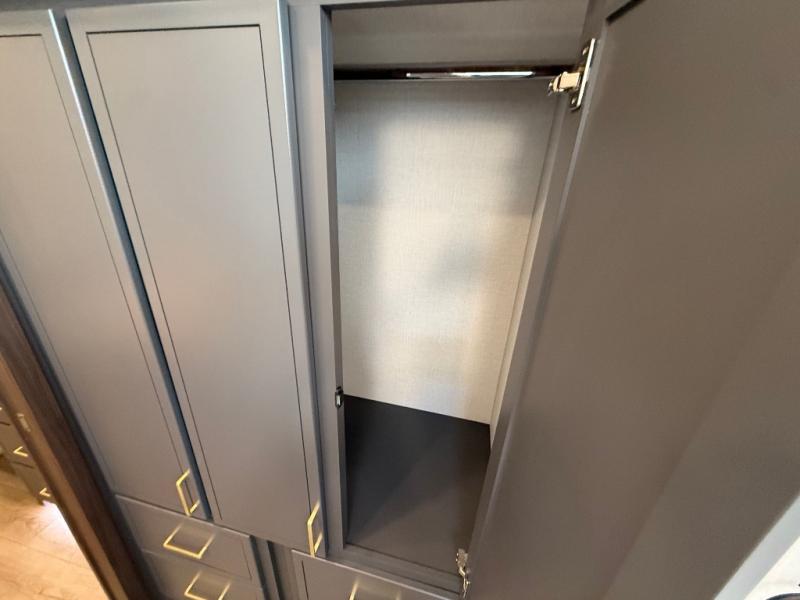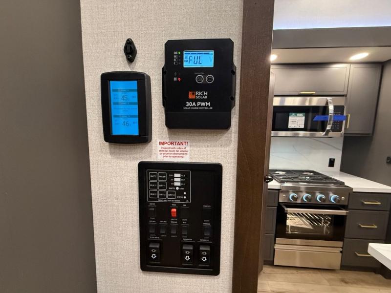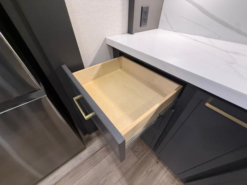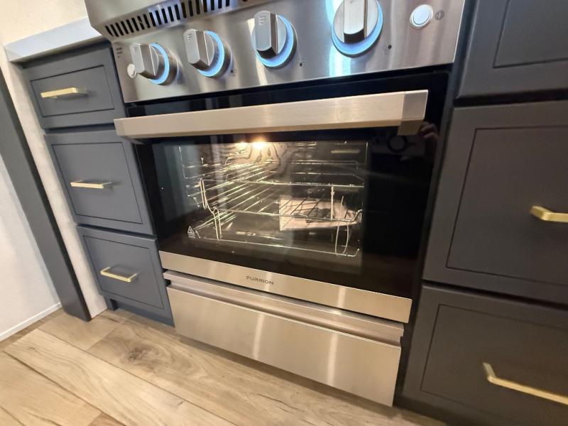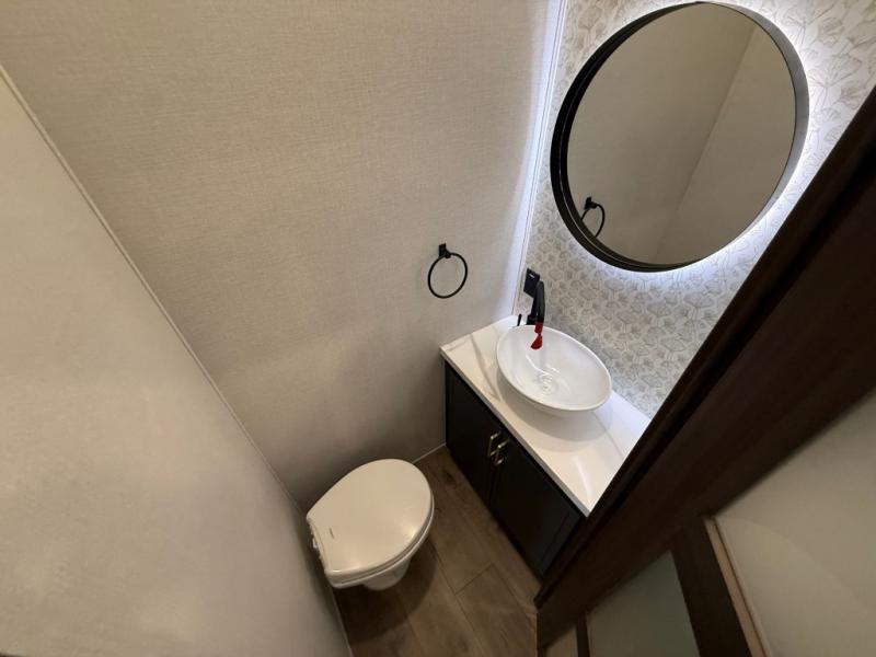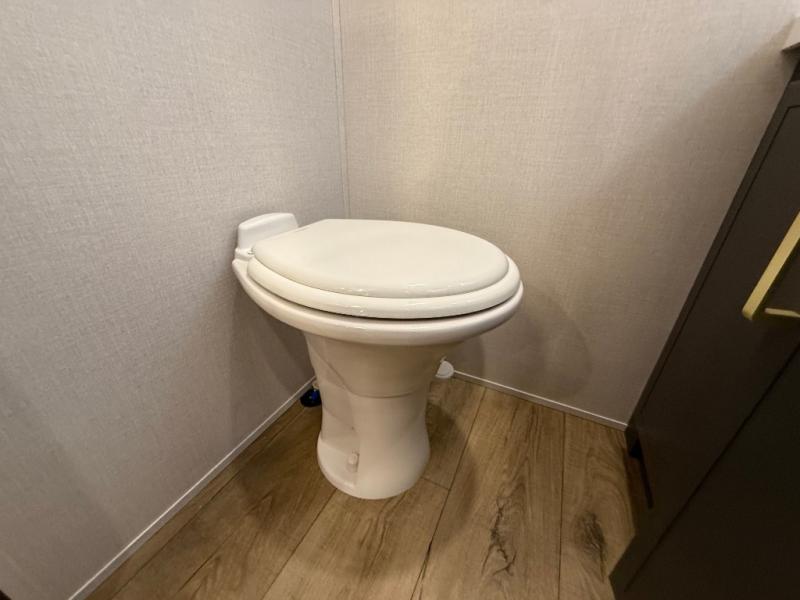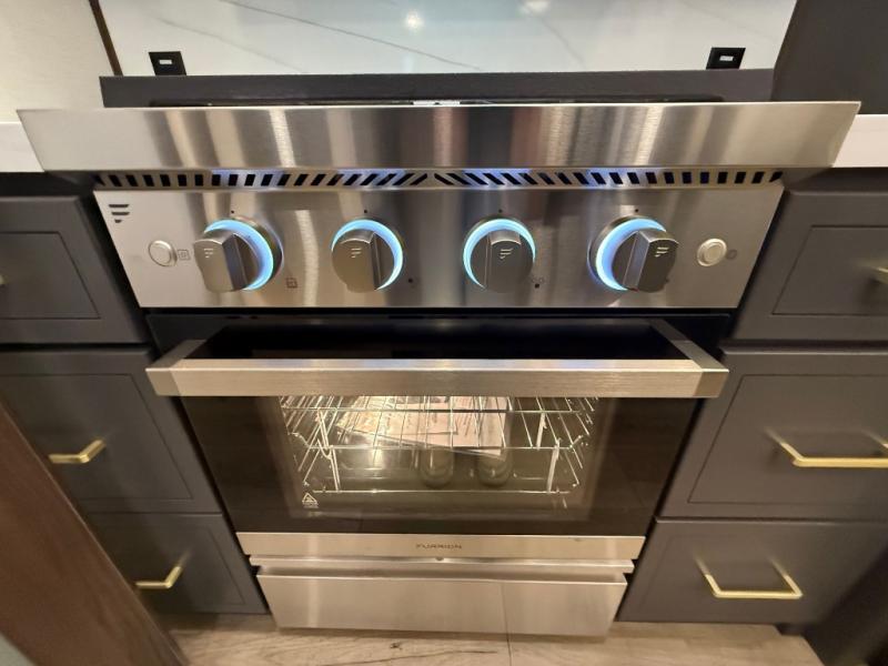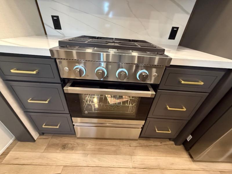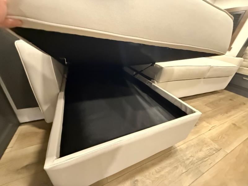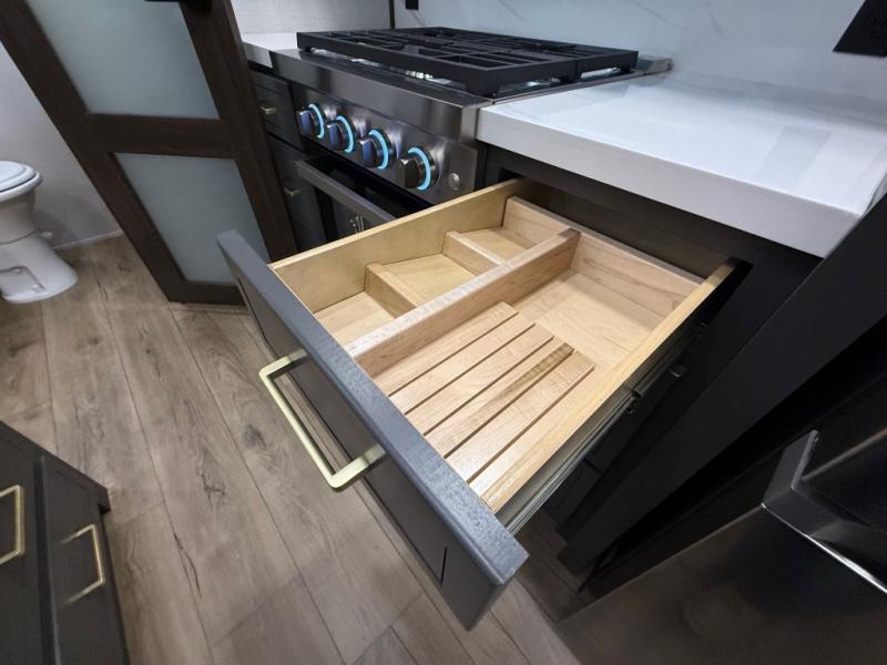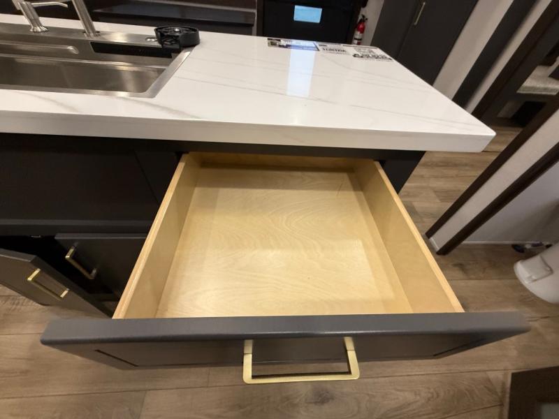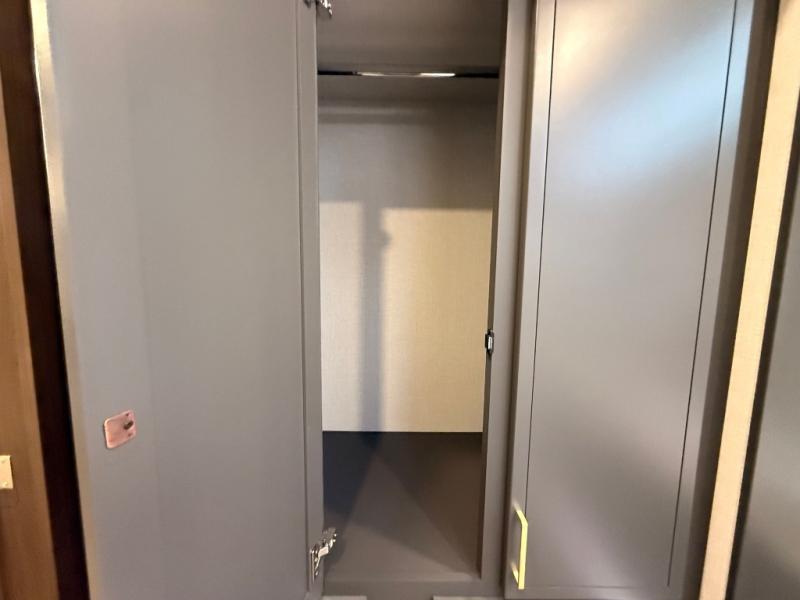 Unwind and refresh in this serene space of the rear bathroom, featuring dual sinks and a spacious linen closet for added convenience and storage. Drift off to sleep surrounded by peaceful surroundings in the private bedroom, complete with a plush king bed, an elegant dresser, and a stunning TV mounted above. The kitchen is a culinary haven, equipped with ample overhead cabinets, a convenient microwave, and a spacious fridge. The ample pantry and second pantry offer ample storage for your favorite ingredients and snacks. Plus, you can enjoy meals with loved ones at the table with swivel chairs! Also, the coat closet and half bath add a touch of practicality, making this fifth wheel perfect for everyday living or extended adventures. The front living room is a vibrant gathering space, featuring a comfortable sectional sofa and a cozy fireplace so you can snuggle up and enjoy quality time with family and friends while watching your favorite shows on the TV!
