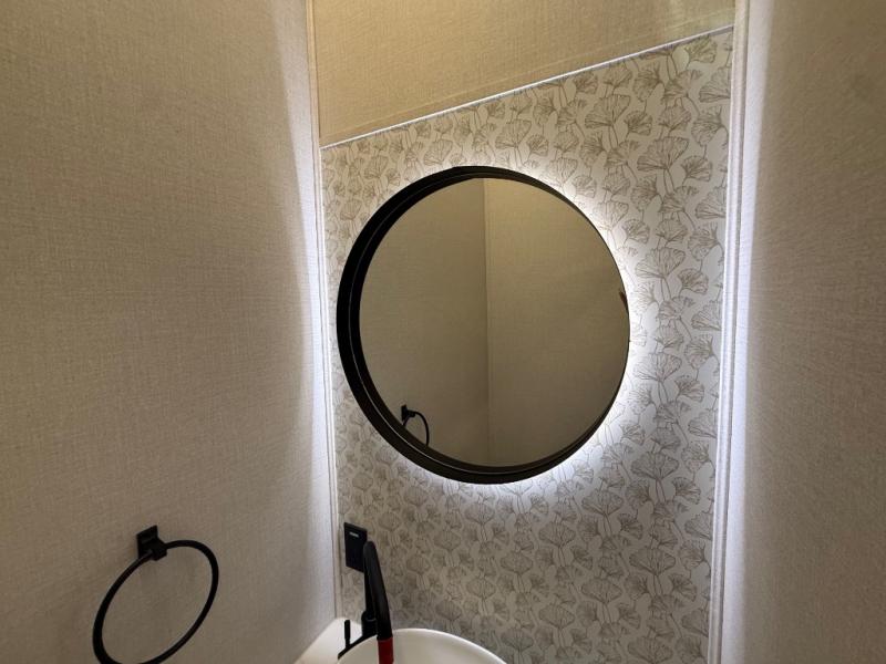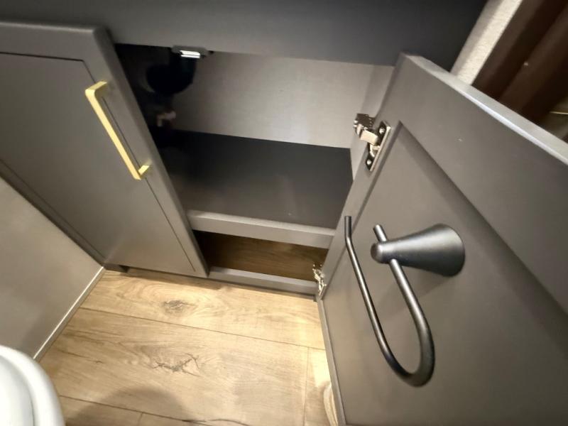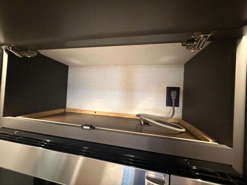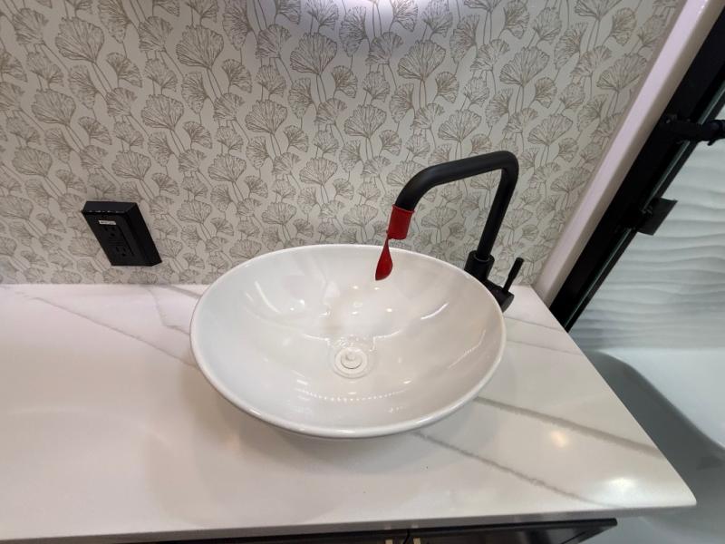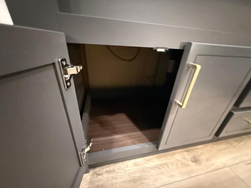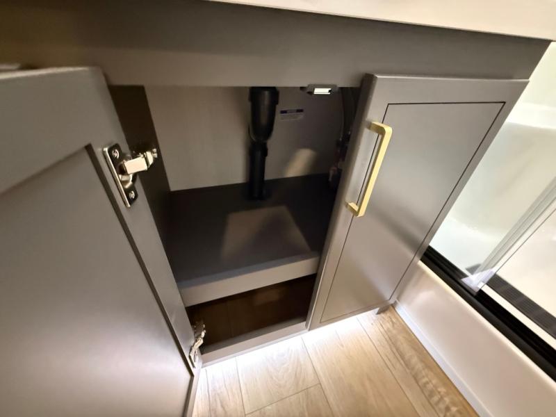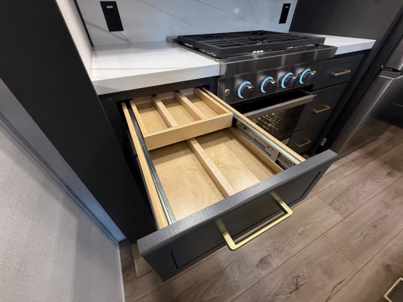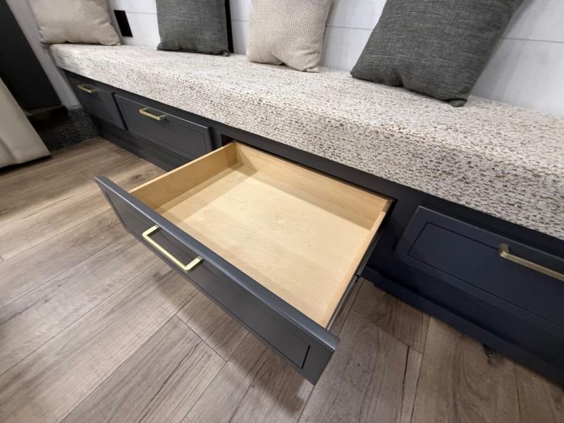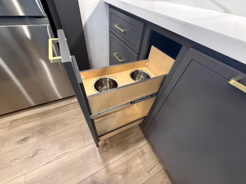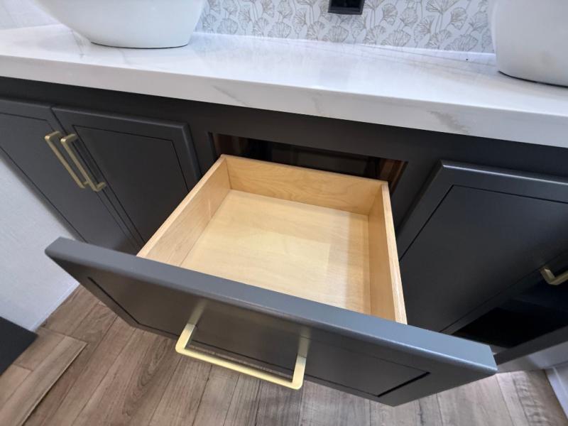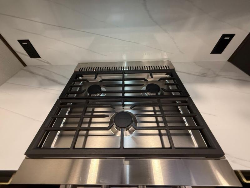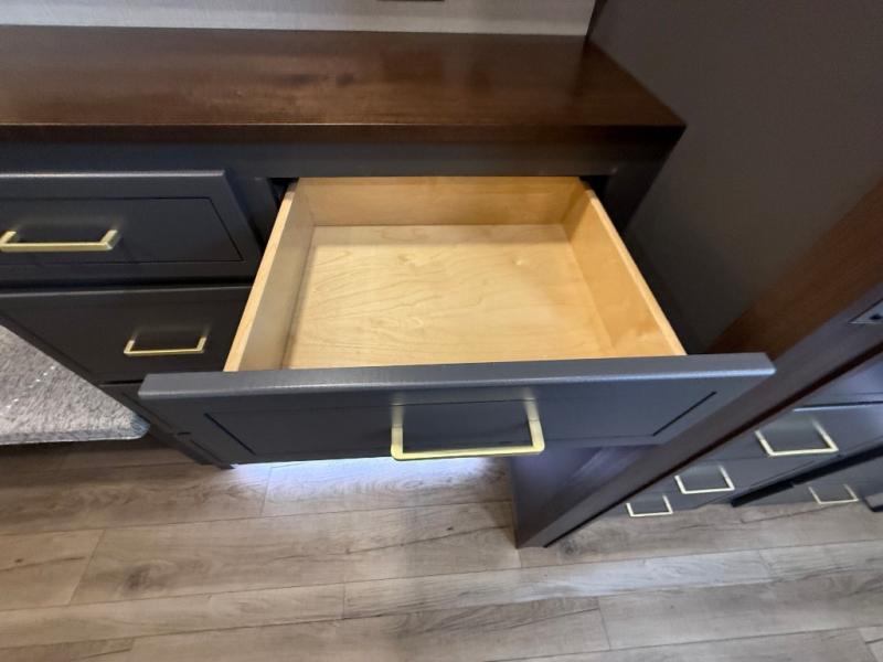 Unwind and refresh in this serene space of the rear bathroom, featuring dual sinks and a spacious linen closet for added convenience and storage. Drift off to sleep surrounded by peaceful surroundings in the private bedroom, complete with a plush king bed, an elegant dresser, and a stunning TV mounted above. The kitchen is a culinary haven, equipped with ample overhead cabinets, a convenient microwave, and a spacious fridge. The ample pantry and second pantry offer ample storage for your favorite ingredients and snacks. Plus, you can enjoy meals with loved ones at the table with swivel chairs! Also, the coat closet and half bath add a touch of practicality, making this fifth wheel perfect for everyday living or extended adventures. The front living room is a vibrant gathering space, featuring a comfortable sectional sofa and a cozy fireplace so you can snuggle up and enjoy quality time with family and friends while watching your favorite shows on the TV!