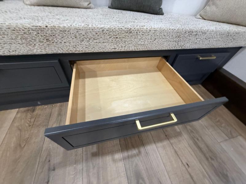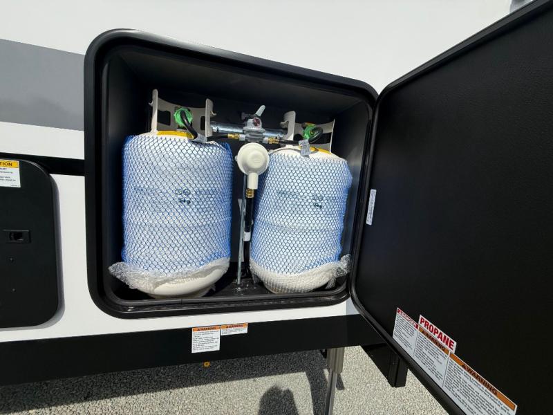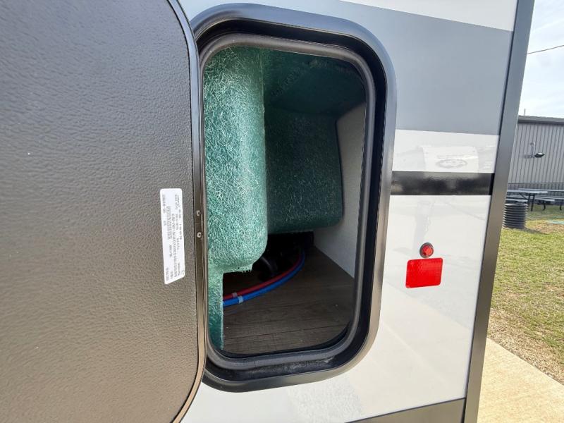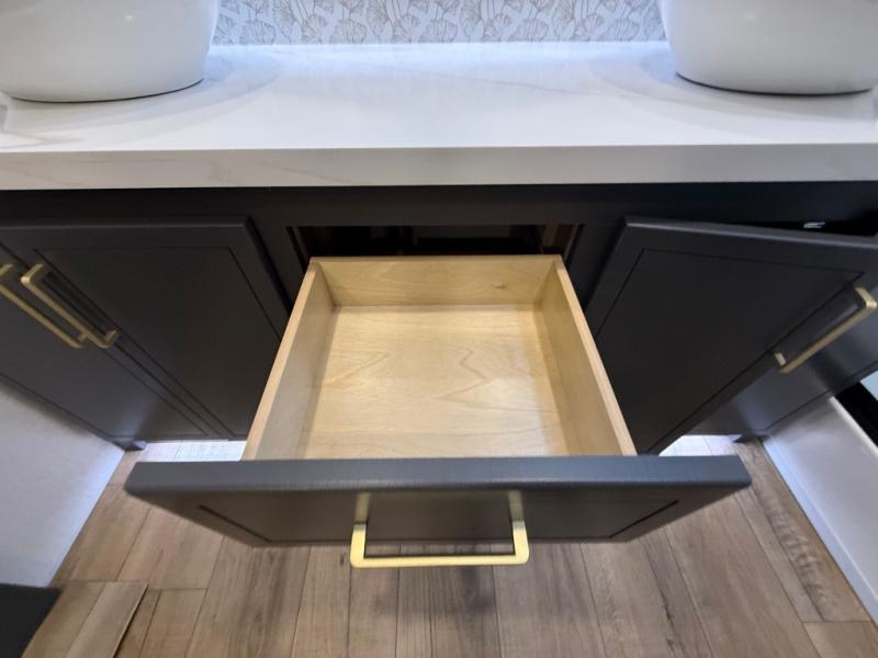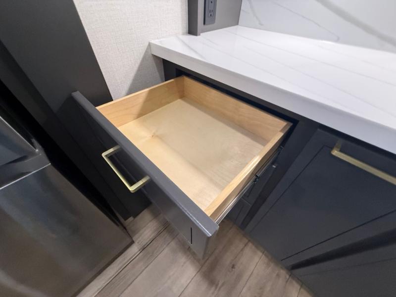 Hop on new adventures with these Forest River Cedar Creek Cottage Fifth Wheels! Each destination fifth wheel features a 101" wide body frame that provides a sturdy foundation for your adventures, while the AlphaPly TPO roof membrane offers superior durability and weather resistance. Plus, the 3M Bonded Sidewalls add an extra layer of protection and strength, and the hydraulic front jacks make setting up camp a breeze. In the luxurious interiors, the vinyl floor covering is easy to clean, and the Vixeinite flush floor slides in the kitchen and living area provide a seamless transition between the floor and the slide-outs. In addition, the 52" ceiling fan in the living room circulates air and adds to the spacious feel, and the kitchen island is a standout feature, boasting a solid surface counter, a flush-mount sink, and a stainless-steel design. You'll feel like you're cooking at home! Finally, the USB ports in the bathroom ensure you can keep your devices charged and within reach, even in the most convenient places.