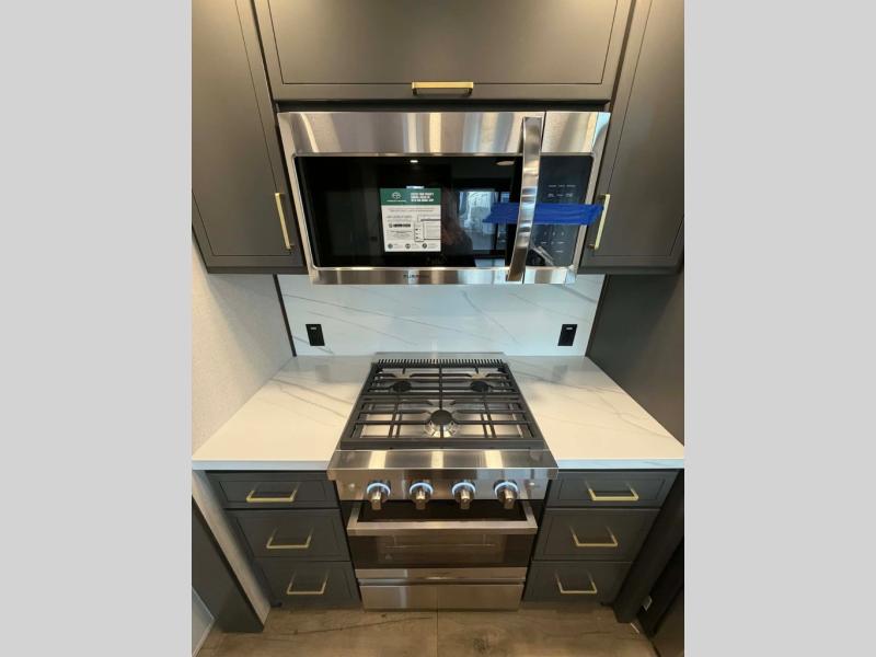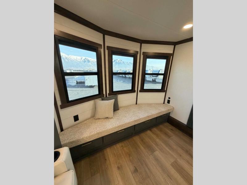 Unwind and refresh in this serene space of the rear bathroom, featuring dual sinks and a spacious linen closet for added convenience and storage. Drift off to sleep surrounded by peaceful surroundings in the private bedroom, complete with a plush king bed, an elegant dresser, and a stunning TV mounted above. The kitchen is a culinary haven, equipped with ample overhead cabinets, a convenient microwave, and a spacious fridge. The ample pantry and second pantry offer ample storage for your favorite ingredients and snacks. Plus, you can enjoy meals with loved ones at the table with swivel chairs! Also, the coat closet and half bath add a touch of practicality, making this fifth wheel perfect for everyday living or extended adventures. The front living room is a vibrant gathering space, featuring a comfortable sectional sofa and a cozy fireplace so you can snuggle up and enjoy quality time with family and friends while watching your favorite shows on the TV!
