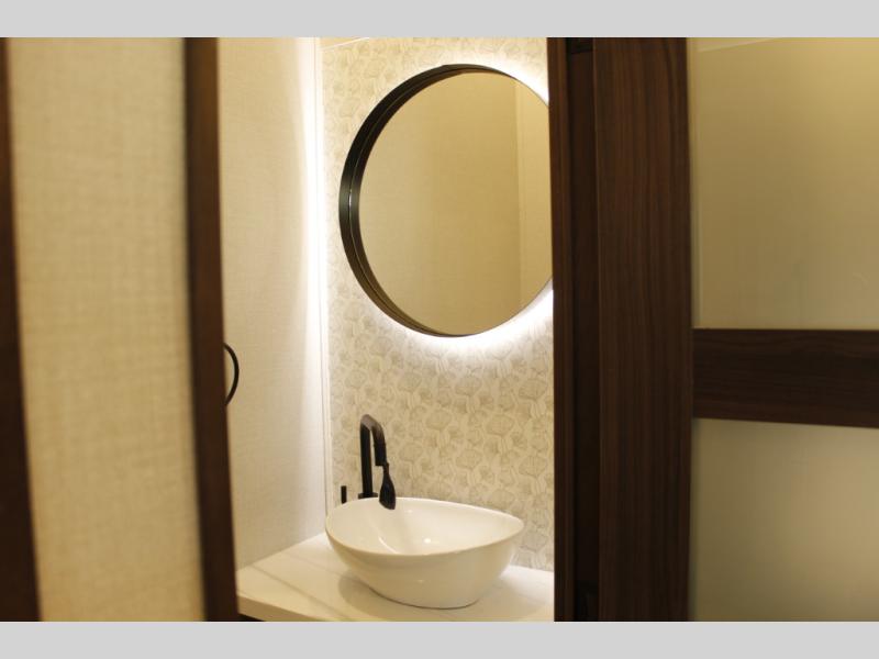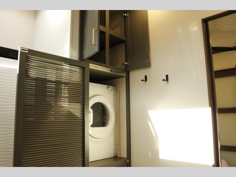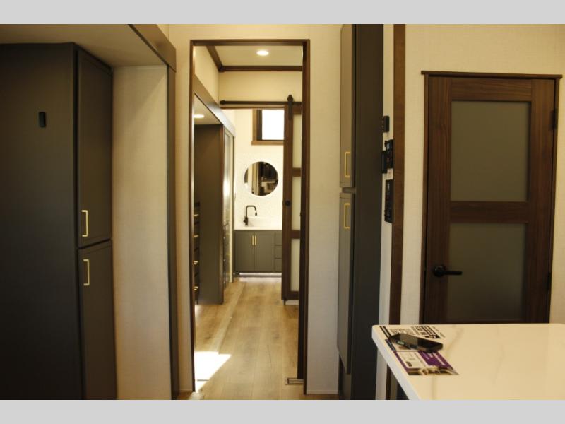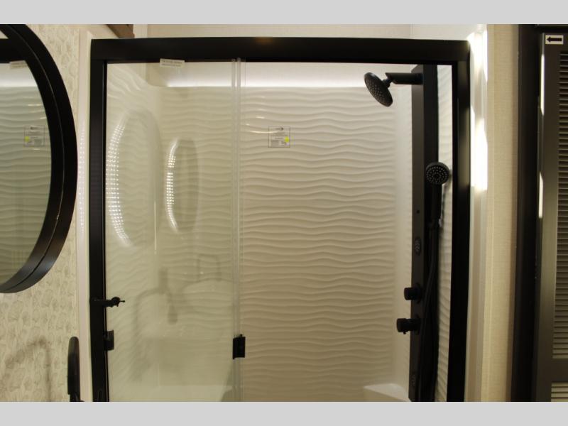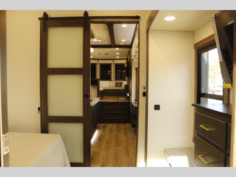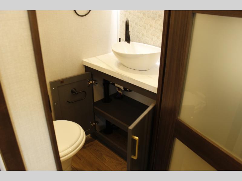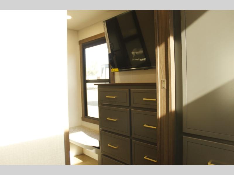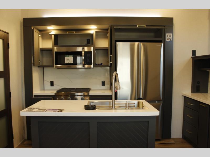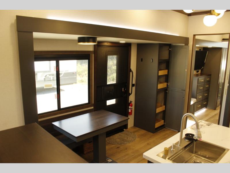 Unwind and refresh in this serene space of the rear bathroom, featuring dual sinks and a spacious linen closet for added convenience and storage. Drift off to sleep surrounded by peaceful surroundings in the private bedroom, complete with a plush king bed, an elegant dresser, and a stunning TV mounted above. The kitchen is a culinary haven, equipped with ample overhead cabinets, a convenient microwave, and a spacious fridge. The ample pantry and second pantry offer ample storage for your favorite ingredients and snacks. Plus, you can enjoy meals with loved ones at the table with swivel chairs! Also, the coat closet and half bath add a touch of practicality, making this fifth wheel perfect for everyday living or extended adventures. The front living room is a vibrant gathering space, featuring a comfortable sectional sofa and a cozy fireplace so you can snuggle up and enjoy quality time with family and friends while watching your favorite shows on the TV!