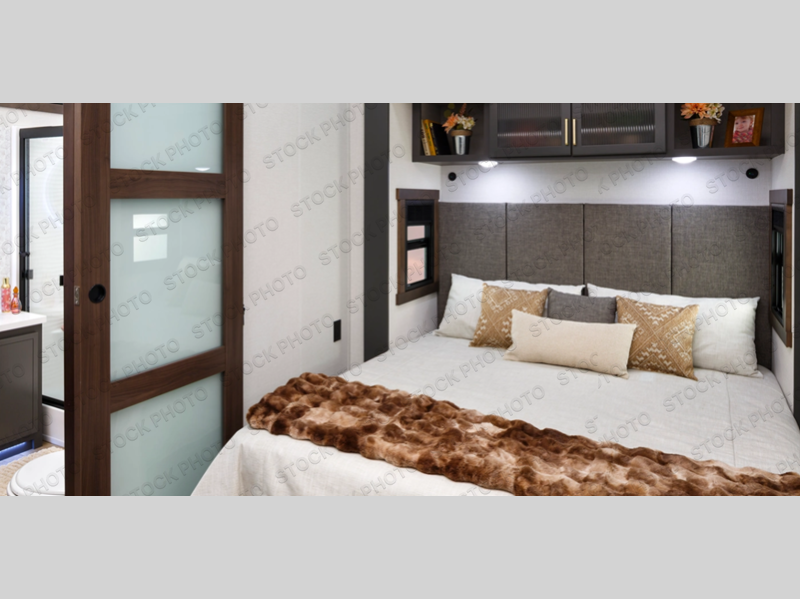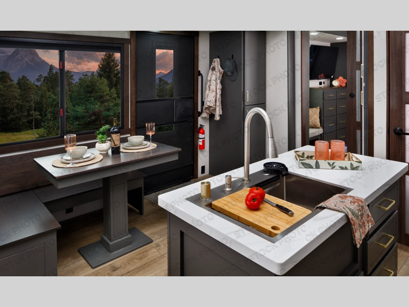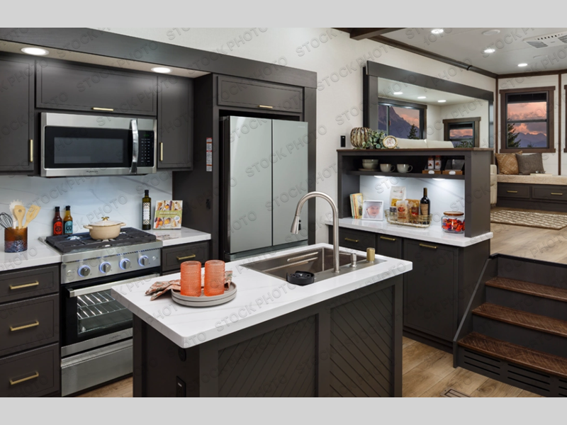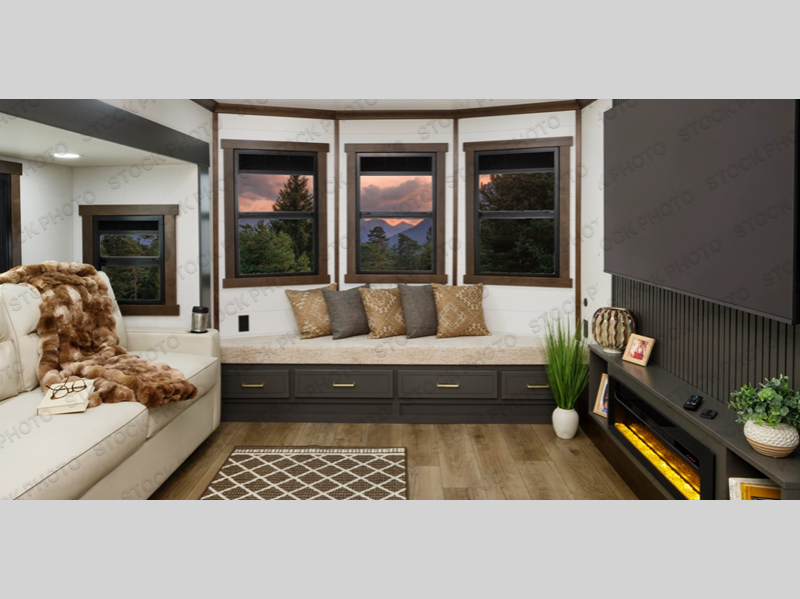 Unwind and refresh in this serene space of the rear bathroom, featuring dual sinks and a spacious linen closet for added convenience and storage. Drift off to sleep surrounded by peaceful surroundings in the private bedroom, complete with a plush king bed, an elegant dresser, and a stunning TV mounted above. The kitchen is a culinary haven, equipped with ample overhead cabinets, a convenient microwave, and a spacious refrigerator. The pantry and cabinets offer ample storage for your favorite ingredients and snacks. Plus, you can enjoy meals with loved ones at the table with swivel chairs! Also, the coat closet and half bath add a touch of practicality, making this fifth wheel perfect for everyday living or extended adventures. The front living room is a vibrant gathering space, featuring a comfortable sectional sofa and a cozy fireplace so you can snuggle up and enjoy quality time with family and friends while watching your favorite shows on the TV!