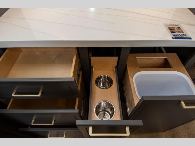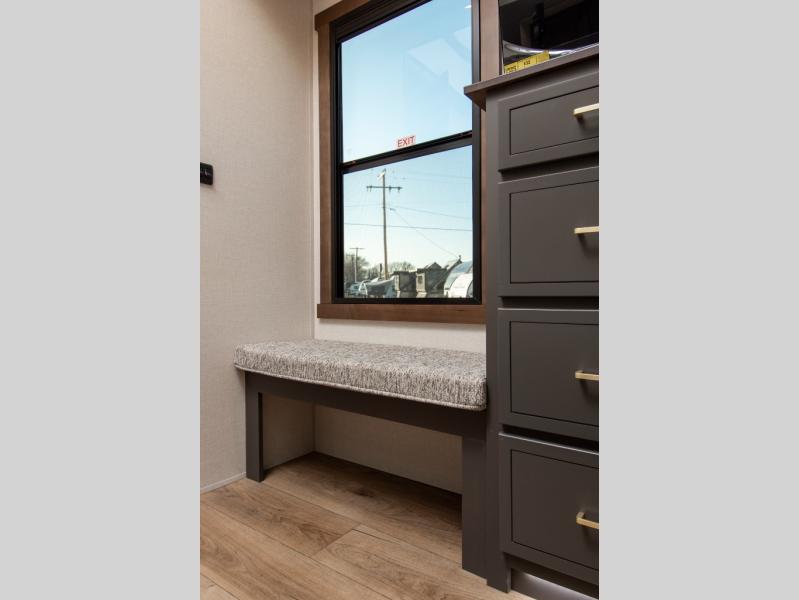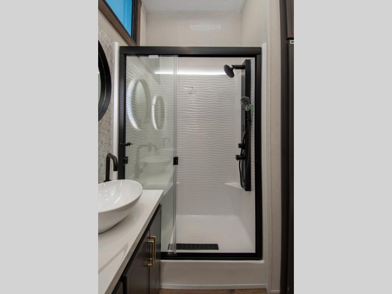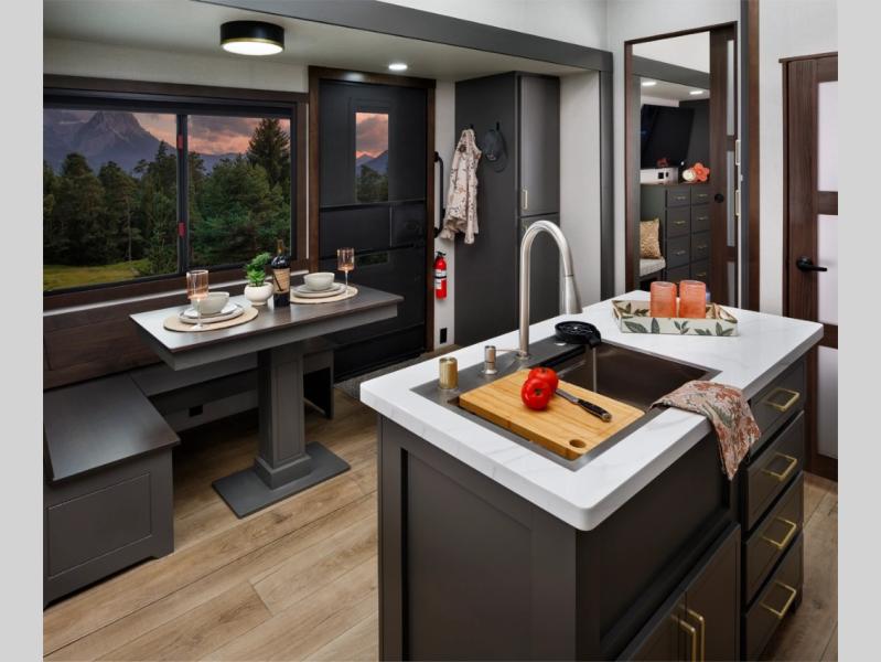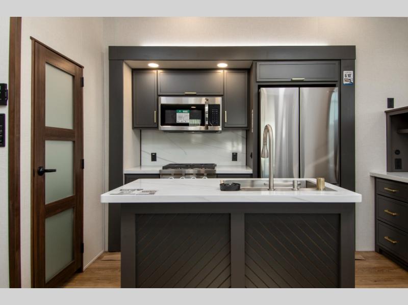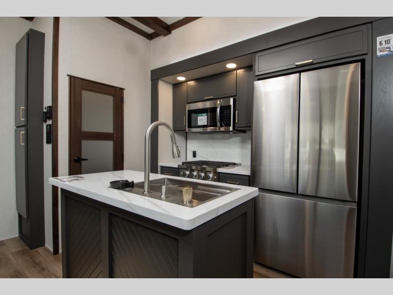 Hop on new adventures with these Forest River Cedar Creek Cottage Fifth Wheels! Each destination fifth wheel features a 101" wide body frame that provides a sturdy foundation for your adventures, while the AlphaPly TPO roof membrane offers superior durability and weather resistance. Plus, the 3M Bonded Sidewalls add an extra layer of protection and strength, and the hydraulic front jacks make setting up camp a breeze. In the luxurious interiors, the vinyl floor covering is easy to clean, and the Vixeinite flush floor slides in the kitchen and living area provide a seamless transition between the floor and the slide-outs. In addition, the 52" ceiling fan in the living room circulates air and adds to the spacious feel, and the kitchen island is a standout feature, boasting a solid surface counter, a flush-mount sink, and a stainless-steel design. You'll feel like you're cooking at home! Finally, the USB ports in the bathroom ensure you can keep your devices charged and within reach, even in the most convenient places.