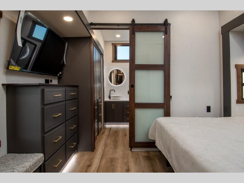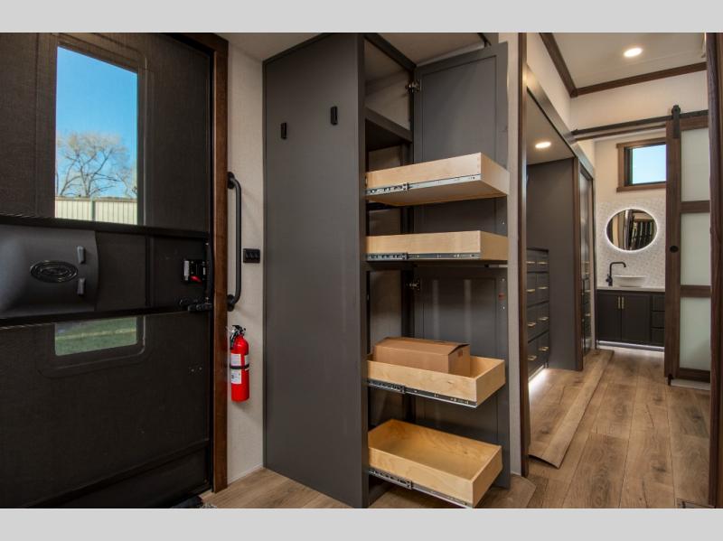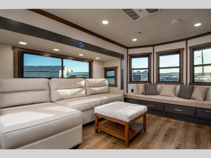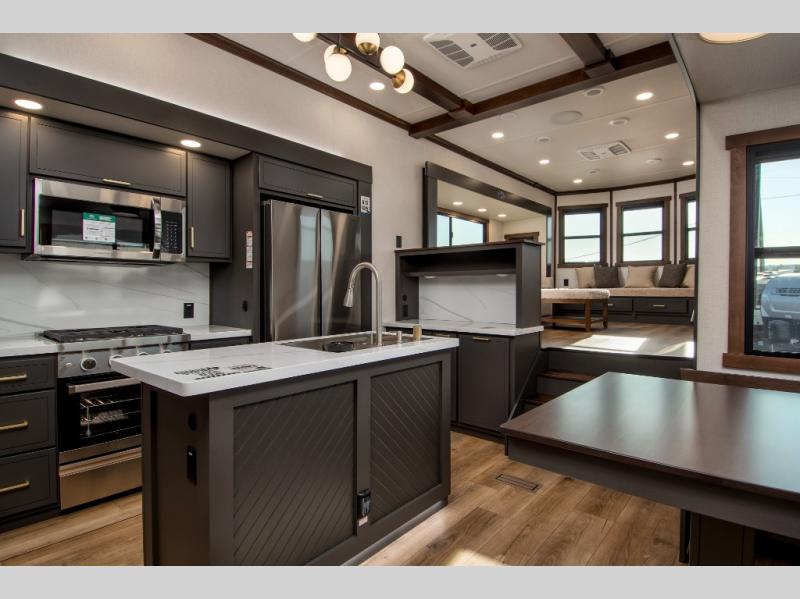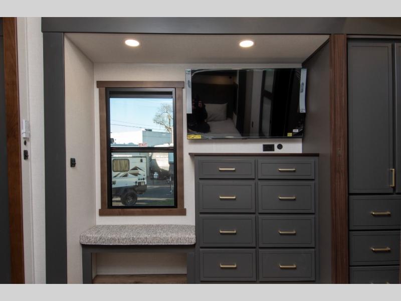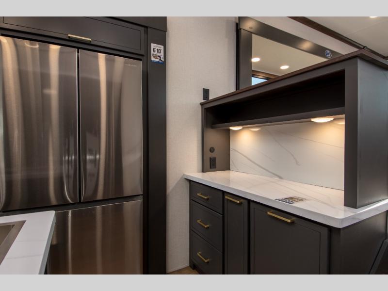 Unwind and refresh in this serene space of the rear bathroom, featuring dual sinks and a spacious linen closet for added convenience and storage. Drift off to sleep surrounded by peaceful surroundings in the private bedroom, complete with a plush king bed, an elegant dresser, and a stunning TV mounted above. The kitchen is a culinary haven, equipped with ample overhead cabinets, a convenient microwave, and a spacious refrigerator. The pantry and cabinets offer ample storage for your favorite ingredients and snacks. Plus, you can enjoy meals with loved ones at the table with swivel chairs! Also, the coat closet and half bath add a touch of practicality, making this fifth wheel perfect for everyday living or extended adventures. The front living room is a vibrant gathering space, featuring a comfortable sectional sofa and a cozy fireplace so you can snuggle up and enjoy quality time with family and friends while watching your favorite shows on the TV!