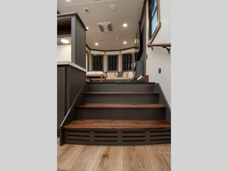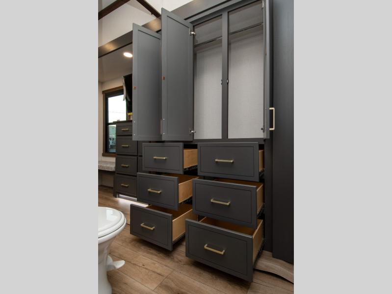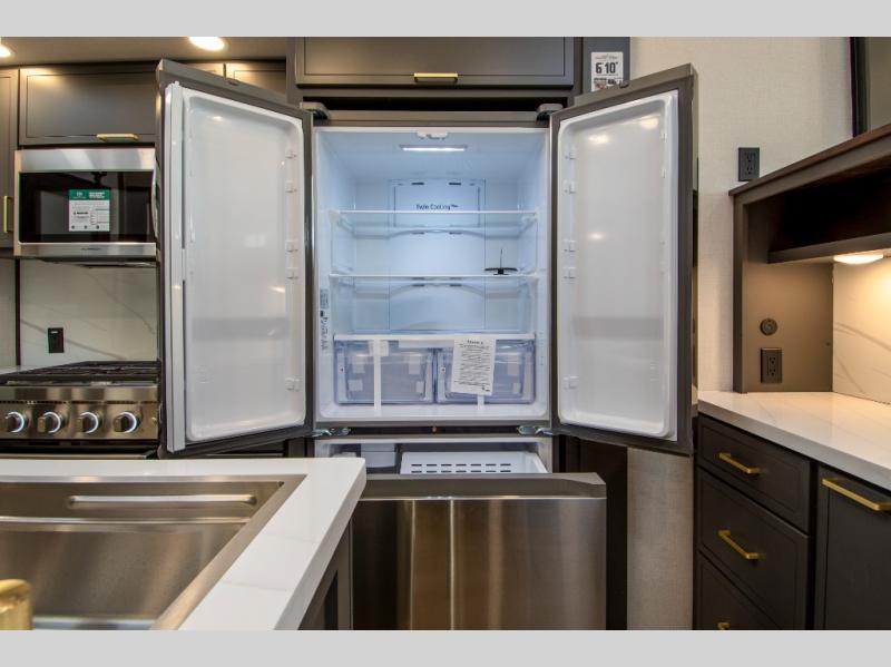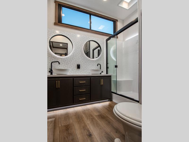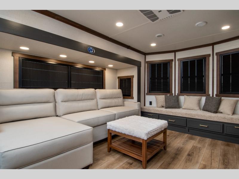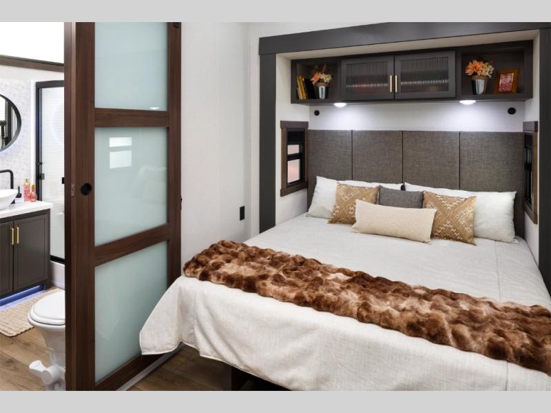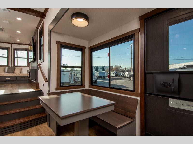 Unwind and refresh in this serene space of the rear bathroom, featuring dual sinks and a spacious linen closet for added convenience and storage. Drift off to sleep surrounded by peaceful surroundings in the private bedroom, complete with a plush king bed, an elegant dresser, and a stunning TV mounted above. The kitchen is a culinary haven, equipped with ample overhead cabinets, a convenient microwave, and a spacious refrigerator. The pantry and cabinets offer ample storage for your favorite ingredients and snacks. Plus, you can enjoy meals with loved ones at the table with swivel chairs! Also, the coat closet and half bath add a touch of practicality, making this fifth wheel perfect for everyday living or extended adventures. The front living room is a vibrant gathering space, featuring a comfortable sectional sofa and a cozy fireplace so you can snuggle up and enjoy quality time with family and friends while watching your favorite shows on the TV!