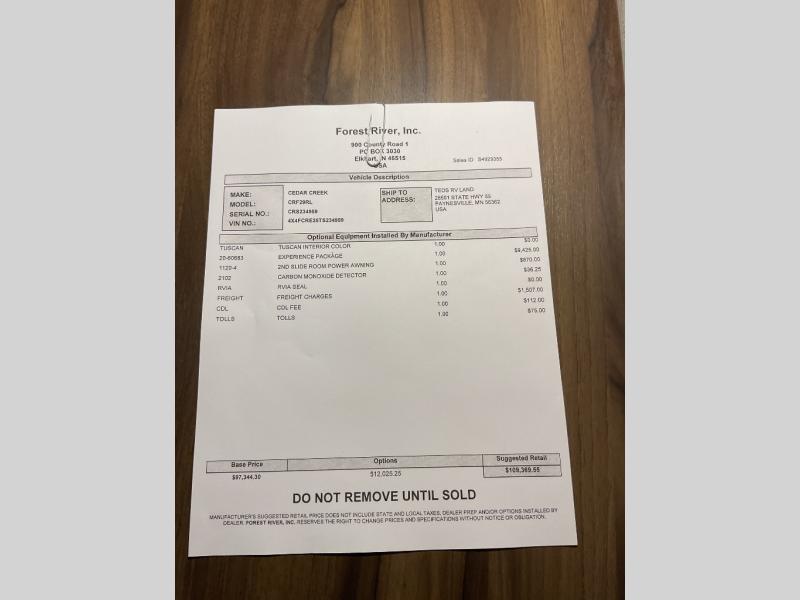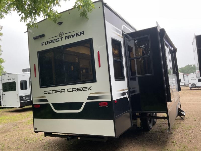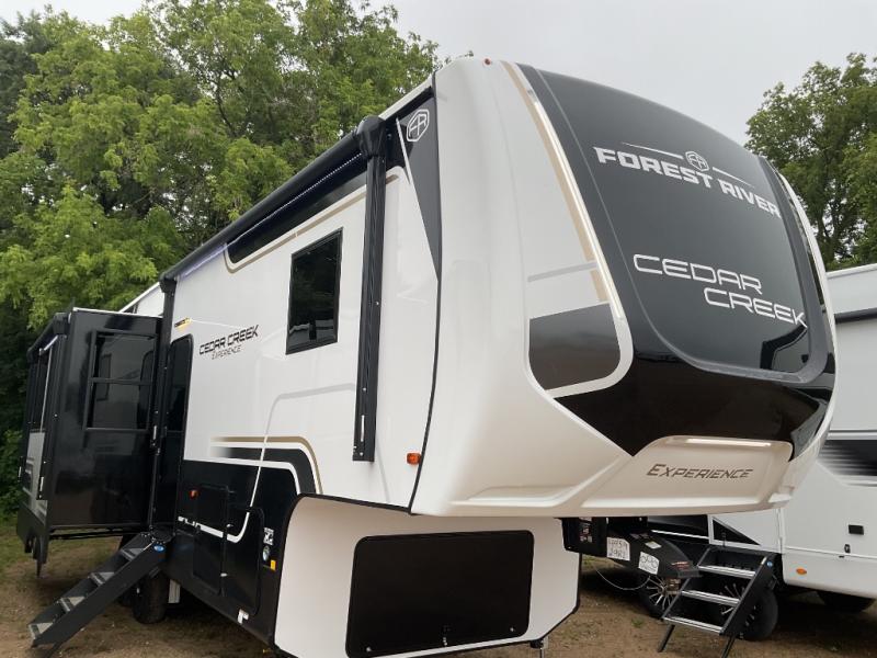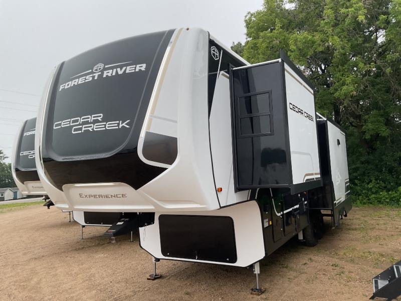 With any Cedar Creek Experience fifth wheel by Forest River, you will bet met with luxury features both inside and out! The True Gelcoat exterior is the best of the best in exteriors and the 3M bonded sidewalls will hold up over years of use. There is also a new 101'' wide-body frame, a Road Warrior suspension, plus a TST tire pressure monitoring system to make towing that much easier. You will find a hidden front storage compartment, along with a 4' x 6' ABS, ribbed, removable underbelly panels, and 6-point hydraulic leveling system, plus many more exterior conveniences. The interior will have you feeling like you haven't left home with vinyl floor coverings, power theater seating with USB ports, a cozy fireplace, vinyl floor covering and the list of comforts goes on! Each model is also pre-wired for satellite to the roof, and you're sure to never go bored with a Smart TV in the bedroom!