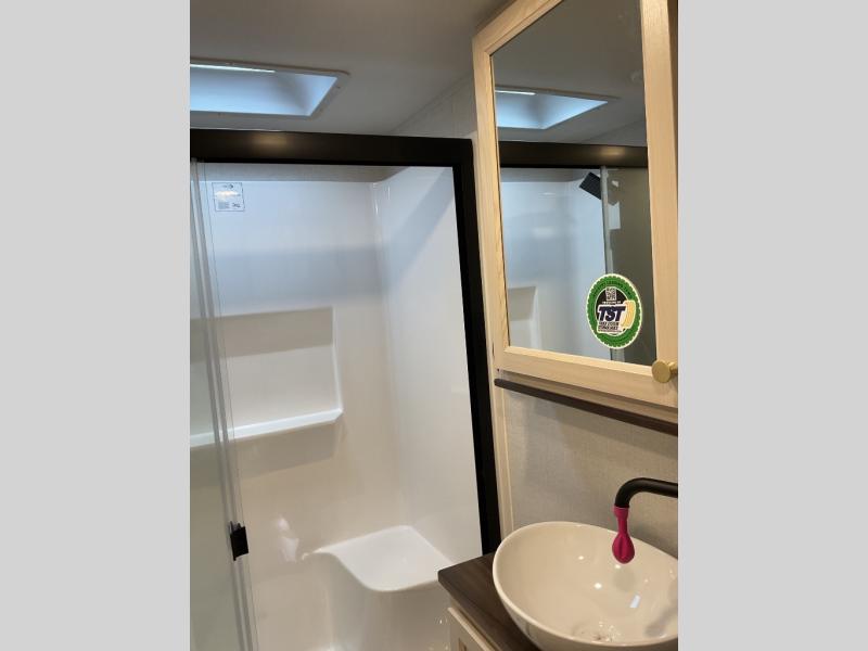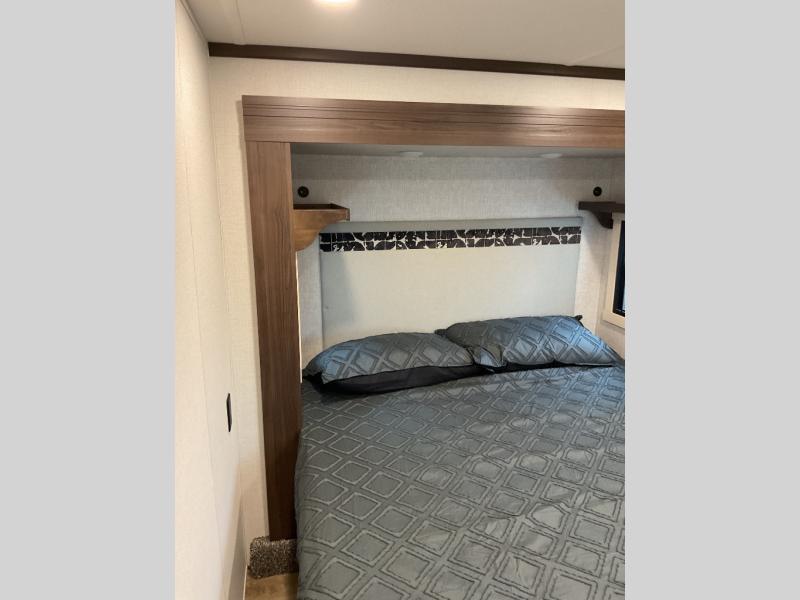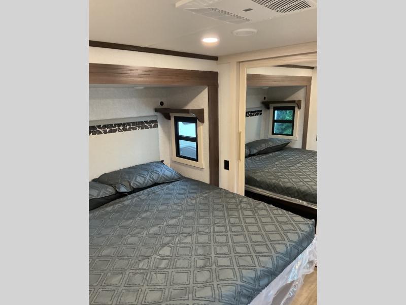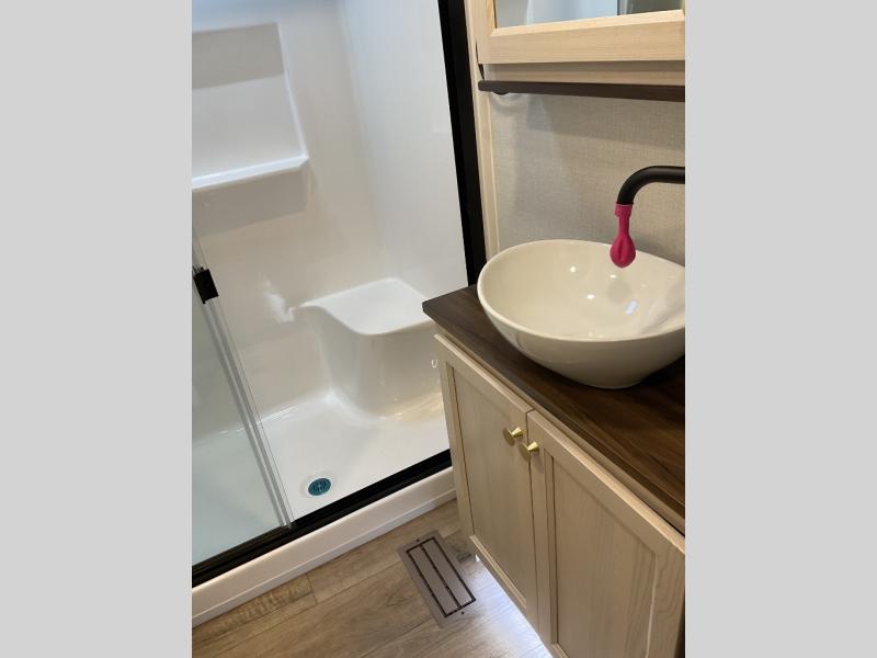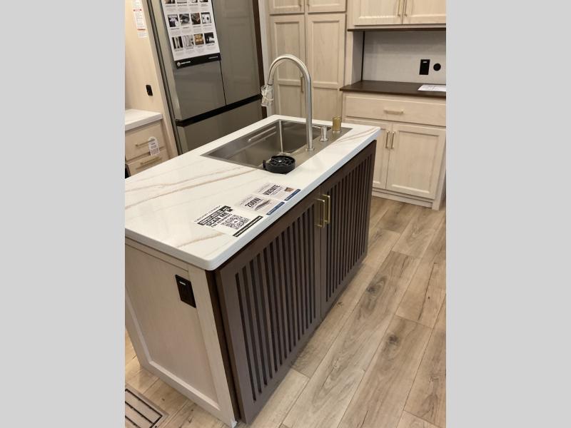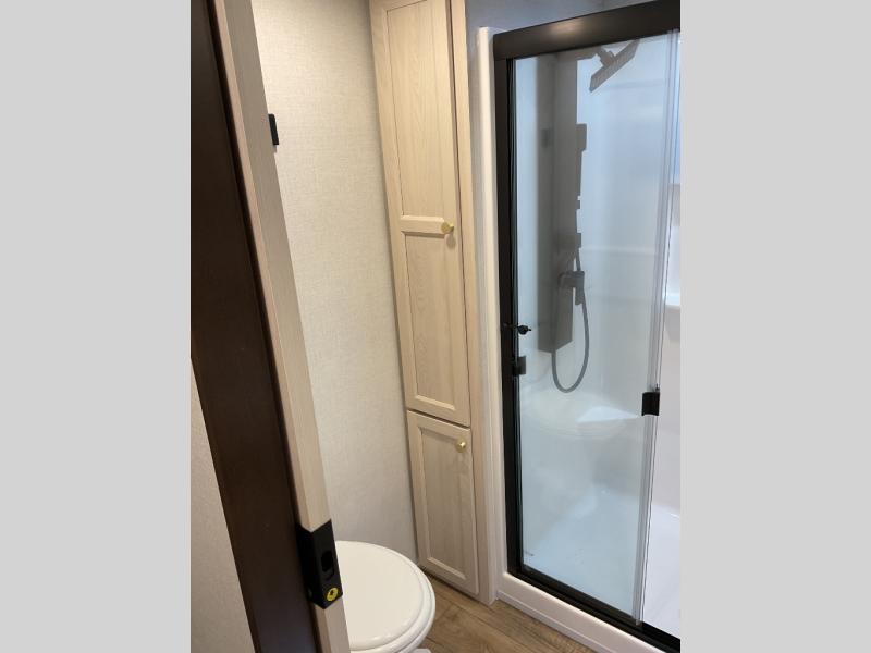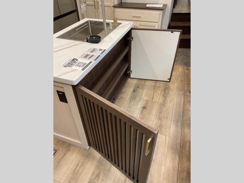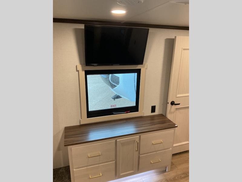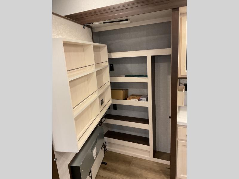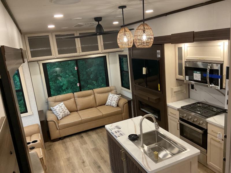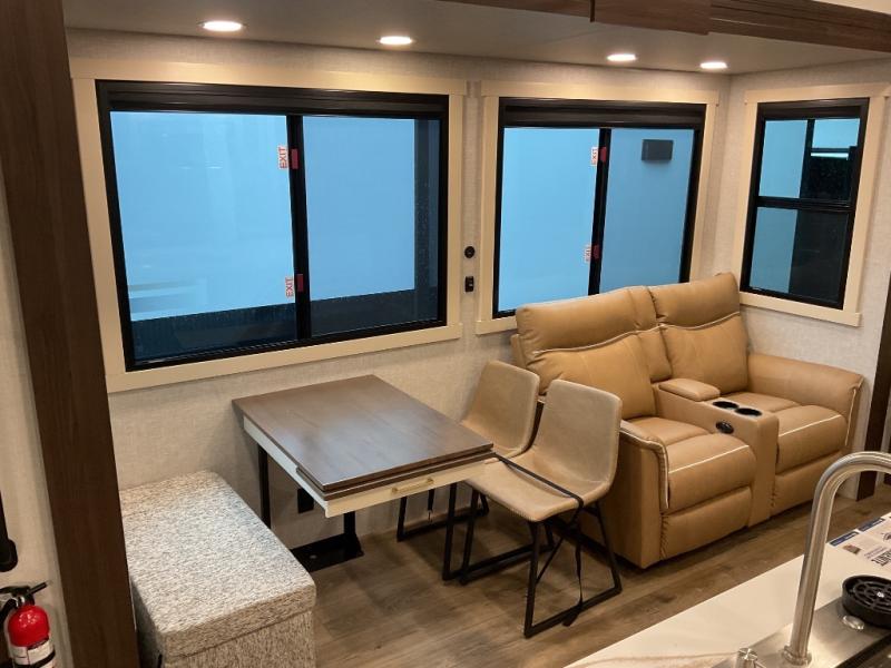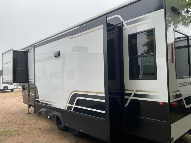 You will love this Cedar Creek Experience fifth wheel! The front bedroom is spacious with a king bed and a wardrobe that keeps on going, with room for hanging garments, shelves, and washer/dryer prep. There's also a standalone dresser with a TV above so you can watch some shows before bed. The bathroom also offers space efficiency with a sliding glass door, and the roomy shower even has a seat for your convenience while bathing. The rear of this unit feels wide open with a lovely living area and kitchen. The kitchen rivals the one at home, with a three-burner cooktop, microwave, and 18 cu. ft. 12V refrigerator with an ice maker. And check out the Murphy pantry that is hidden behind the entertainment center! You'll have tons of storage space with overhead cabinets and a pantry. The kitchen island with a spacious sink is the perfect final touch. After you eat you can relax and watch TV on the power theater seats or the hide-a-bed sofa. There is also a wall mounted dining table and extension with an ottoman for more seating space!
